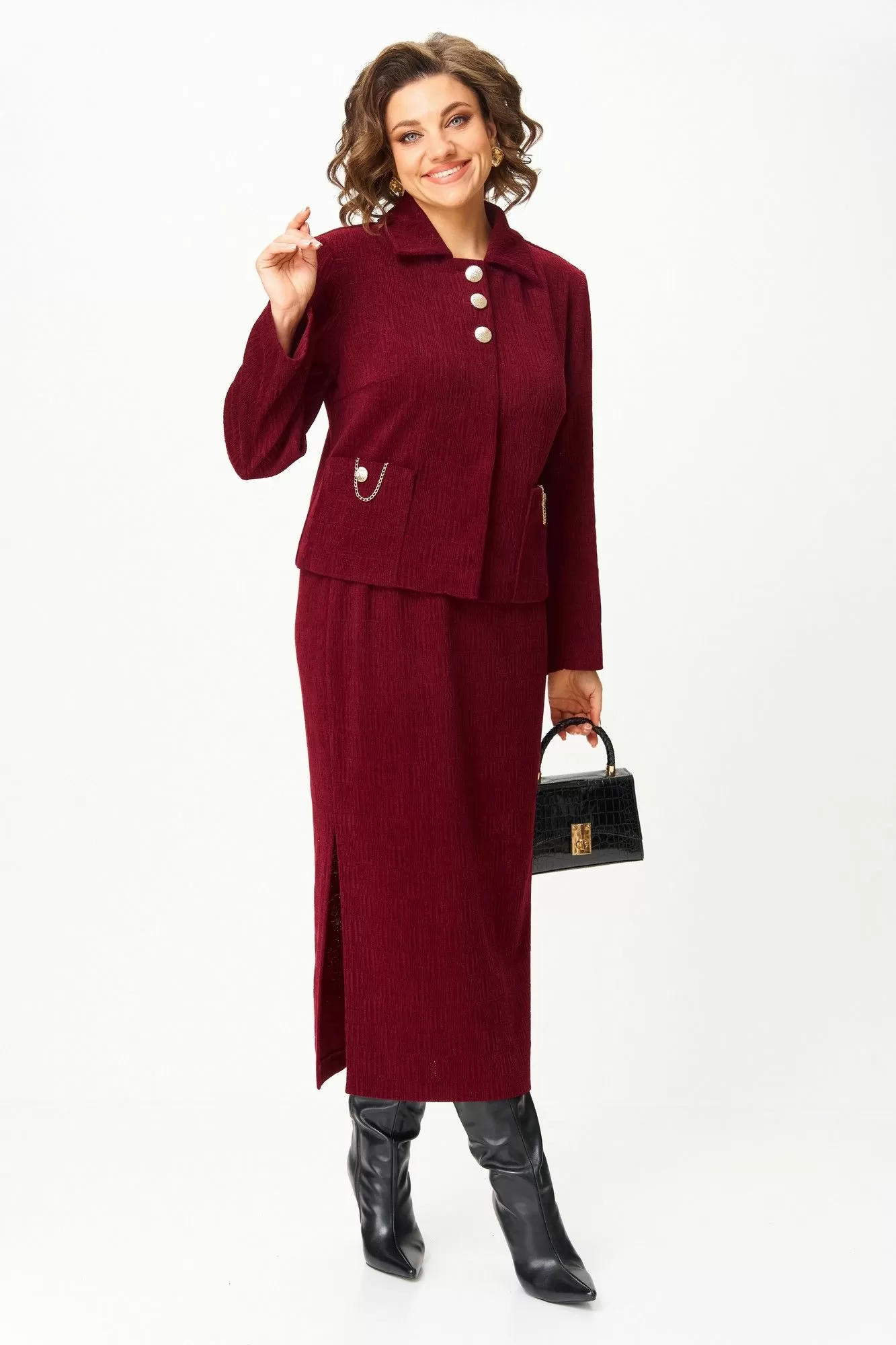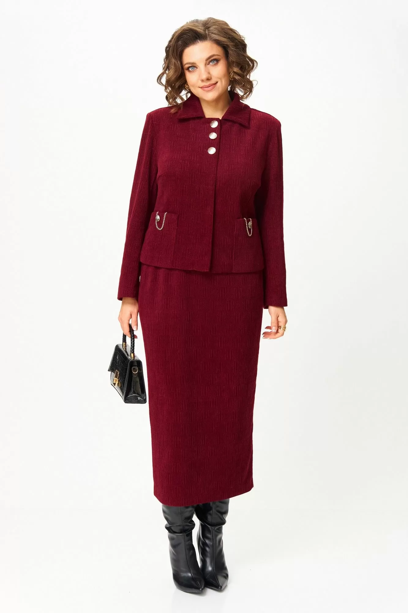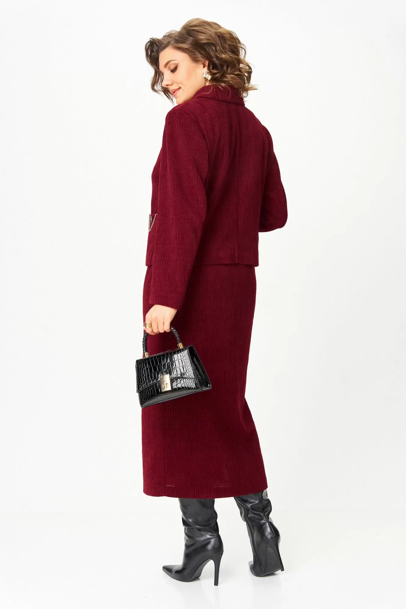 Трикотажный женский костюм из структурной ткани. Жакет прямого силуэта переду центральная застежка на 3-и петли и пуговицы и потайные кнопки. По переду накладные карманы декорированные цепью и застежкой на петлю и пуговицу. Спинка со средним швом без особенностей. Рукава втачные двухшовные. Юбка прямая длиной миди без подкладки. По правому боковому шву разрез. Для максимально комфортной посадки по поясу эластичная резинка.