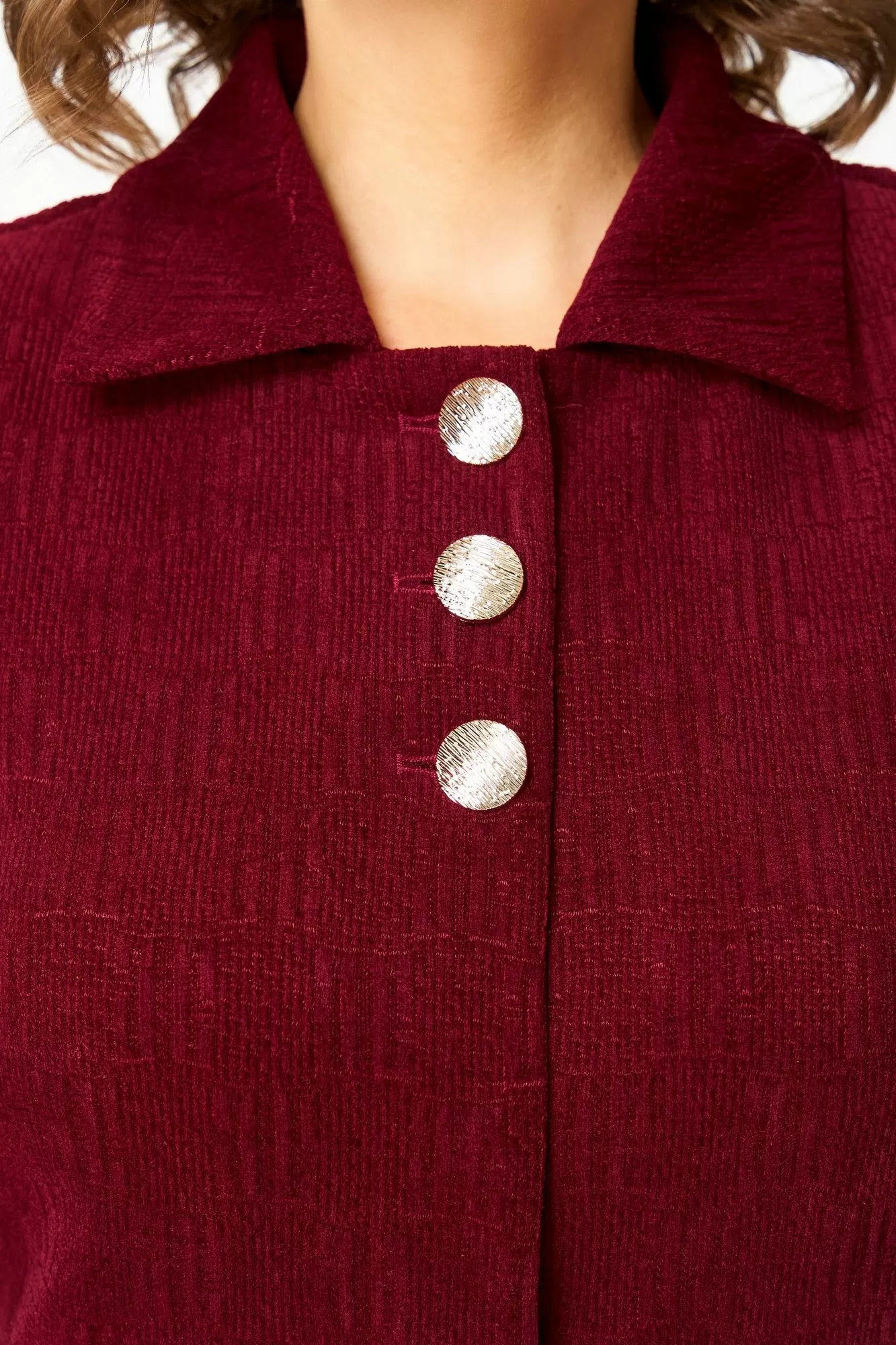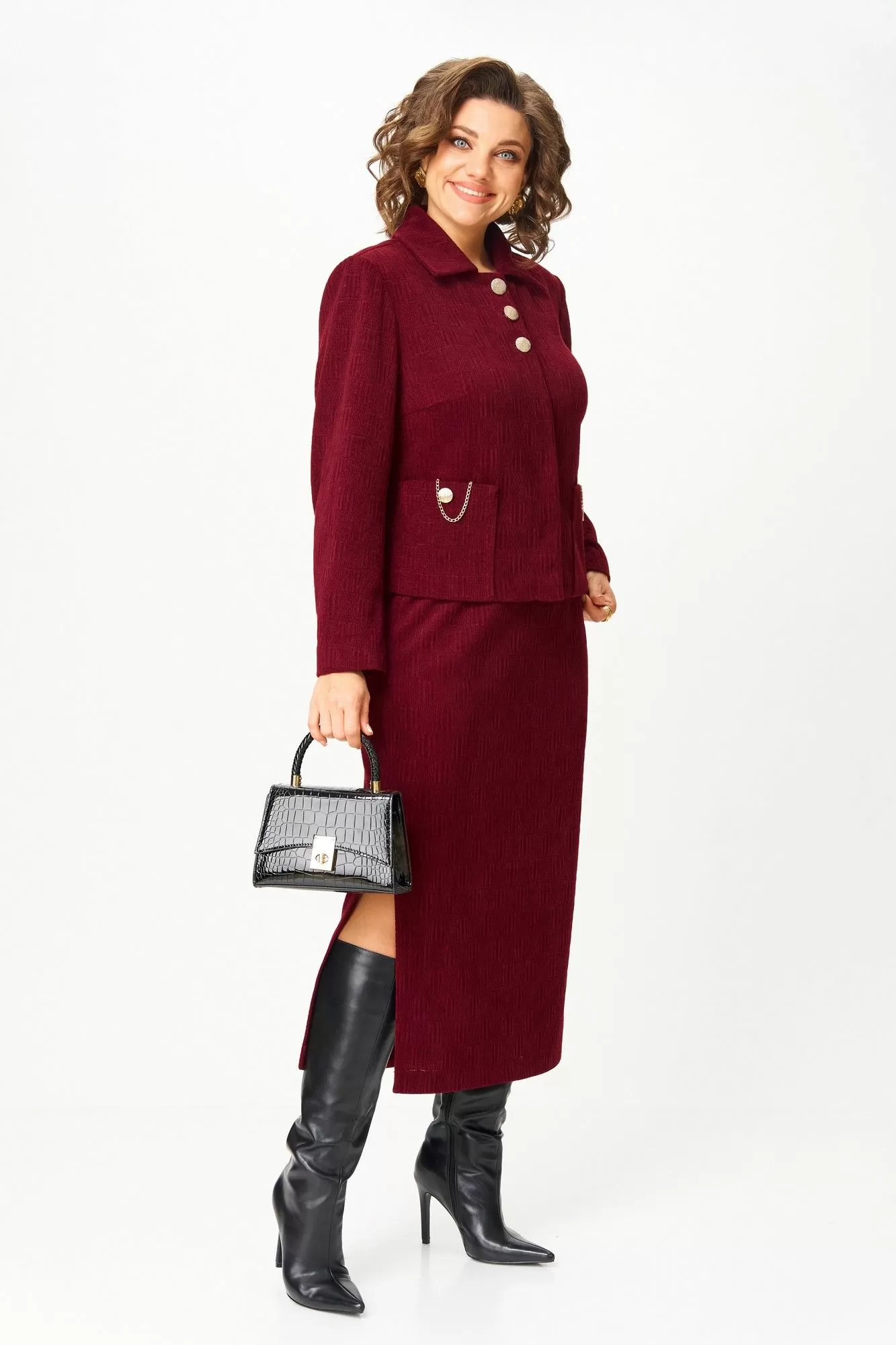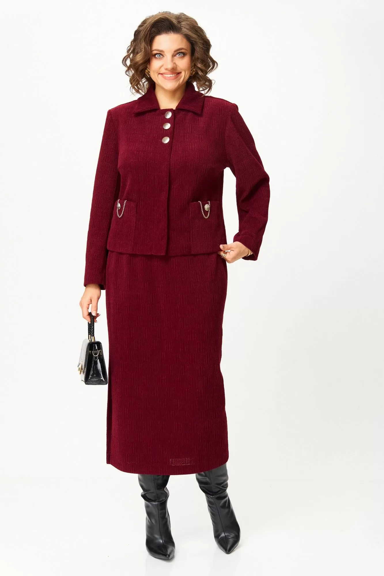 Трикотажный женский костюм из структурной ткани. Жакет прямого силуэта переду центральная застежка на 3-и петли и пуговицы и потайные кнопки. По переду накладные карманы декорированные цепью и застежкой на петлю и пуговицу. Спинка со средним швом без особенностей. Рукава втачные двухшовные. Юбка прямая длиной миди без подкладки. По правому боковому шву разрез. Для максимально комфортной посадки по поясу эластичная резинка.