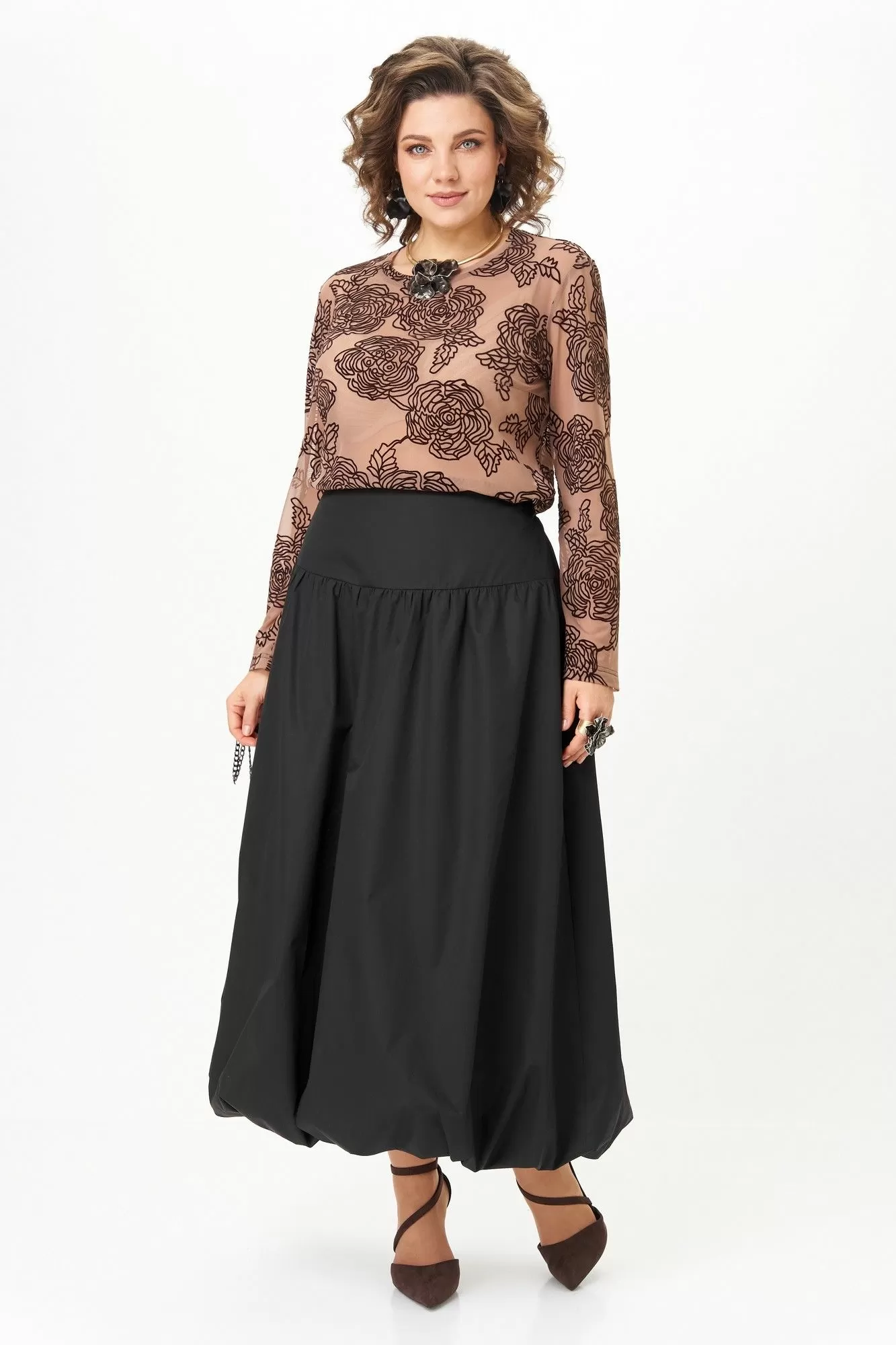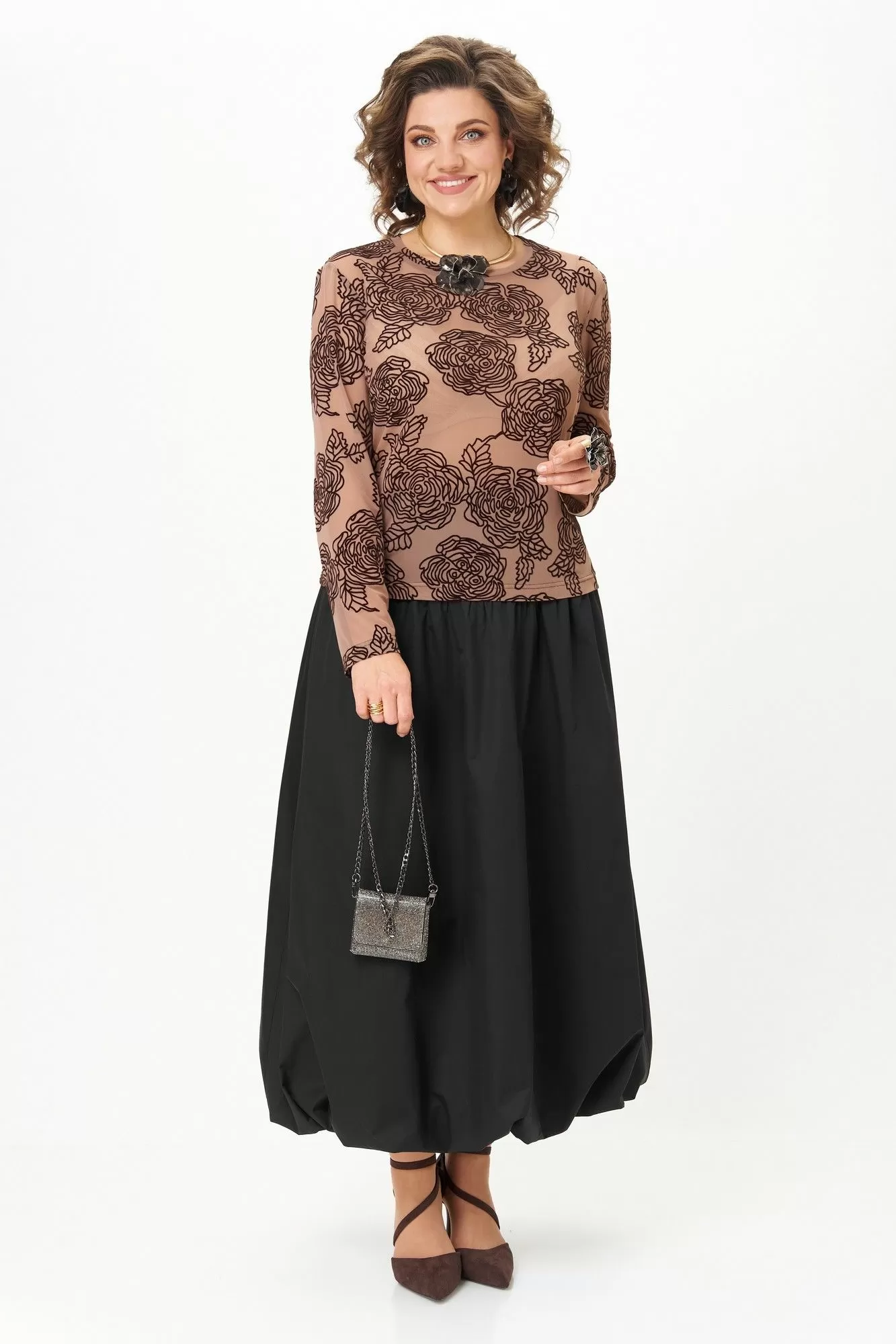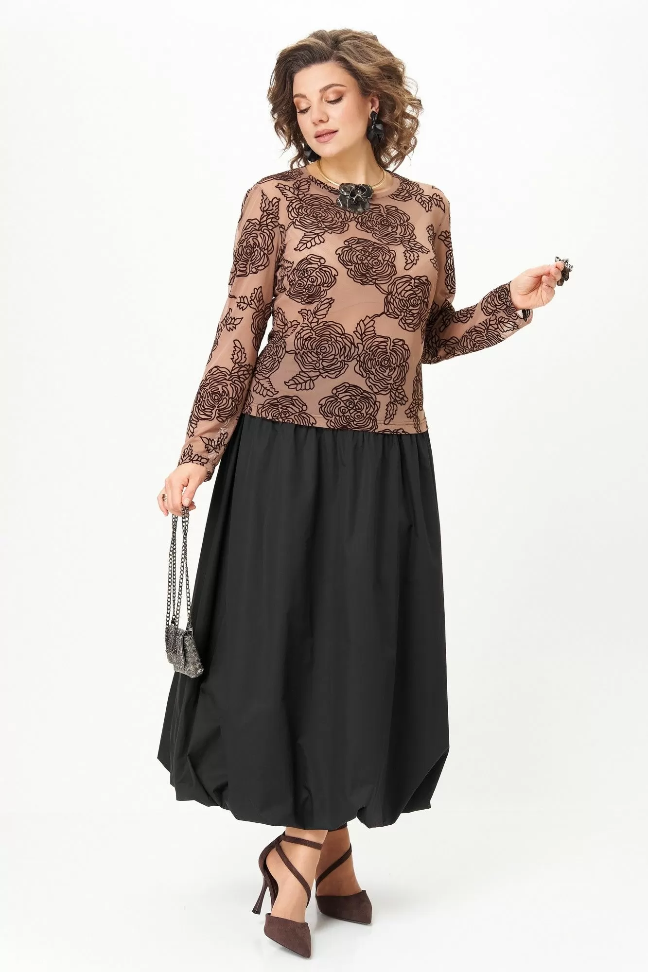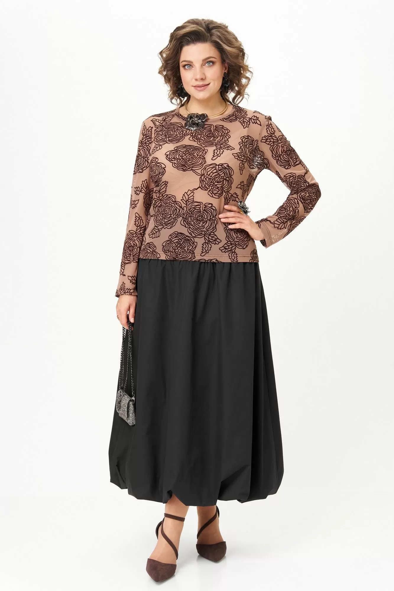 Эффектный комплект-двойка для женщин, которые любят быть в центре внимания. Идеален для торжественных мероприятий, театральных премьер, фотосессий и особых выходов. Комплект построен на игре текстур и контрастов. Топ полуоблегающего силуэта, длина ниже талии. Ткань — тонкая эластичная сетка-стрейч телесно-бежевого цвета. Принт — крупные бархатные (флокированные) розы, выполненные в технике devoré. Рисунок объёмный, бархат мягкий и приятный на ощупь. Горловина круглая, обработана узкой обтачкой. Рукав втачной длинный, заканчивается на запястье. Юбка «баллон» C кокеткой и застежкой в среднем шве заднего полотнища. По поясу спинки резинка, благодаря которой юбка комфортно сидит на любой талии.