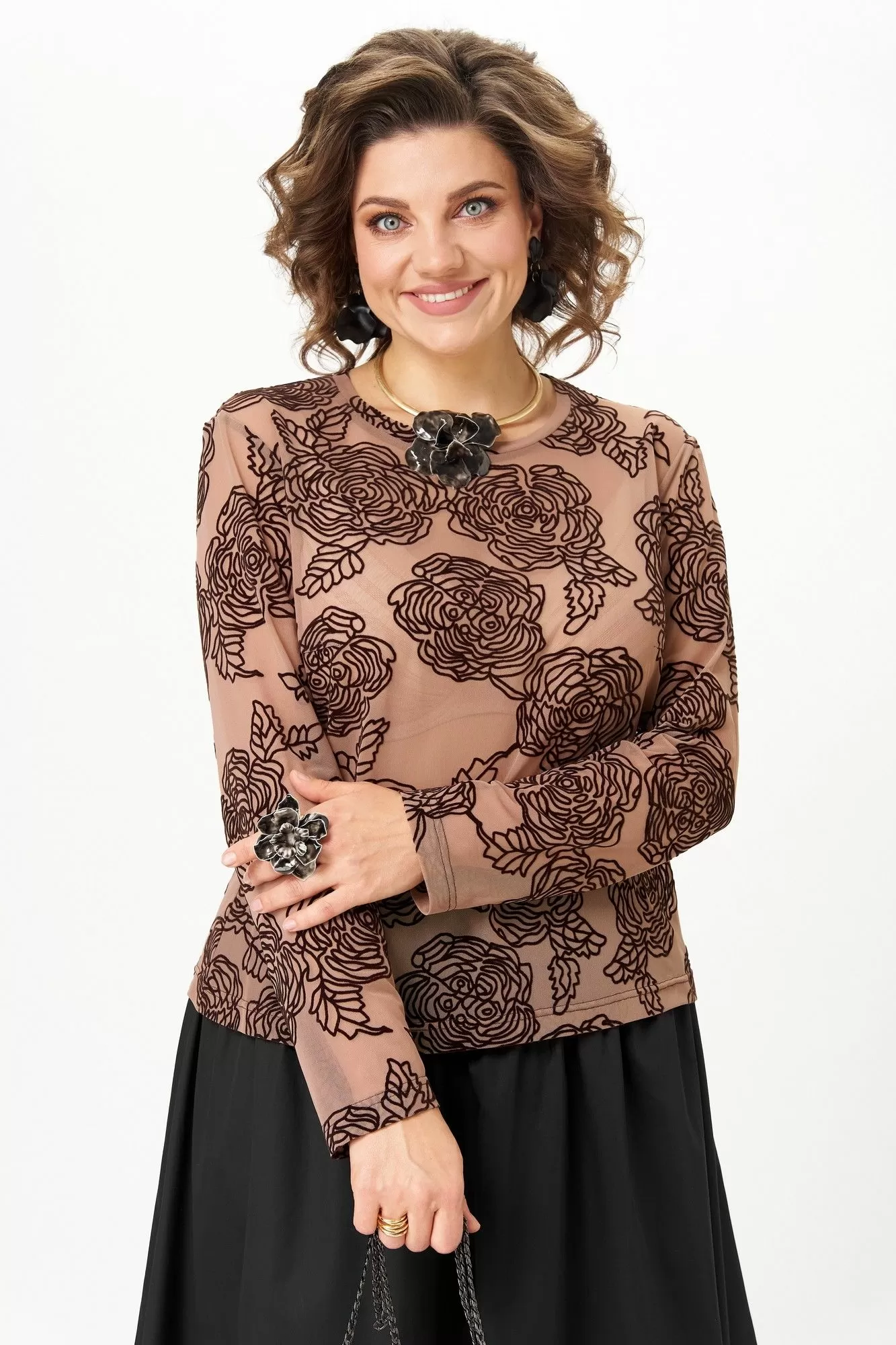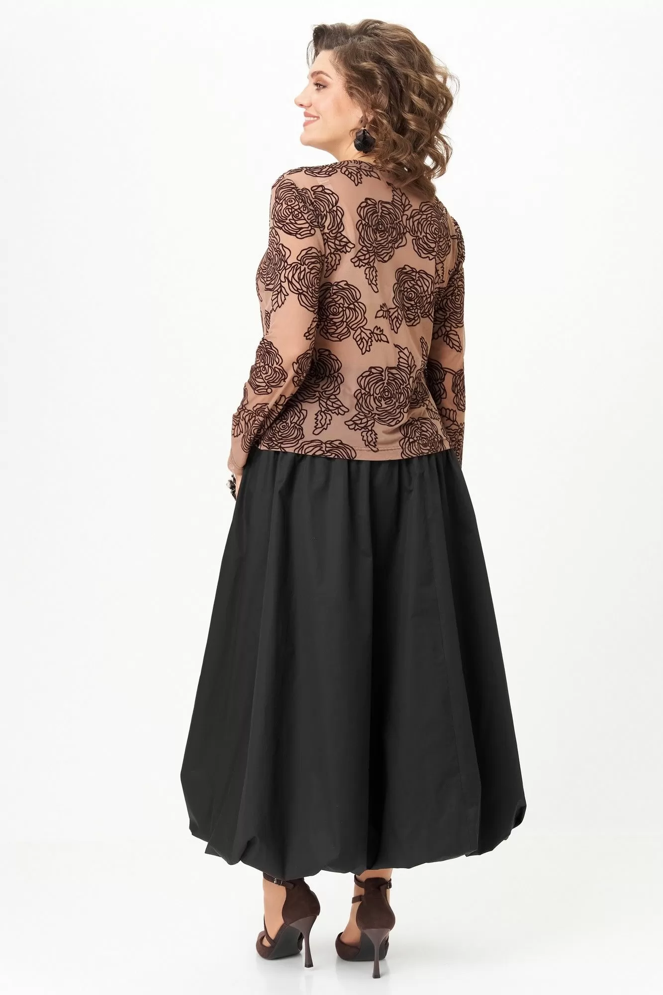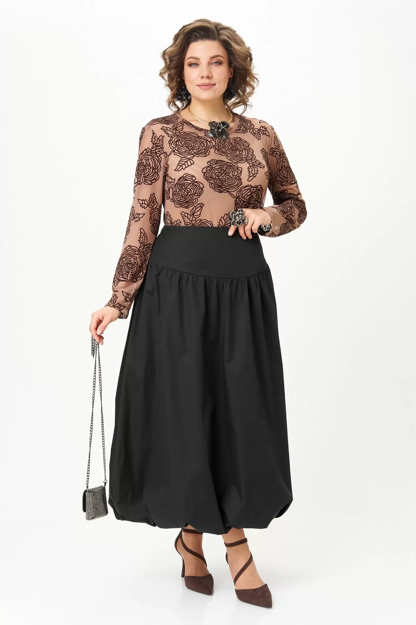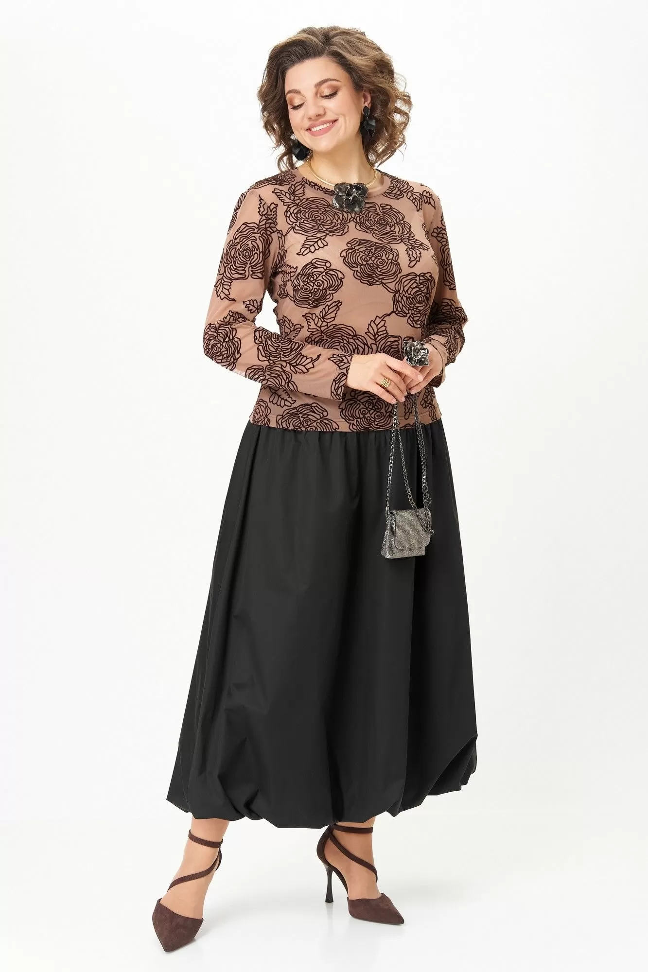 Эффектный комплект-двойка для женщин, которые любят быть в центре внимания. Идеален для торжественных мероприятий, театральных премьер, фотосессий и особых выходов. Комплект построен на игре текстур и контрастов. Топ полуоблегающего силуэта, длина ниже талии. Ткань — тонкая эластичная сетка-стрейч телесно-бежевого цвета. Принт — крупные бархатные (флокированные) розы, выполненные в технике devoré. Рисунок объёмный, бархат мягкий и приятный на ощупь. Горловина круглая, обработана узкой обтачкой. Рукав втачной длинный, заканчивается на запястье. Юбка «баллон» C кокеткой и застежкой в среднем шве заднего полотнища. По поясу спинки резинка, благодаря которой юбка комфортно сидит на любой талии.