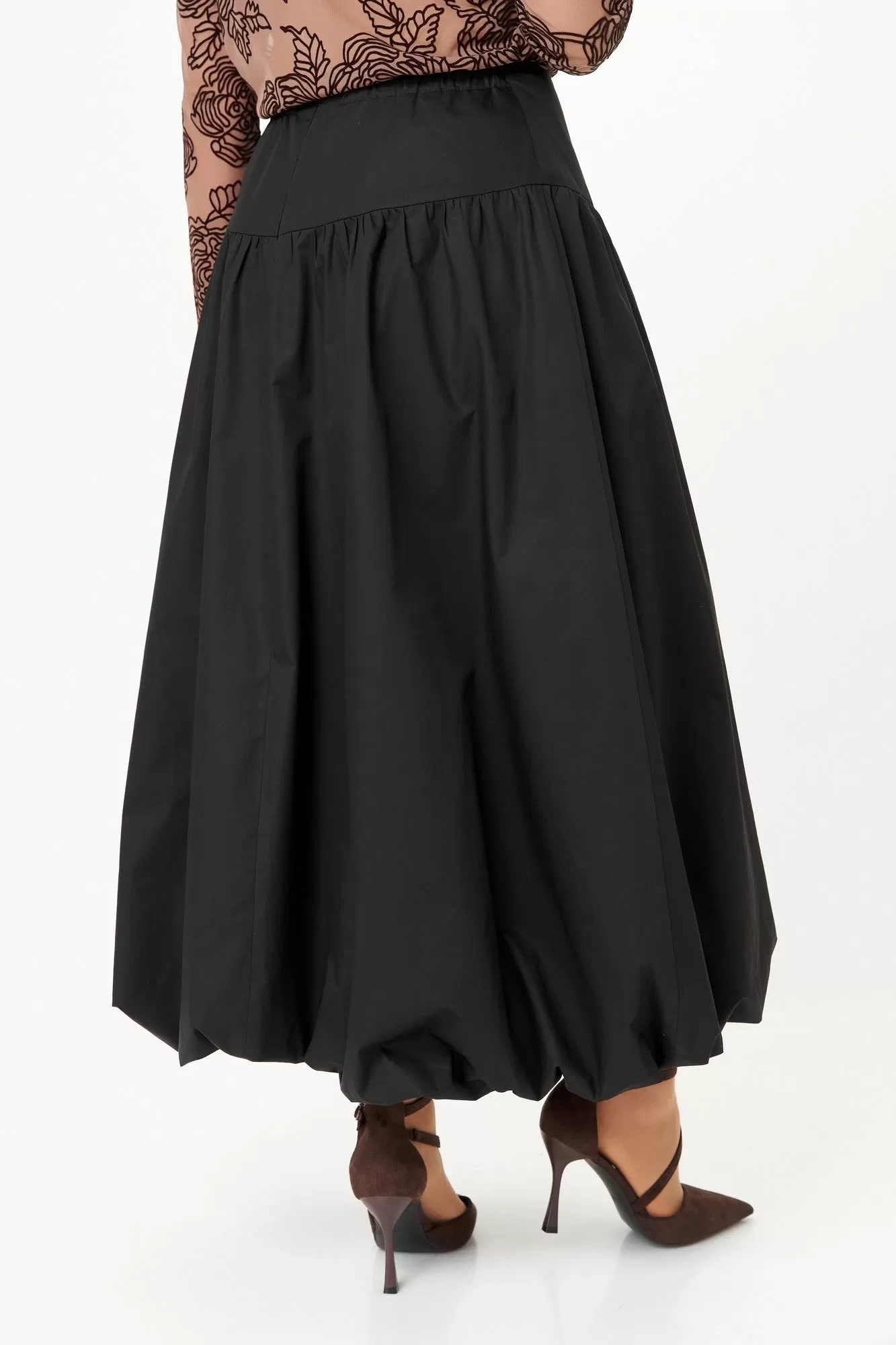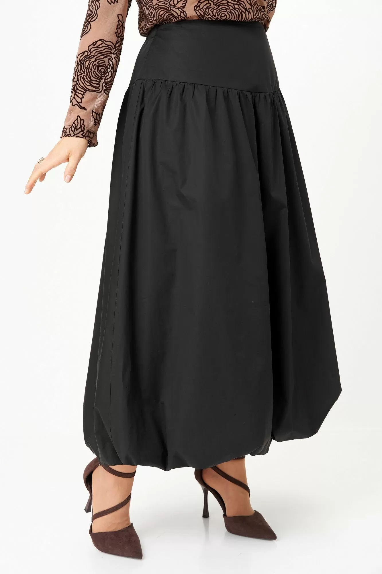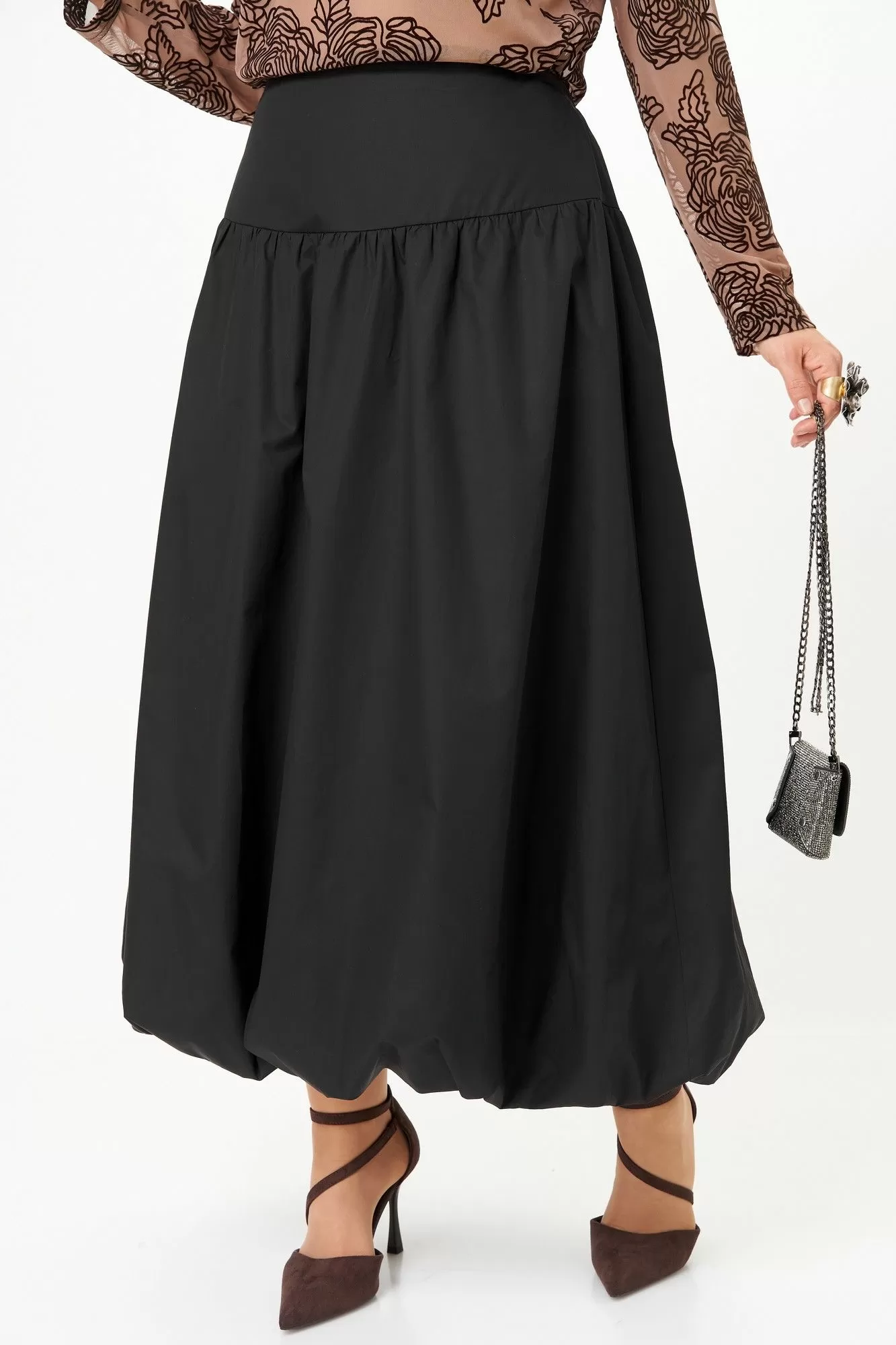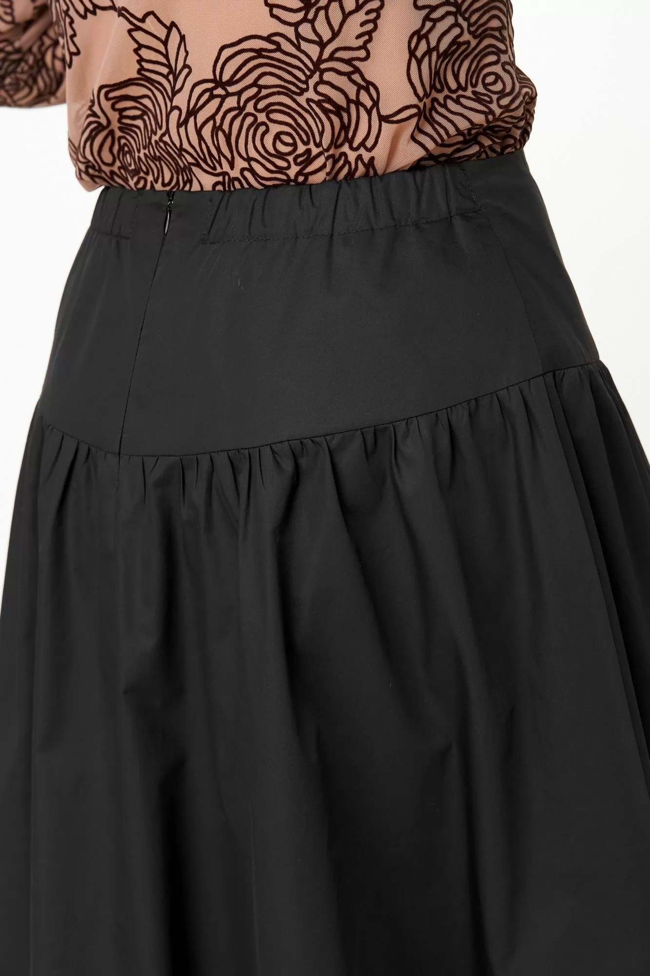 Эффектный комплект-двойка для женщин, которые любят быть в центре внимания. Идеален для торжественных мероприятий, театральных премьер, фотосессий и особых выходов. Комплект построен на игре текстур и контрастов. Топ полуоблегающего силуэта, длина ниже талии. Ткань — тонкая эластичная сетка-стрейч телесно-бежевого цвета. Принт — крупные бархатные (флокированные) розы, выполненные в технике devoré. Рисунок объёмный, бархат мягкий и приятный на ощупь. Горловина круглая, обработана узкой обтачкой. Рукав втачной длинный, заканчивается на запястье. Юбка «баллон» C кокеткой и застежкой в среднем шве заднего полотнища. По поясу спинки резинка, благодаря которой юбка комфортно сидит на любой талии.