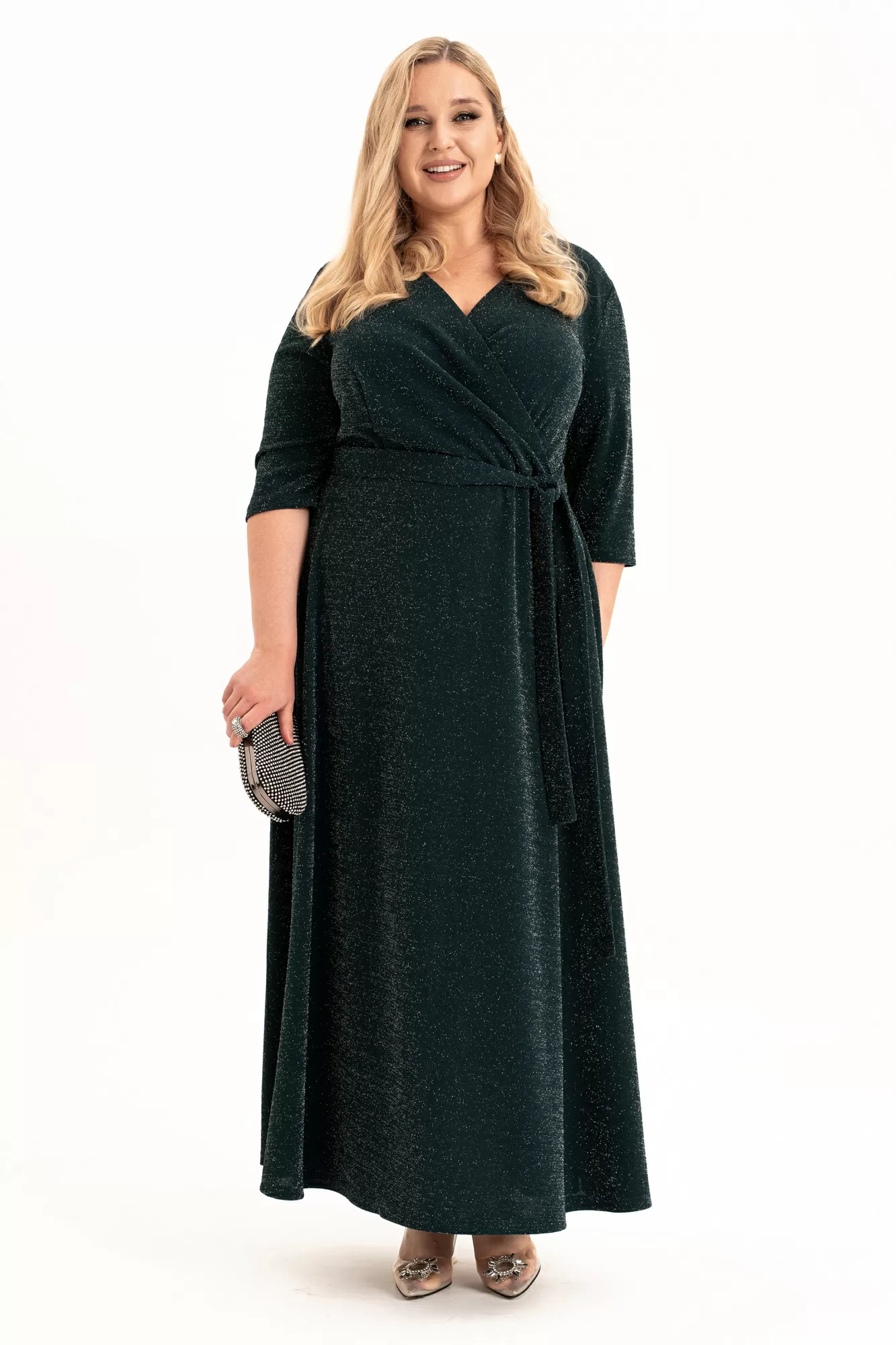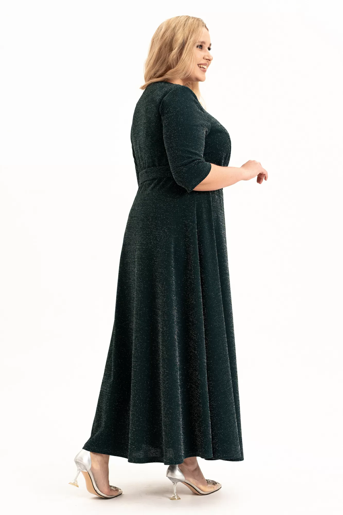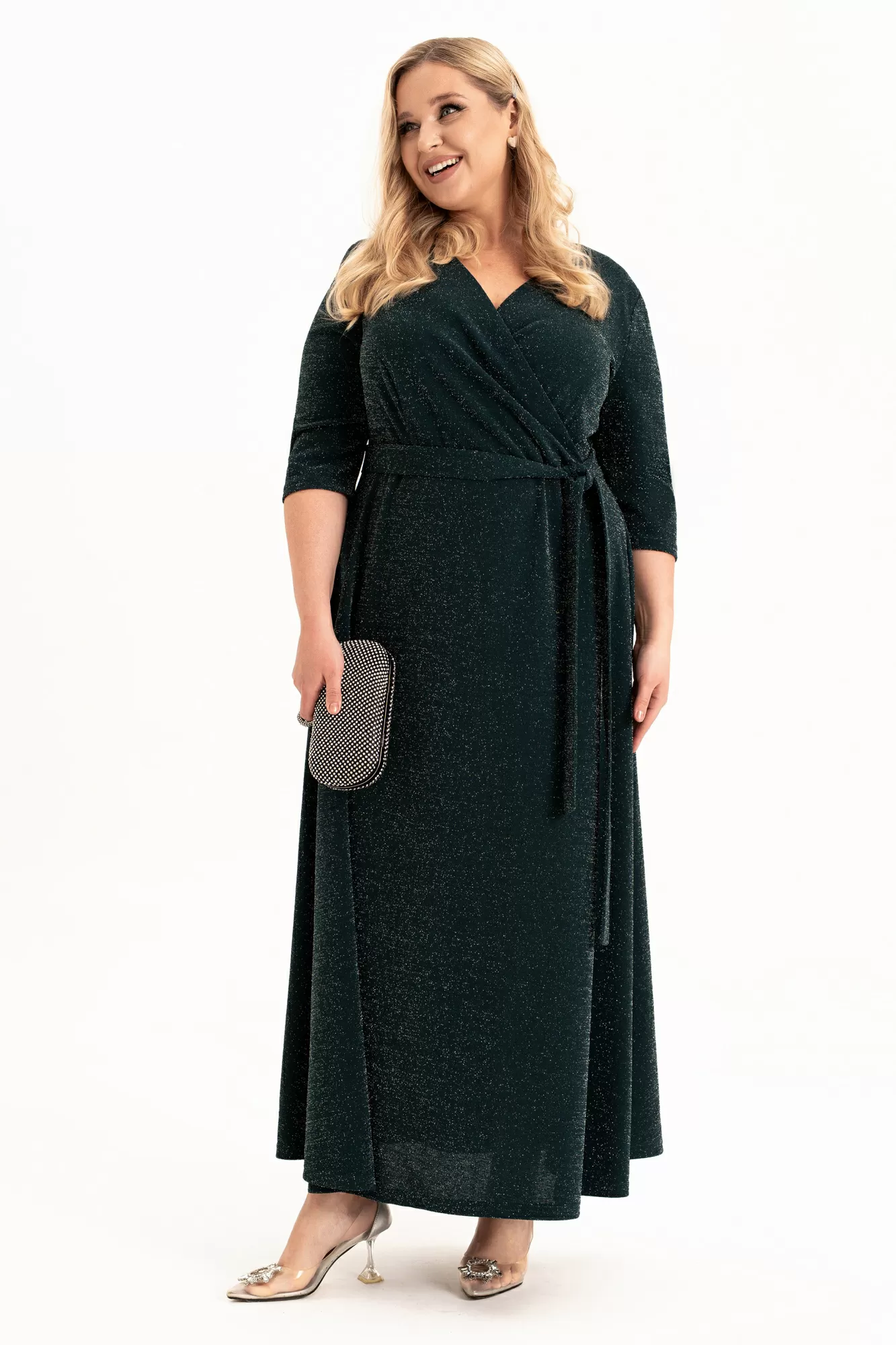 Нарядное платье на запах - это элегантный выбор для любой женщины, подростка или девушки, идеальное сочетание стиля и комфорта. Длинное вечернее платье сочного изумрудного цвета из стрейчевого трикотажного полотна с люрексом. Ткань мягкая, очень приятная к телу. Верхняя часть платья переда и спинки отрезные по линии талии. Лиф переда с эффектным запахом и рельефным бочком. Нижняя часть платья расширена к низу. Рукав втачной, длиной ¾. Платье со съёмным поясом. Съемный пояс и закрытые плечи выгодно подчеркивают женственность фигуры, а рукава длиной три четверти и пикантный V-образный вырез добавляют неповторимости вашему образу. Выполненное из премиальной ткани с блеском, платье представлено в различных размерах. Это универсальное платье подойдет для любого случая: будь то деловая встреча, вечерняя прогулка или особенный праздник. Тренд сезона 2025-2026года. Его можно носить в любое время года, от весны до зимы. Внимание к деталям и трендовый дизайн делают его идеальным выбором для множества мероприятий, включая свадебные фотосессии, ресторанные посиделки или корпоративные вечера. Платье нарядно, кокетливо и подходит как высоким, так и невысоким девушкам. Независимо от вашего стиля или сезона, наше платье будет идеальным выбором.