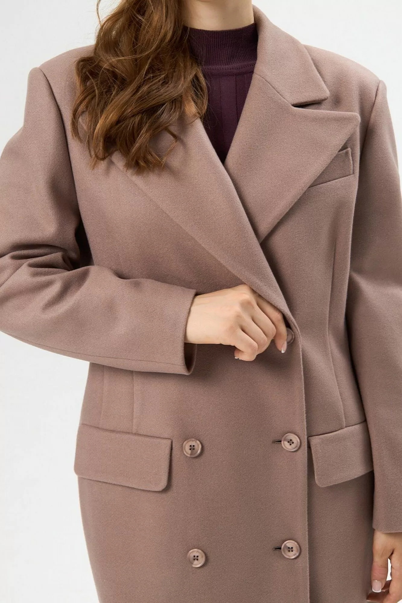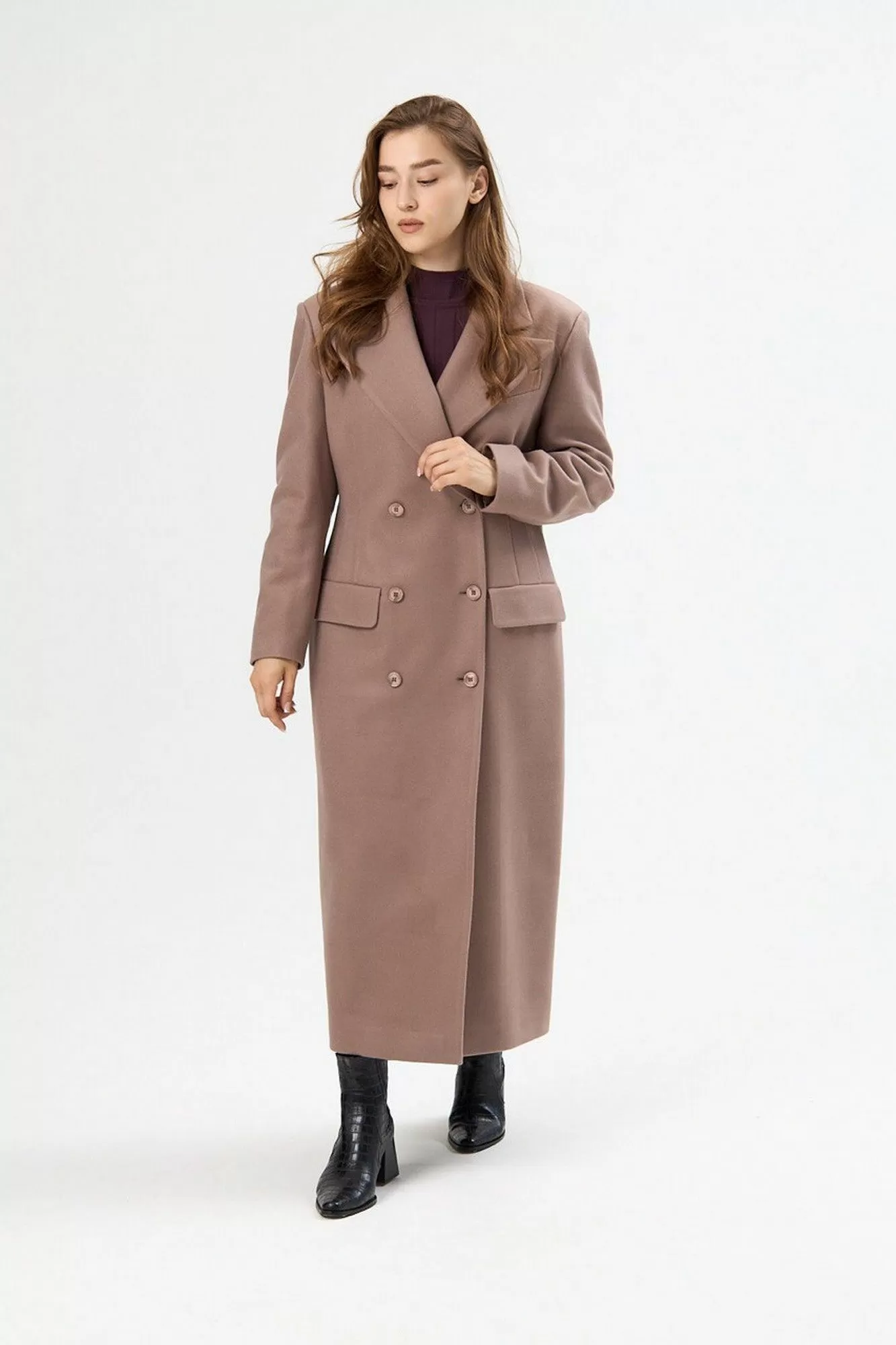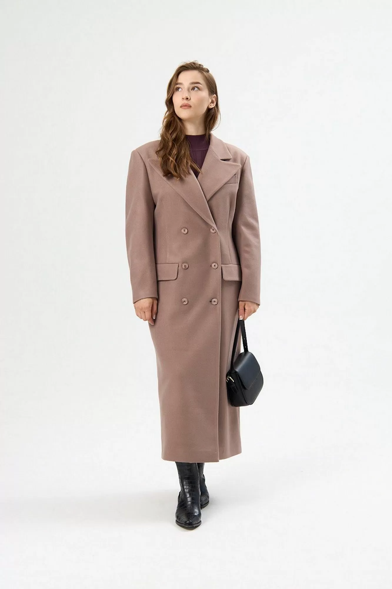 Пальто-тренч женское, приталенного силуэта из полушерстяной пальтовой ткани, длиной миди, со слегка выраженной линией плеча, двубортное с фронтальной застёжкой на петли-пуговицы, с отложным воротником и удлинённым лацканом. Перед с талиевыми вытачками и функциональными прорезными карманами с клапаном и одной обтачкой и верхним карманом с листочкой слева-иммитация. Спинка со средним швом и шлицей, и талиевыми вытачками. Рукав длинный, втачной, двушовный. Пальто на поливискозной подкладке.
