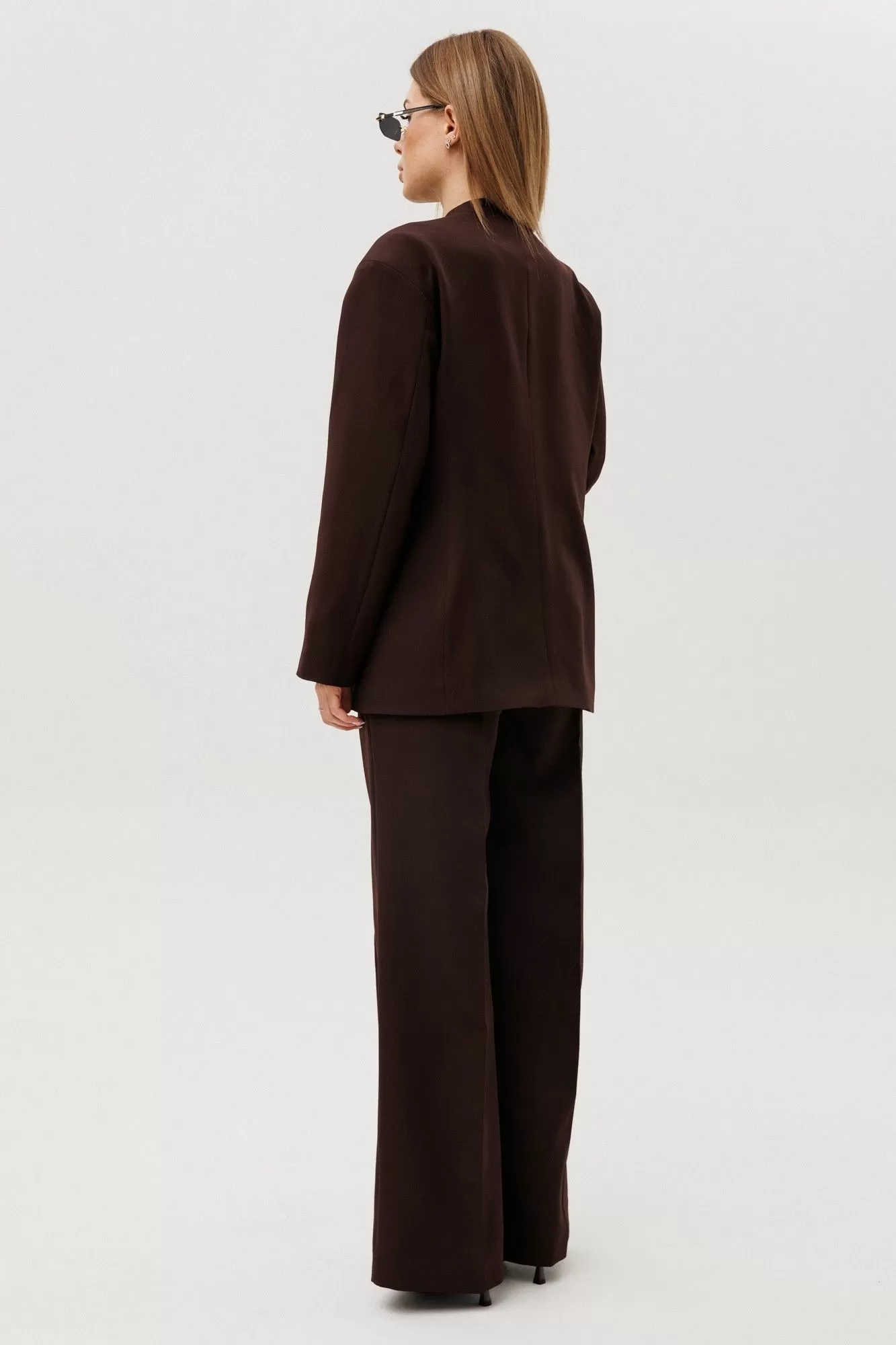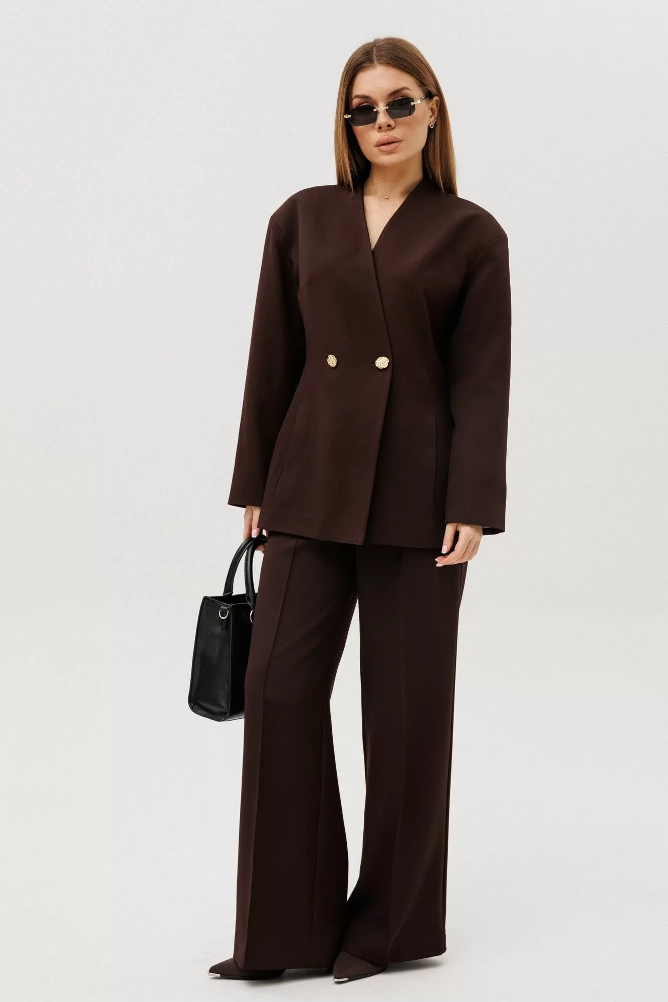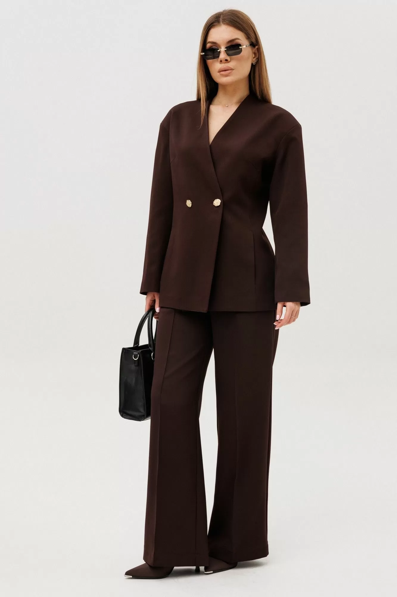 Элегантный женский костюм насыщенного шоколадного цвета, создающий строгий, но выразительный образ. Костюм состоит из жакета и брюк, выполненных из качественной ткани. Жакет полуприлегающего силуэта обладает спущенными плечами и V-образным вырезом, что добавляет образу изысканности. Функциональные детали включают подкладку, втачные длинные рукава и действующие карманы в рельефах по переду. Застежка на пуговицы . Спинка жакета оформлена средним швом и рельефами для идеальной посадки. Брюки прямого силуэта дополняют ансамбль, предлагая комфорт и свободу движений. Они оснащены притачным поясом и удобной застежкой на тесьму-молнию спереди. Боковые карманы подчёркивают функциональность брюк. Этот костюм идеально подходит как для деловых встреч, так и для выходов в свет, сочетая в себе классику и современные тенденции в женской моде.