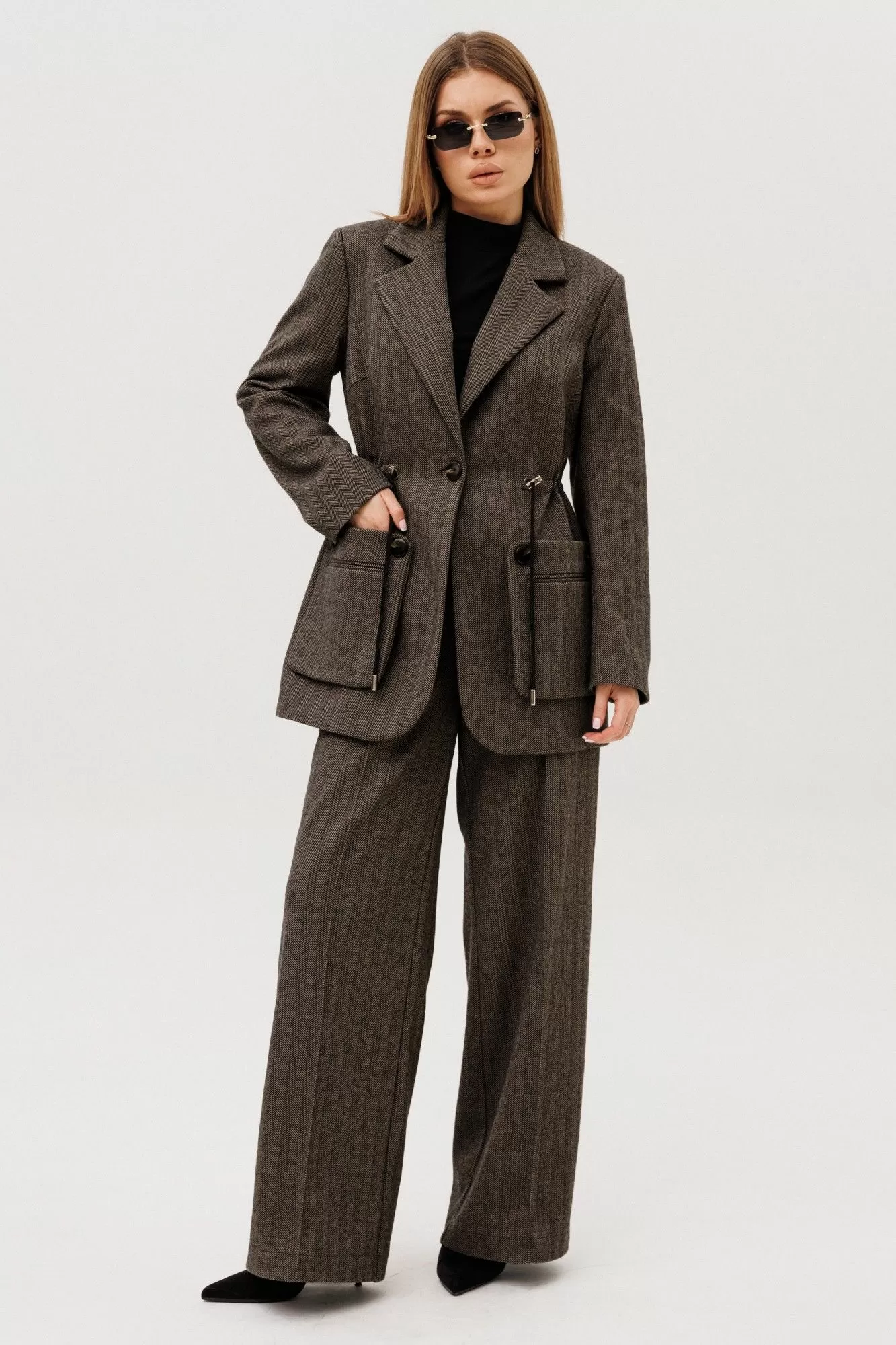 Костюм двухпредметный :жакет свободного силуэта с регулирующей кулисой по линии талии.Застежка на петлю пуговицу.По переду действующие накладные карманы.Изделие на подкладке. Элегантные женские брюки прямого кроя ,по переду на брючинах стрелки. Модель с высокой посадкой на притачном поясе обеспечивает идеальное прилегание. Спереди расположена практичная застежка на тесьму-молнию, добавляющая удобства при носке. Брюки укомплектованы функциональными боковыми карманами, что придает модели дополнительную практичность и удобство. Эта модель идеально подойдет как для офиса, так и для создания повседневных стильных образов.