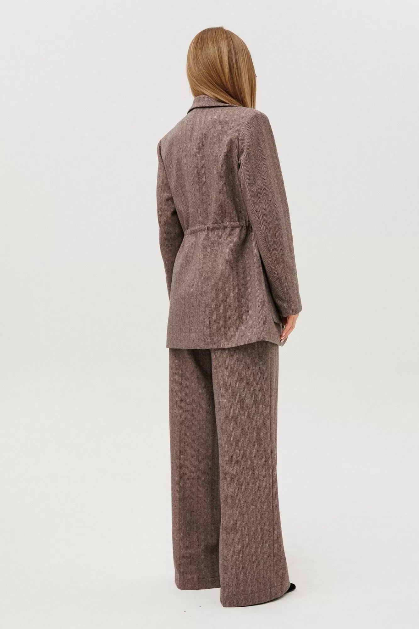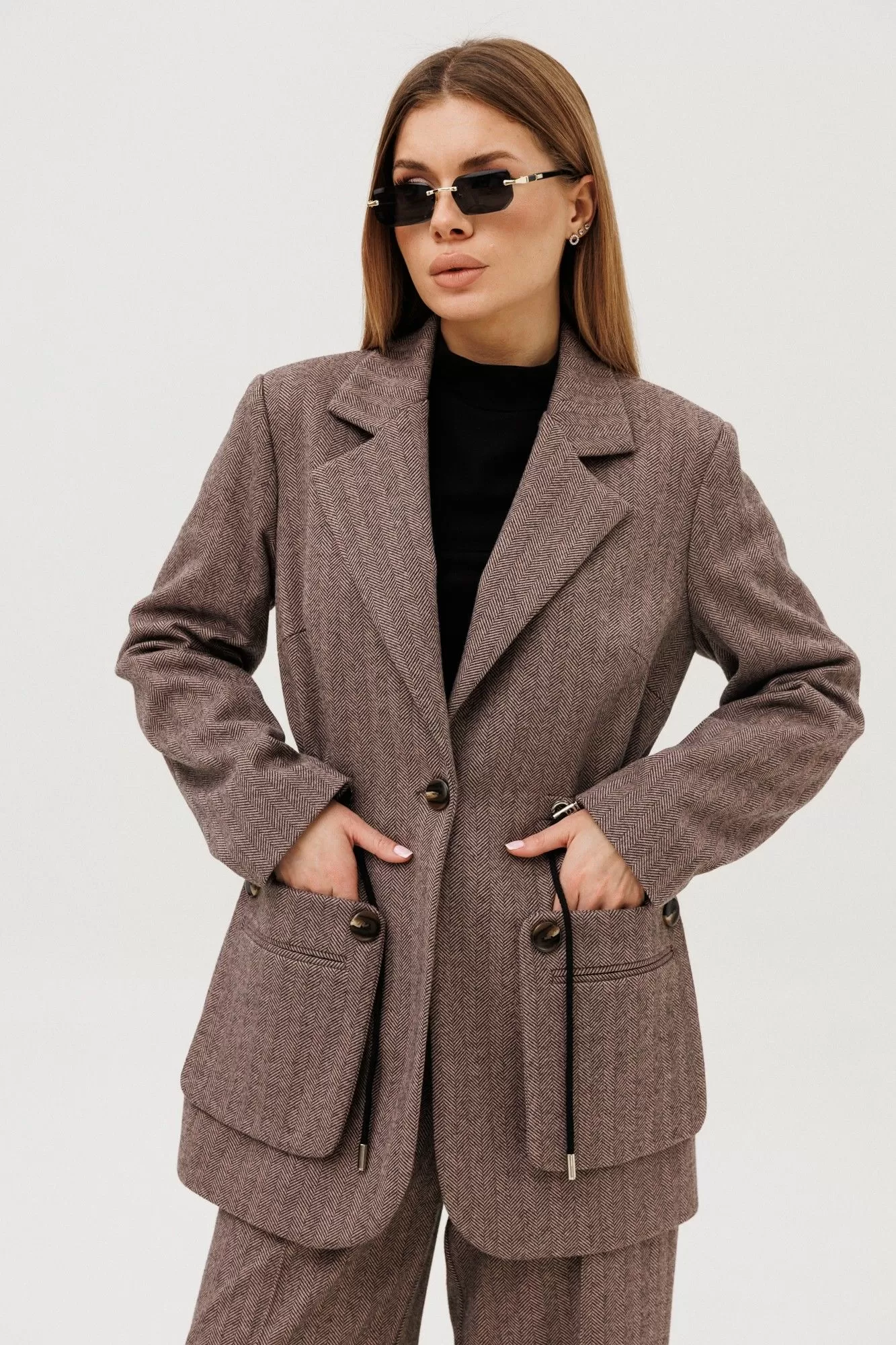 Костюм двухпредметный :жакет свободного силуэта с регулирующей кулисой по линии талии.Застежка на петлю пуговицу.По переду действующие накладные карманы.Изделие на подкладке. Элегантные женские брюки прямого кроя ,по переду на брючинах стрелки. Модель с высокой посадкой на притачном поясе обеспечивает идеальное прилегание. Спереди расположена практичная застежка на тесьму-молнию, добавляющая удобства при носке. Брюки укомплектованы функциональными боковыми карманами, что придает модели дополнительную практичность и удобство. Эта модель идеально подойдет как для офиса, так и для создания повседневных стильных образов.