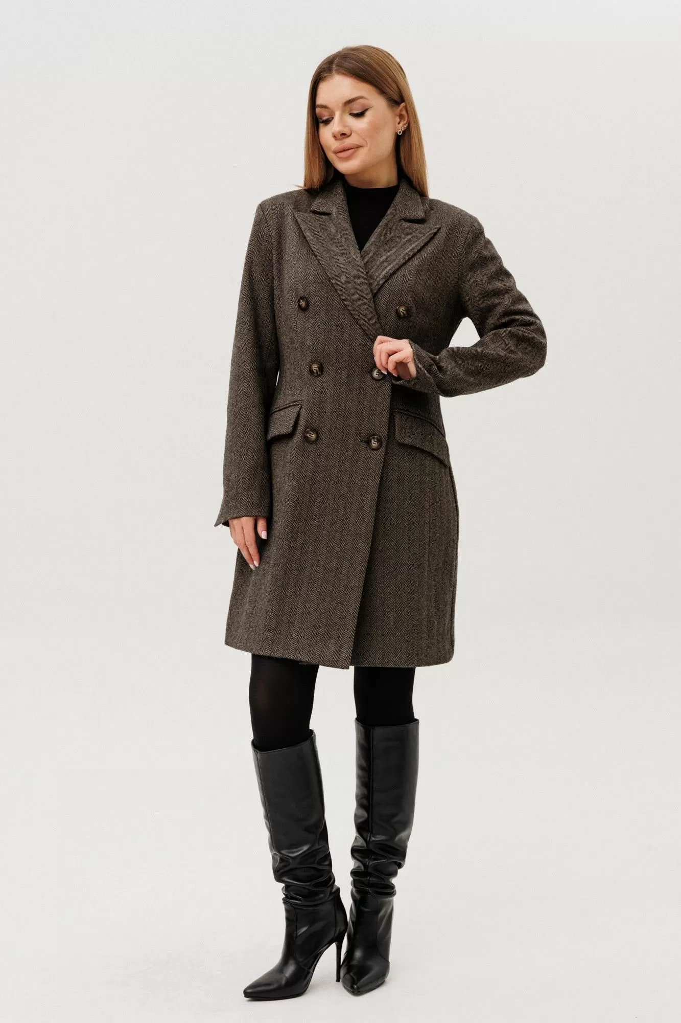 Платье-пиджак прилегающего силуэта,выполнен из теплой ткани. Застежка на петли-пуговицы,по переду действующие карманы,на рукавах шлицы.Изделие на подкладке. Джемпер женский прилегающего силуэта с втачным одношовным рукавом с воротником-стойкой.