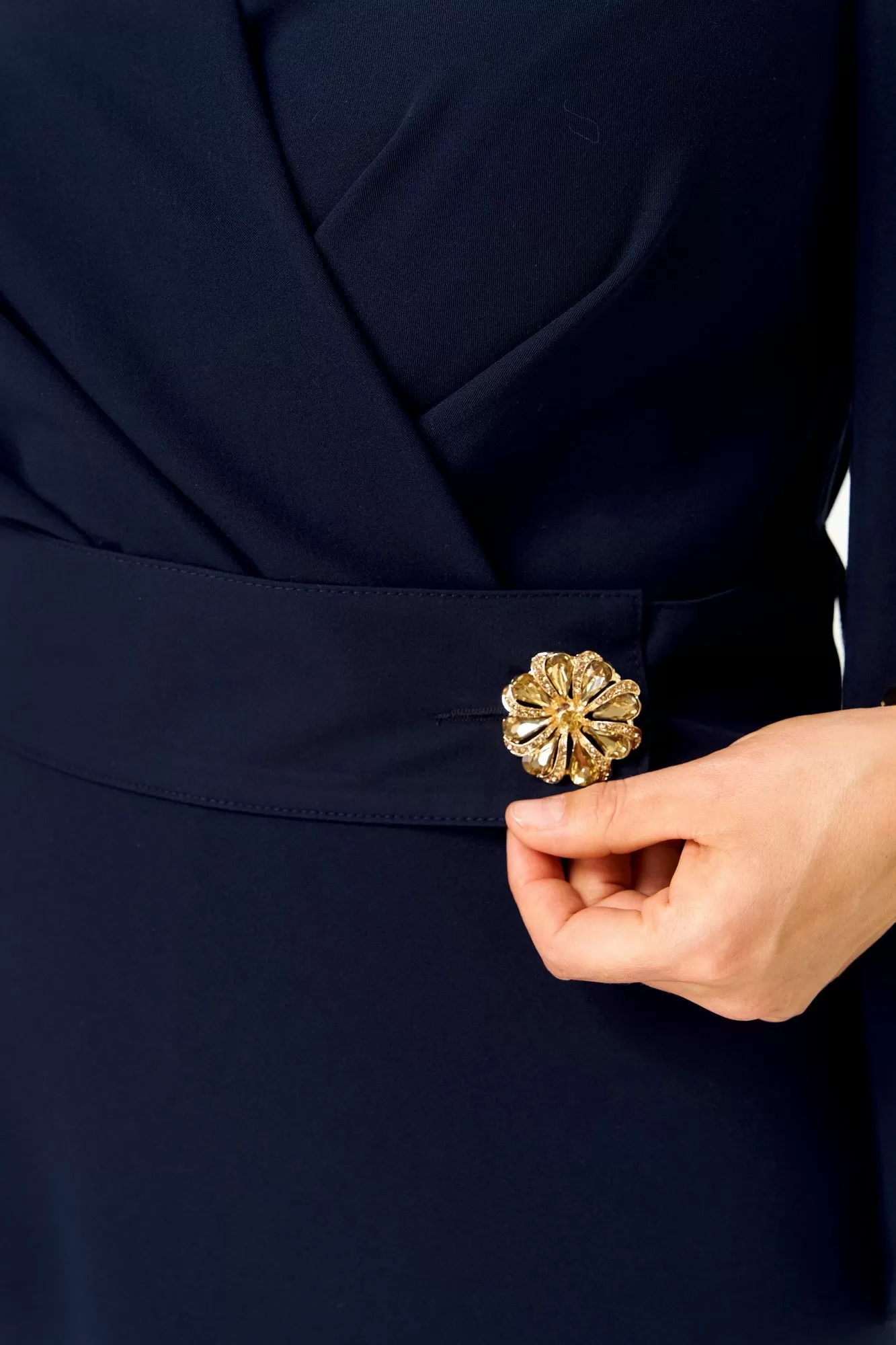 Платье отрезное по линии талии. Полочка с иммитацией запаха и складками по линии талии. Горловина V-образной формы. Спинка с талиевыми вытачками. Рукав втачной, обьемный к низу, с драпировкой. Юбка полуприлегающая по бедрам, свободная и широкая по низу. По боковым швам в области талии настрочены шлевки, через которые продет пояс, крепящийся на пуговицу.