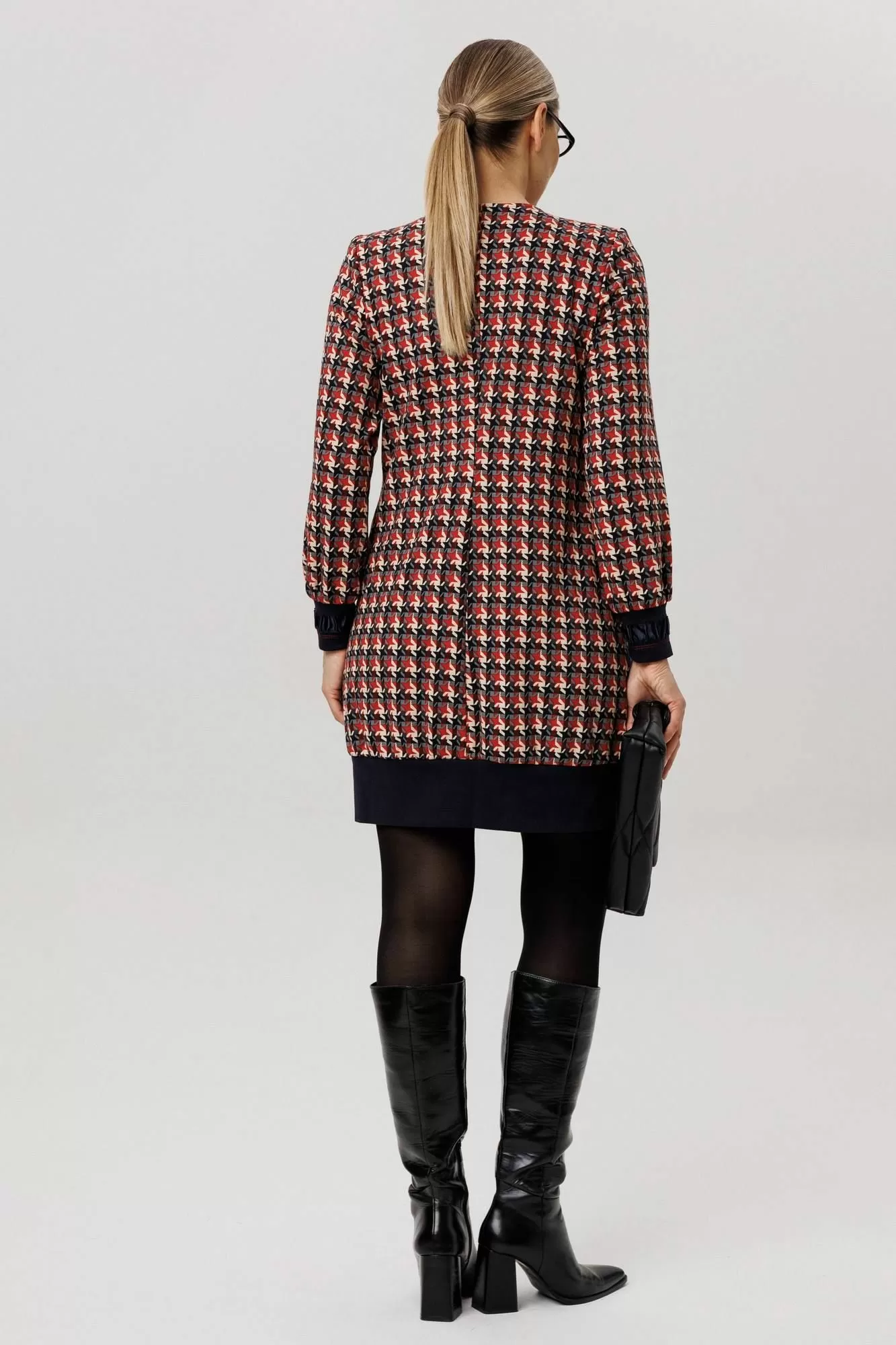 Его прилегающий силуэт, рожденный из струящегося трикотажа, мягко следует за изгибами фигуры, создавая ощущение утонченной элегантности. Классическая строгость круглого выреза горловины и длинных втачных рукавов, завершенных изящными манжетами, служит идеальным фоном для трогательного акцента — нежной завязки-капельки, украшенной переливом атласной ленты. Эту лиричную ноту мастерски уравновешивают практичные элементы: два аккуратных накладных кармана и четкий манжет по низу, которые придают силуэту завершенность и структуру.