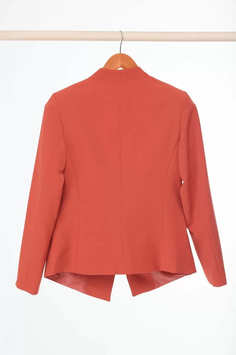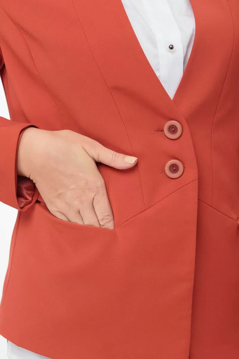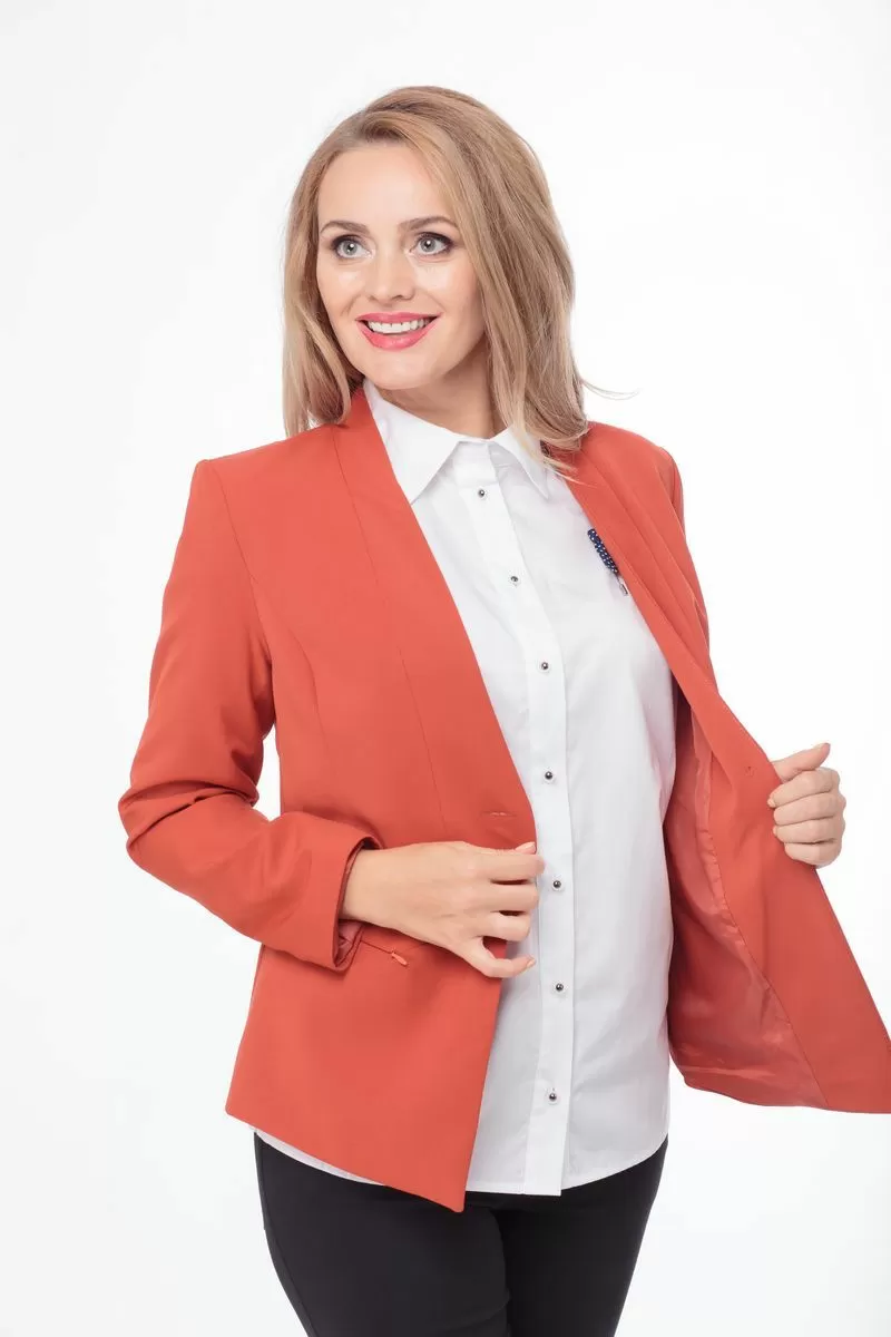 Жакет полуприлегающего силуэта с рельефными швами по переду и спинке, V-образным вырезом, что придаёт образу женственность-хрупкость и уверенность одновременно.