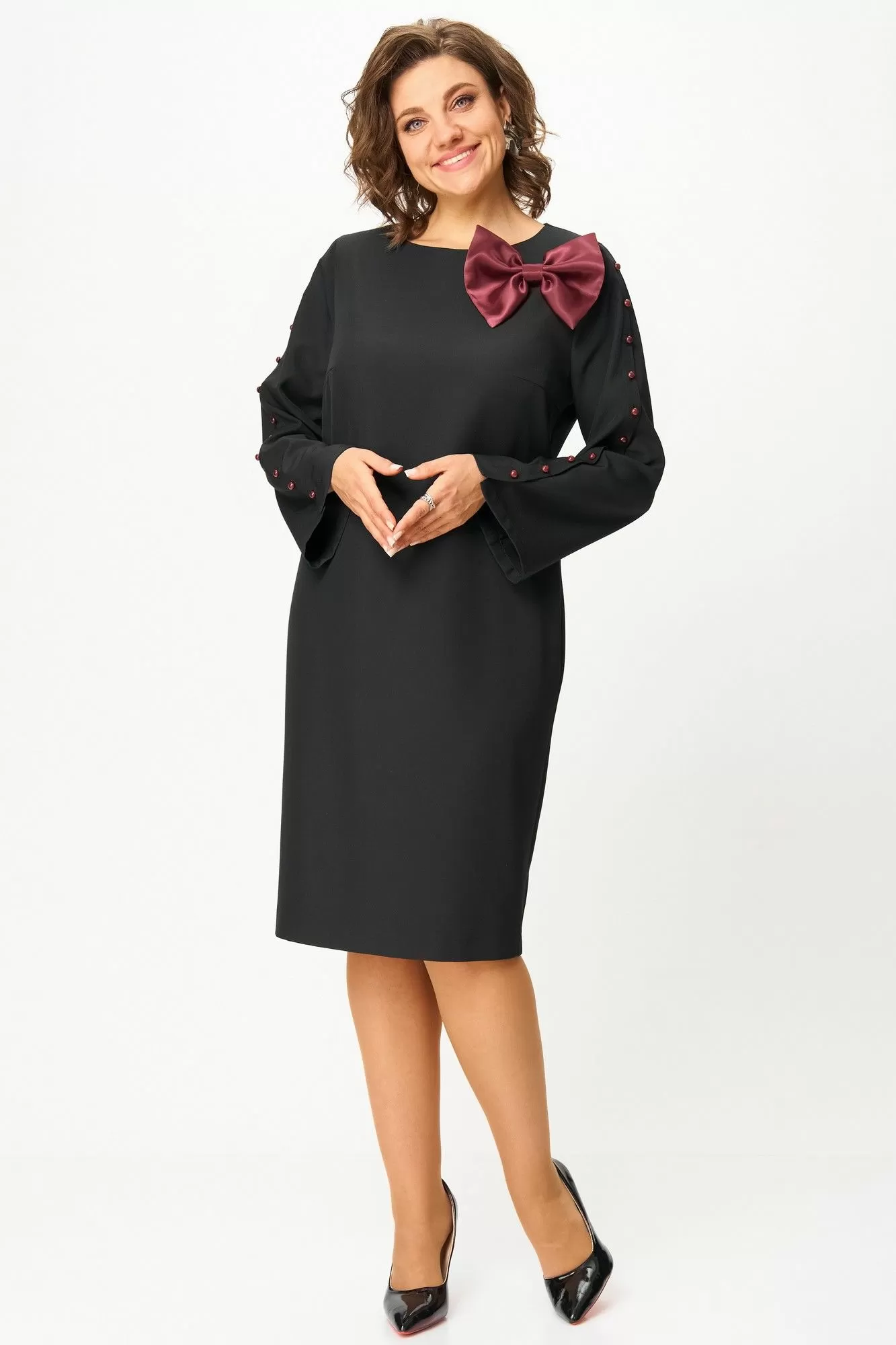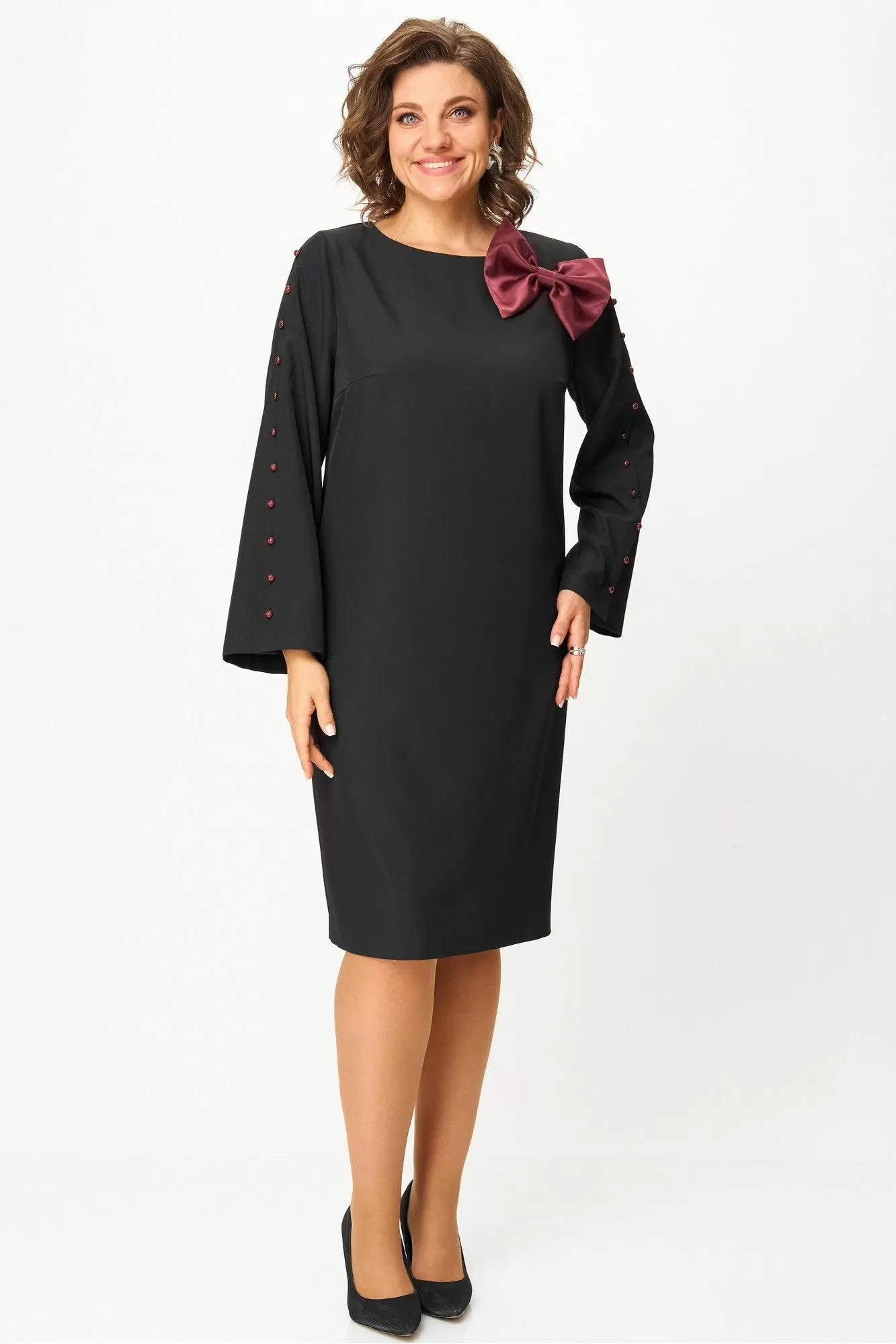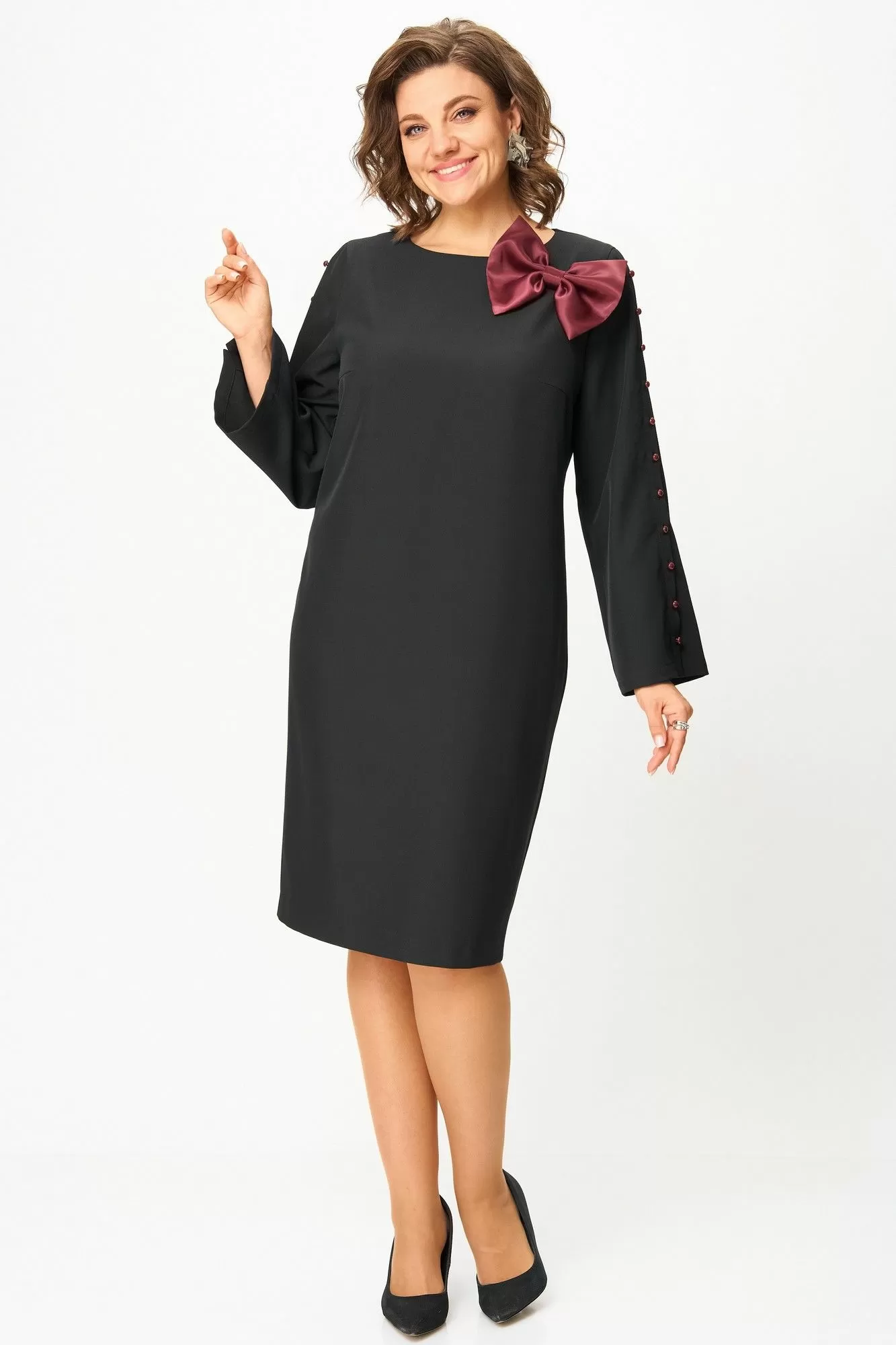 Платье женское полуприлегающего силуэта из костюмно-плательной ткани. Горловина округлой формы. Перед с нагрудными вытачками. Спинка с талиевыми вытачками, застежкой на молнию и разрезом в среднем шве. Рукав втачной прямой длинный с разрезом и декоративной застежкой на петли и пуговицы. По низу платья в боковом шве высокий разрез. Декорировано платье съемным бантом. Длина платья: 101 см