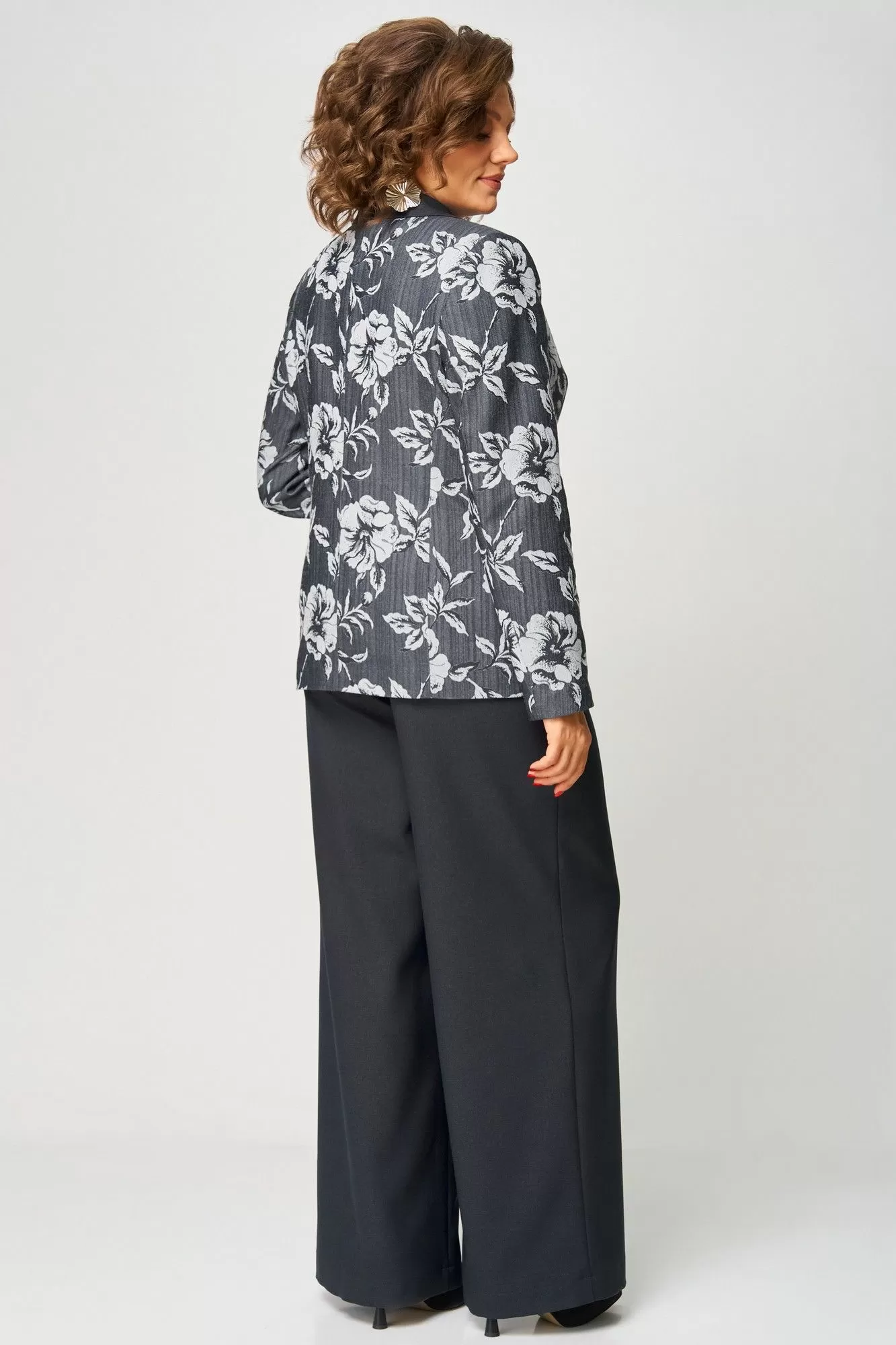 Однобортный жакет полуприталенного силуэта, на подкладке, с плечевыми накладками. Воротник пиджачного типа с отложными лацканами. По переду центральная застежка на петли и пуговицы и прорезные карманы с клапаном, талиевые вытачки и рельефы. Низ бортов закругленной формы. Спинка со средним швом и рельефами. Рукав втачной двухшовный длинный.