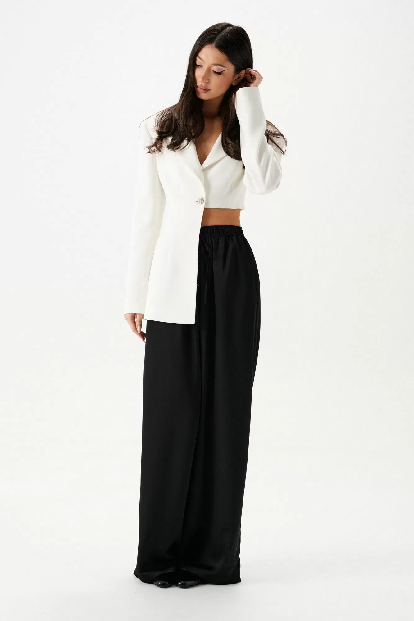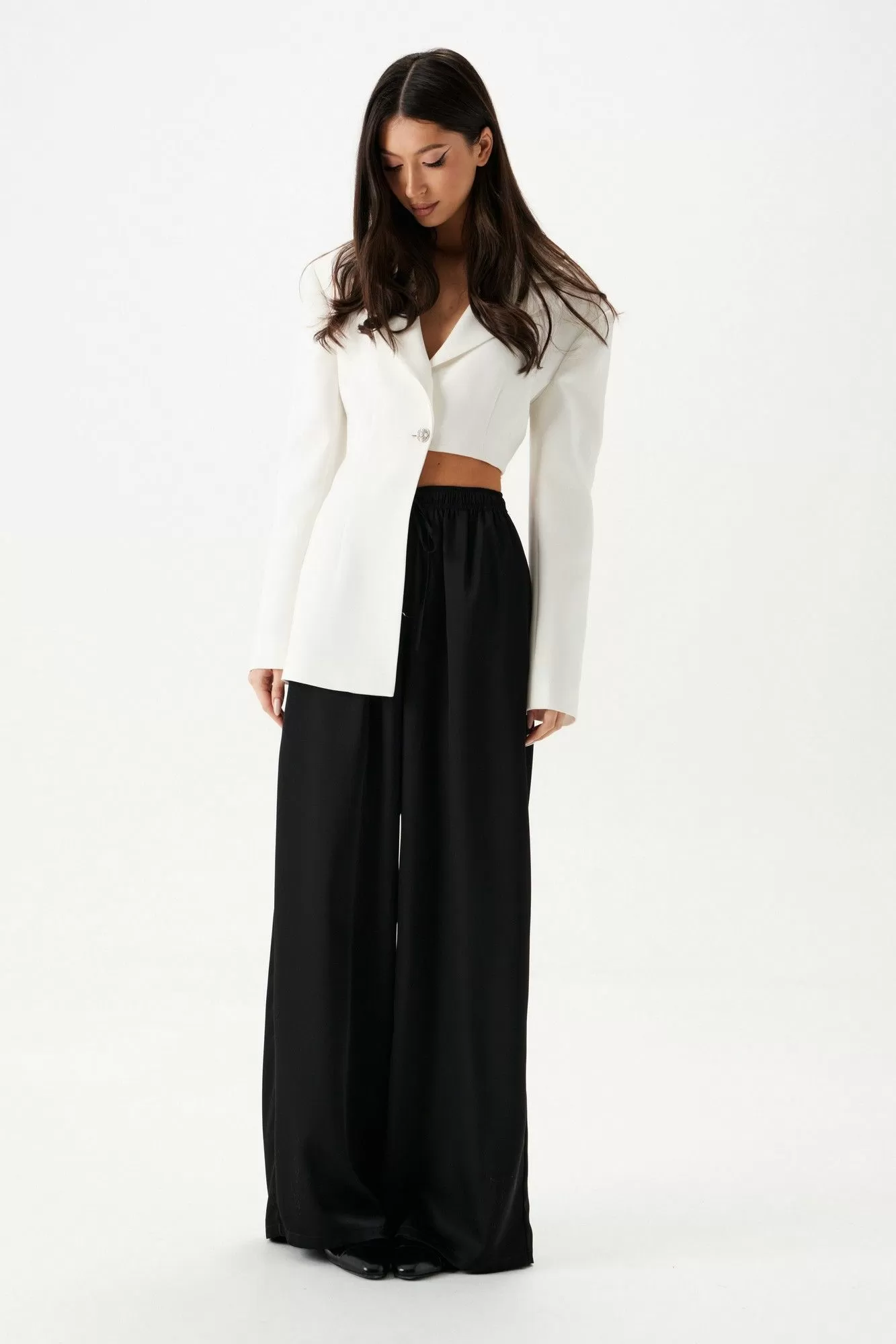 Жакет комбинированный выполнен из костюмной ткани белого цвета. Характеристика: левая часть жакета укороченная, с выточками по переду и со спинки изделия, длина по центральному шву от края горловины 36см, правая часть жакета удлиненная, полуприталенный силуэт по переду и со спинки есть выточки, длина по центральному шву от края горловины 72см, отложной воротник, подклад, подплечники, рукав вточной, застежка центральная петля-пуковица. Длина рукава от края горловины 78см.
