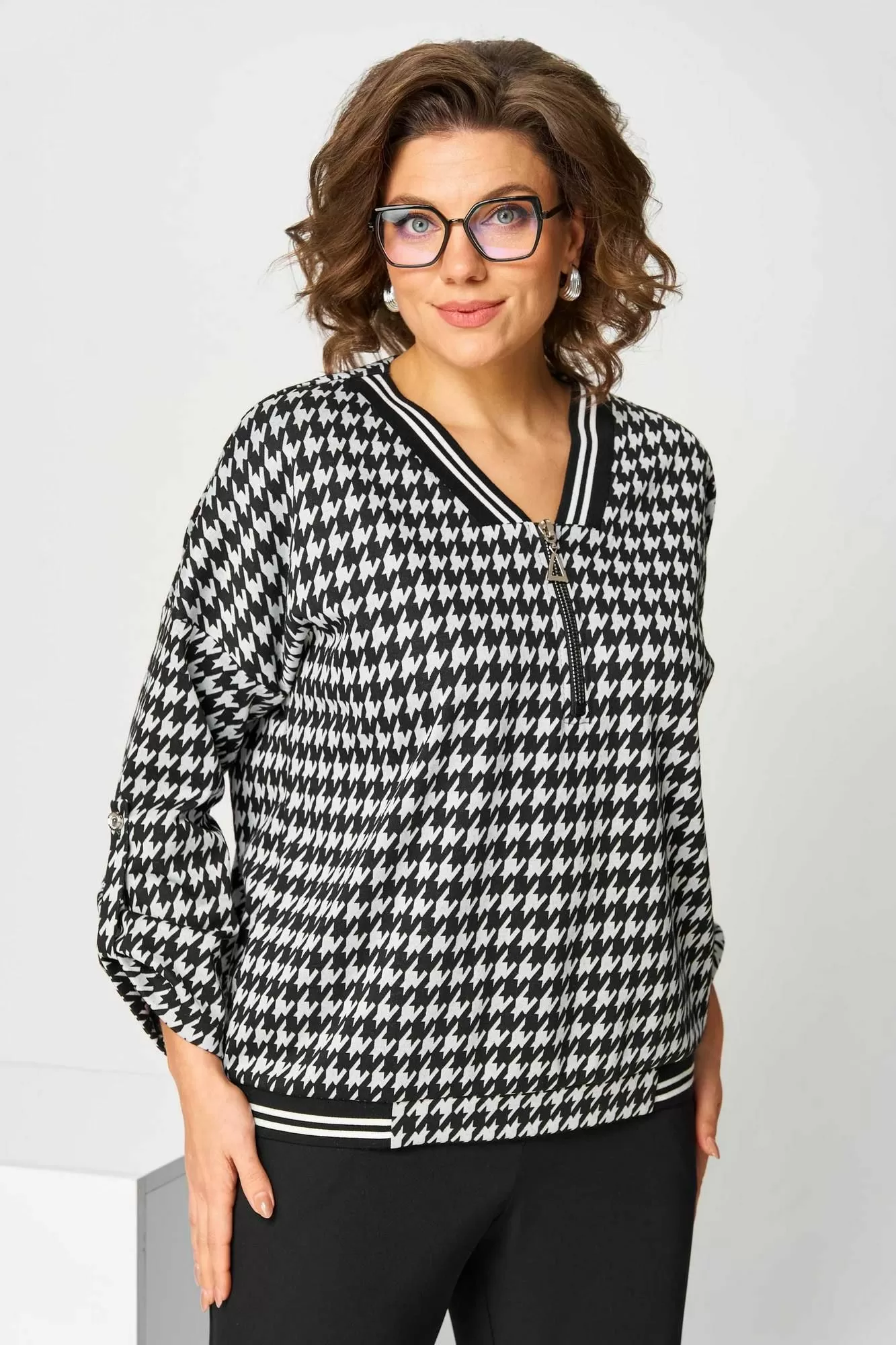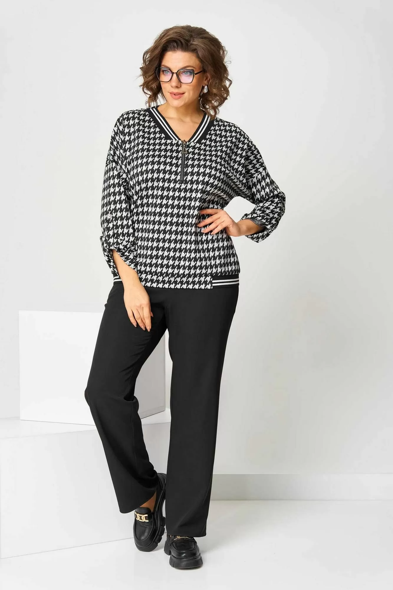 Костюм брючный (двойка) женский полуприлегающего силуэта, состоит из джемпера и брюк. Костюм выполнен и трикотажного полотна и брючной ткани. Джемпер без застежки, рукав длинный с фигурной вставкой. По центру джемпера вставлена молния, по горловине и низу джемпера довяз. Рукав спущенный с патой. Брюки классические, со стрелками на поясе с резинкой. Застежка на гульфик, на тесьму-молнию. Вверху косые карманы.