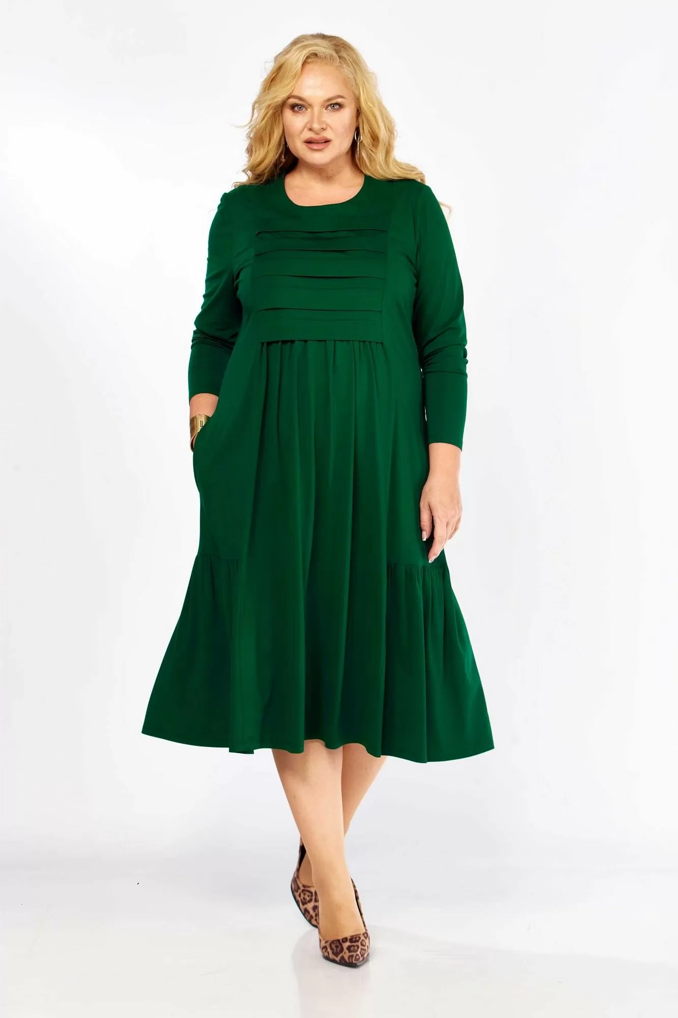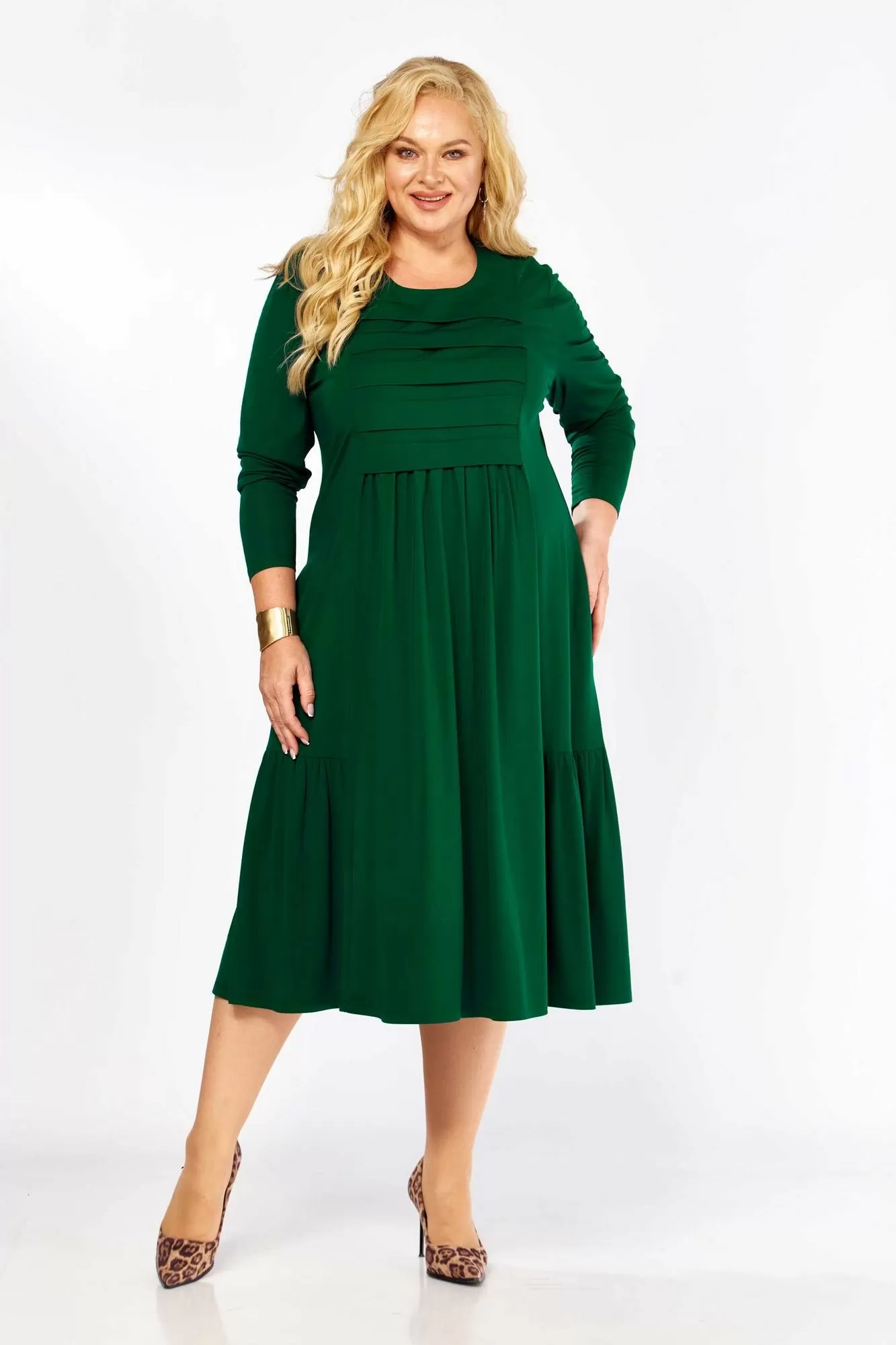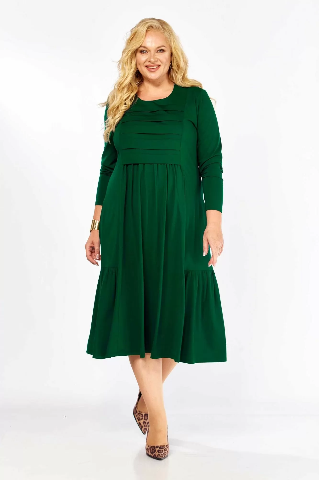 Платье женское А-образного силуэта, из трикотажного полотна. Горловина круглая, рукав длинный, одношовный. По переду кокетка лифа со складками, из-под которой сборка. По переду и спинке рельефы с подрезами по низу с воланами. Спинка с центральным швом.