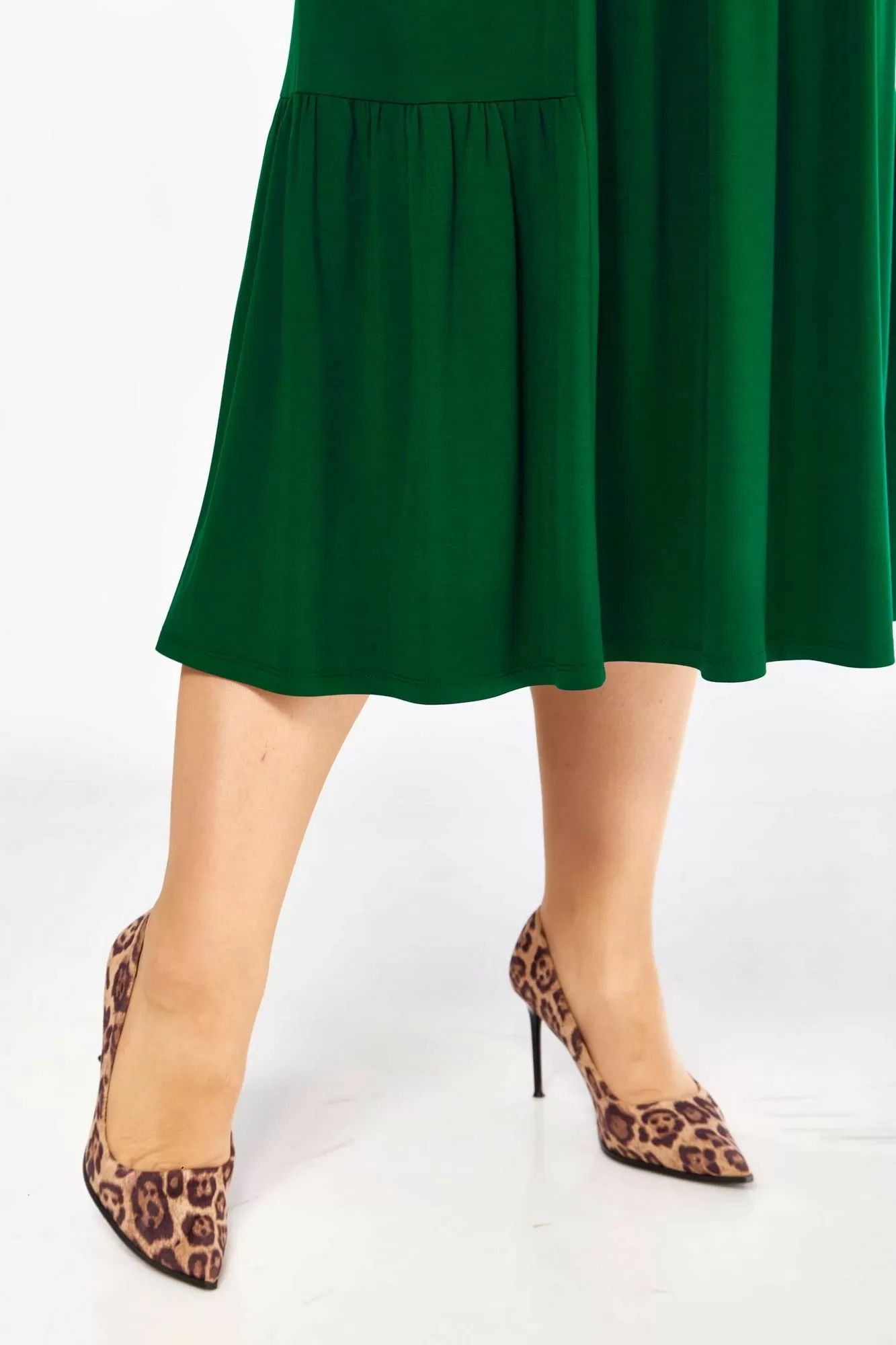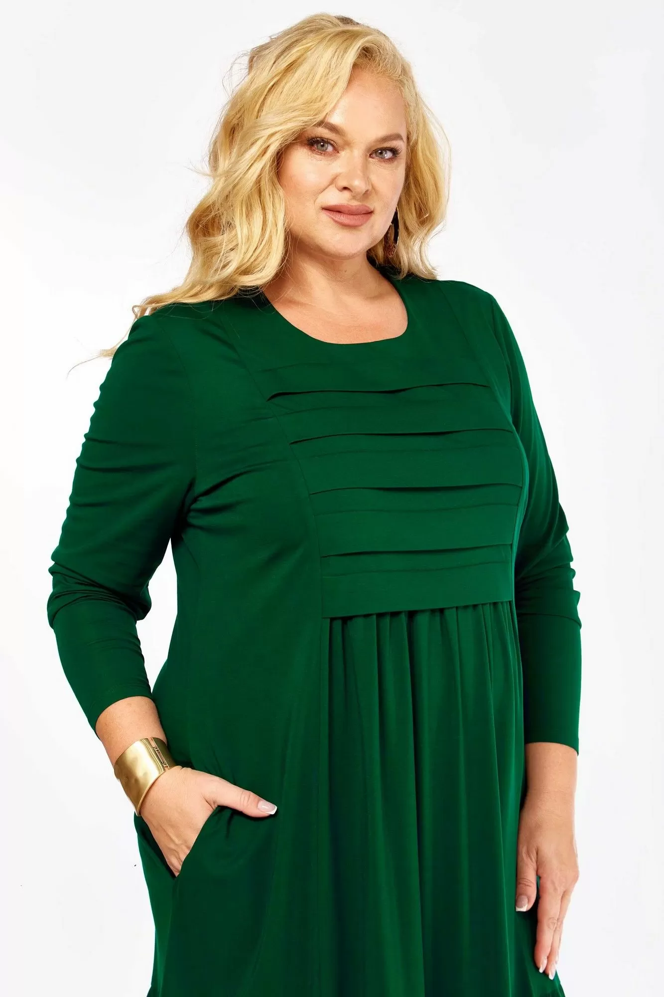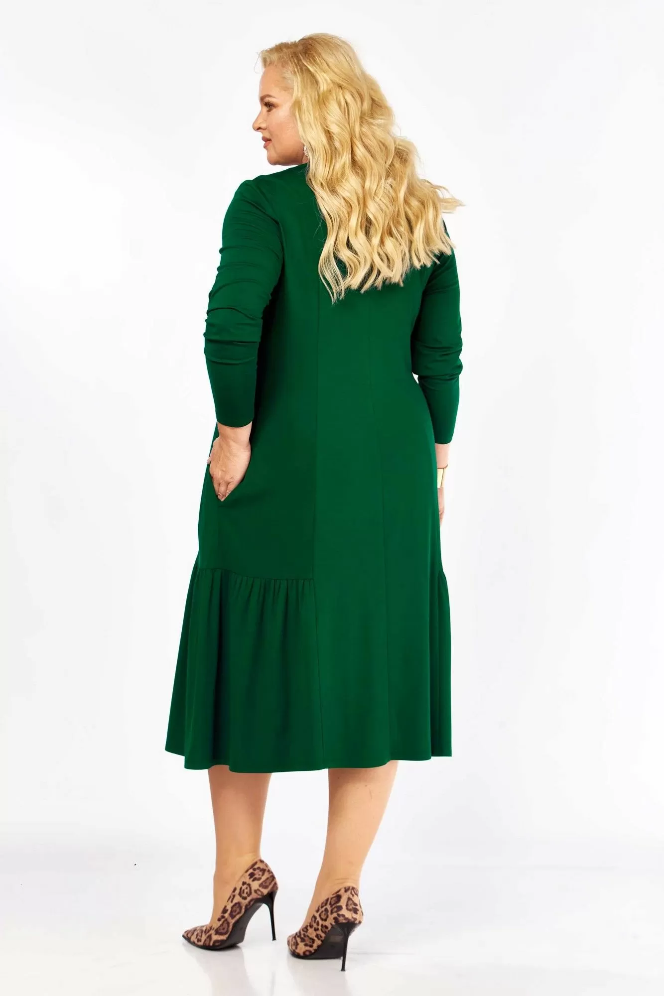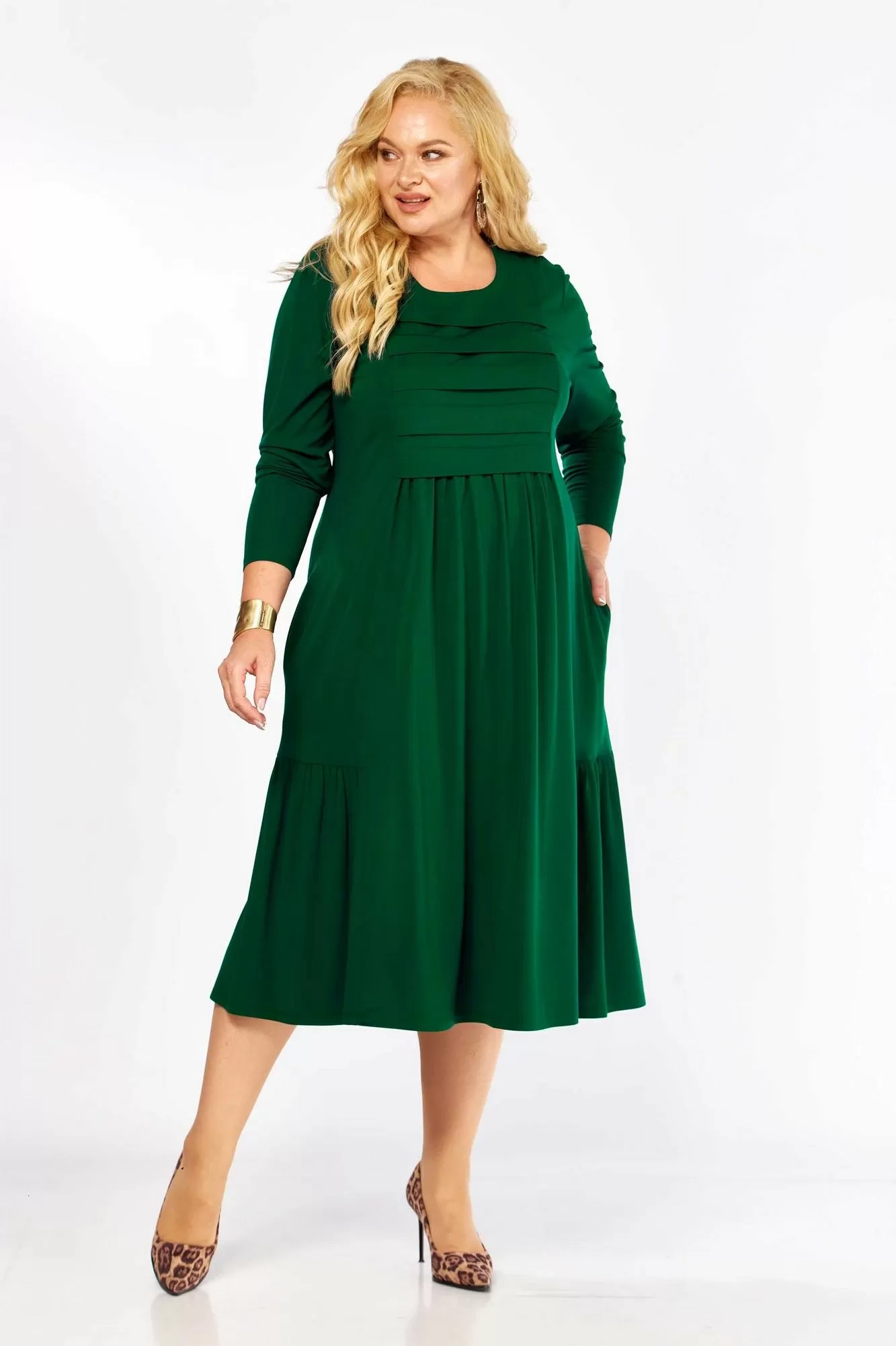 Платье женское А-образного силуэта, из трикотажного полотна. Горловина круглая, рукав длинный, одношовный. По переду кокетка лифа со складками, из-под которой сборка. По переду и спинке рельефы с подрезами по низу с воланами. Спинка с центральным швом.