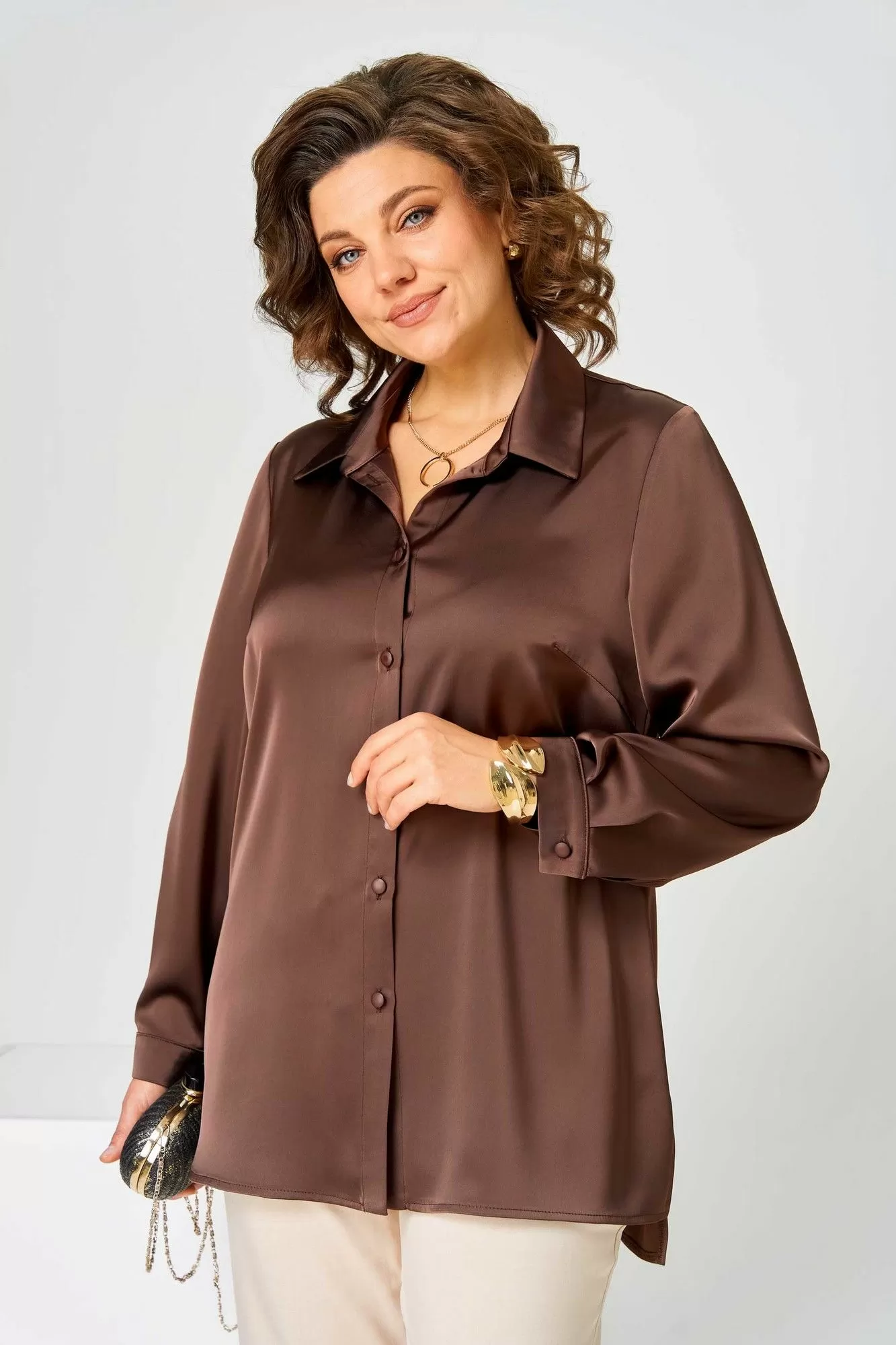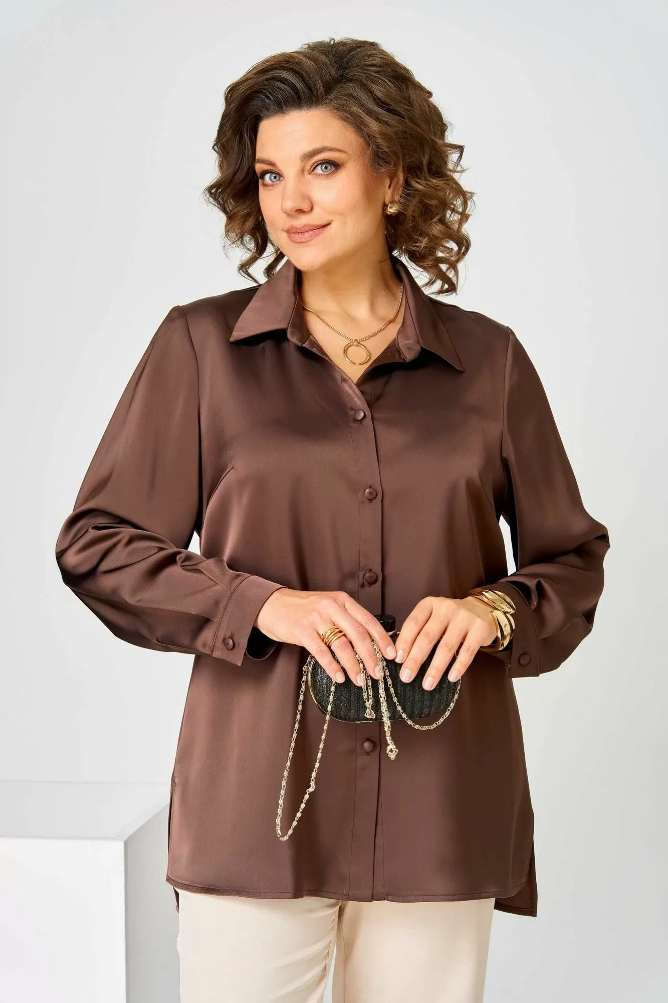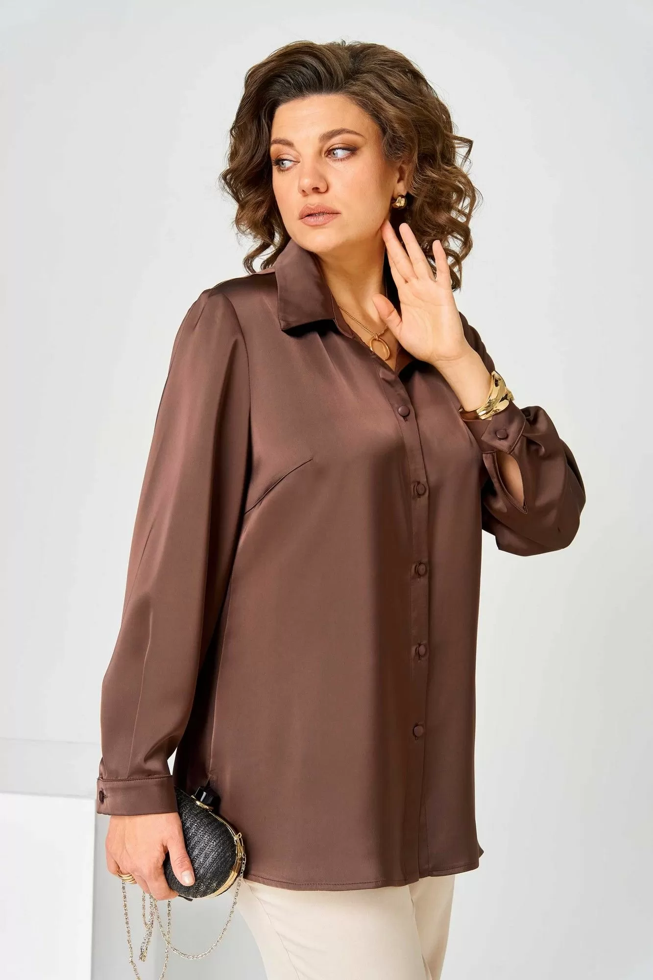 Блузка из атласной ткани с длинным рукавом и манжетом. Воротник мужской на стойке. Перед с нагрудными вытачками и центральной застежкой на пуговицы. Спинка свободная.