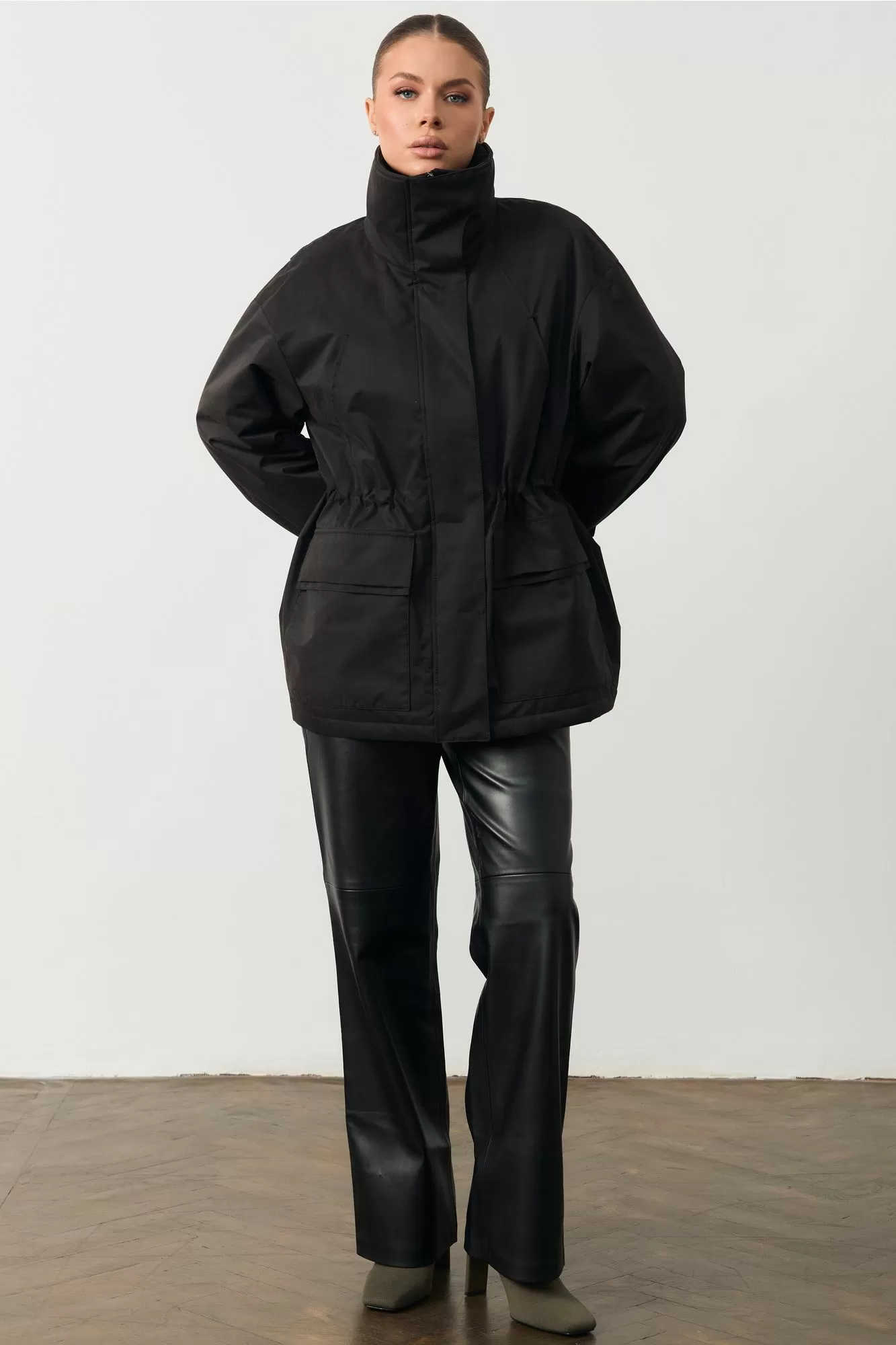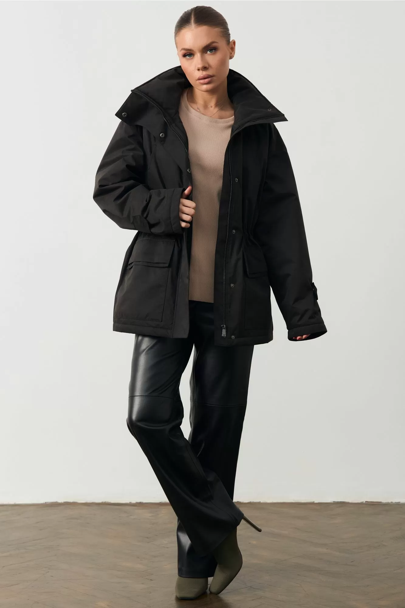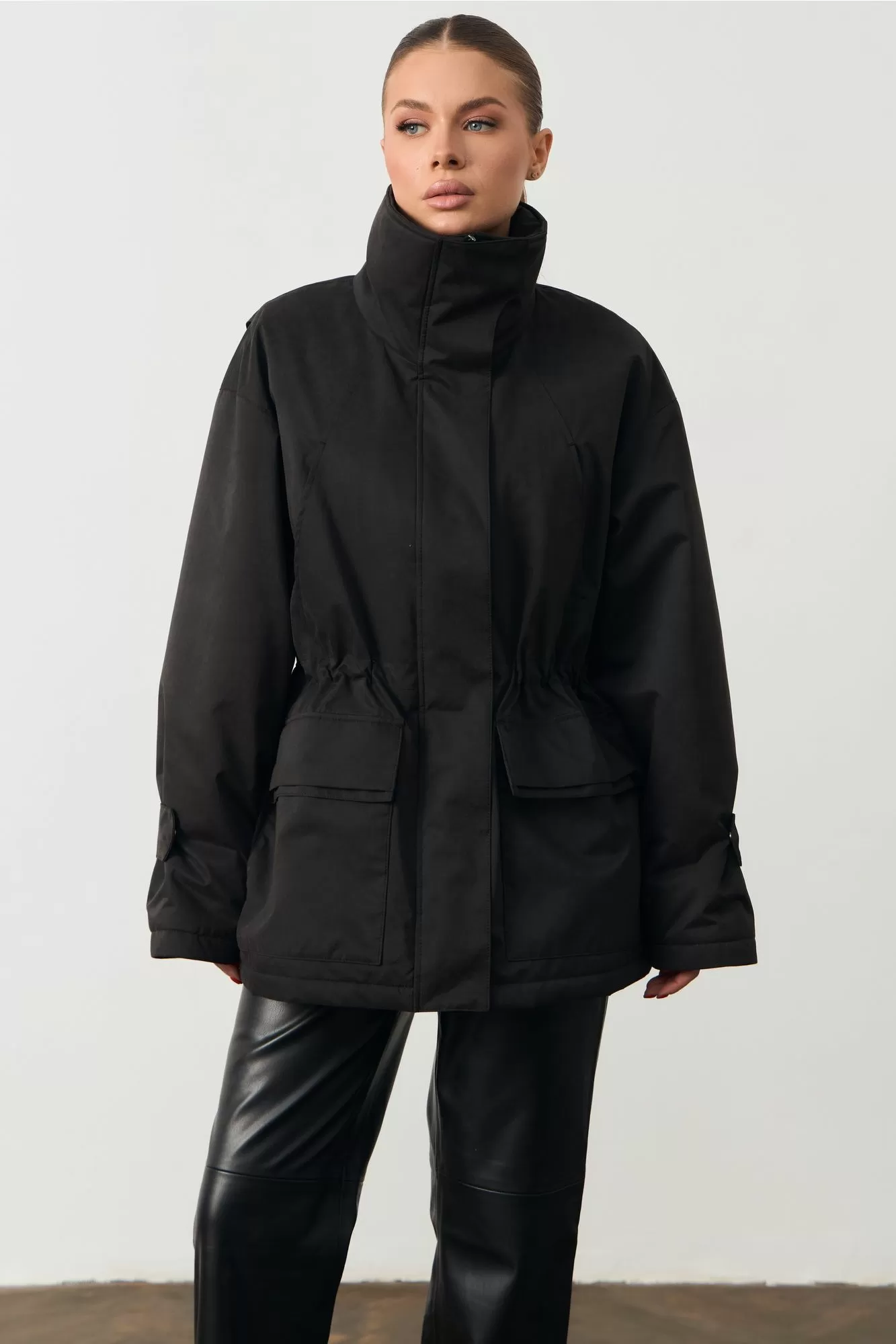 Женская куртка с высоким воротом. На поясе кулиска. Изделие прямого кроя. Длина изделия 74см; Длина рукава 75см.