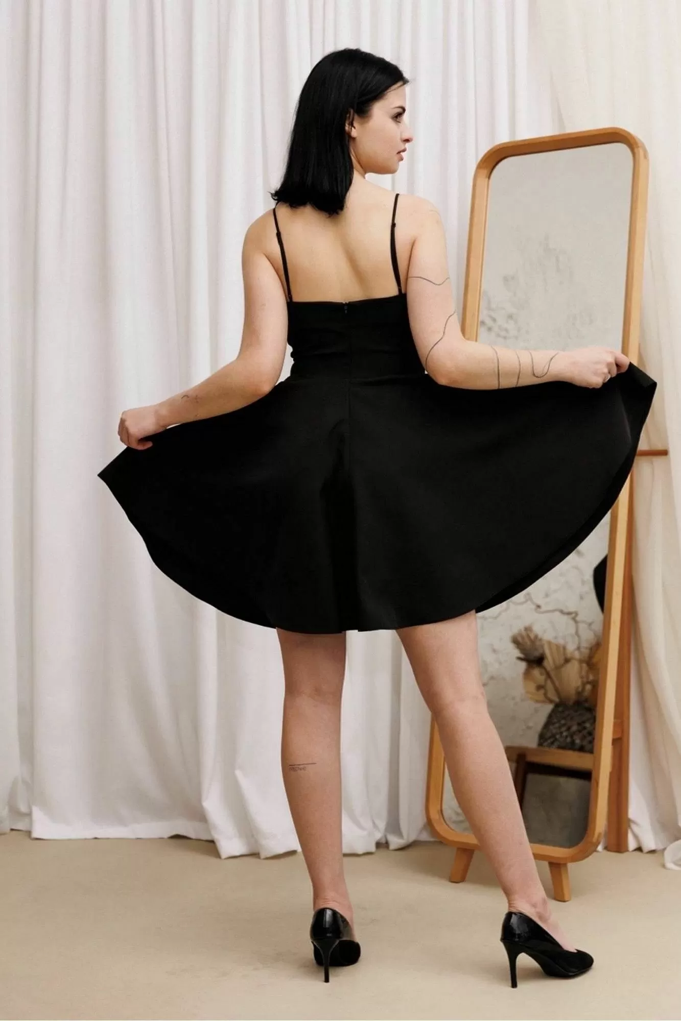 Платье полуприлегающего силуэта с открытым декольте. Чашки держат форму, т.к. усилены поролоном. Лиф поддерживают тонкие регулируемые бретели. В среднем шве спинки обработана потайная застежка-молния. Юбка полусолнце длиной 50 см.
