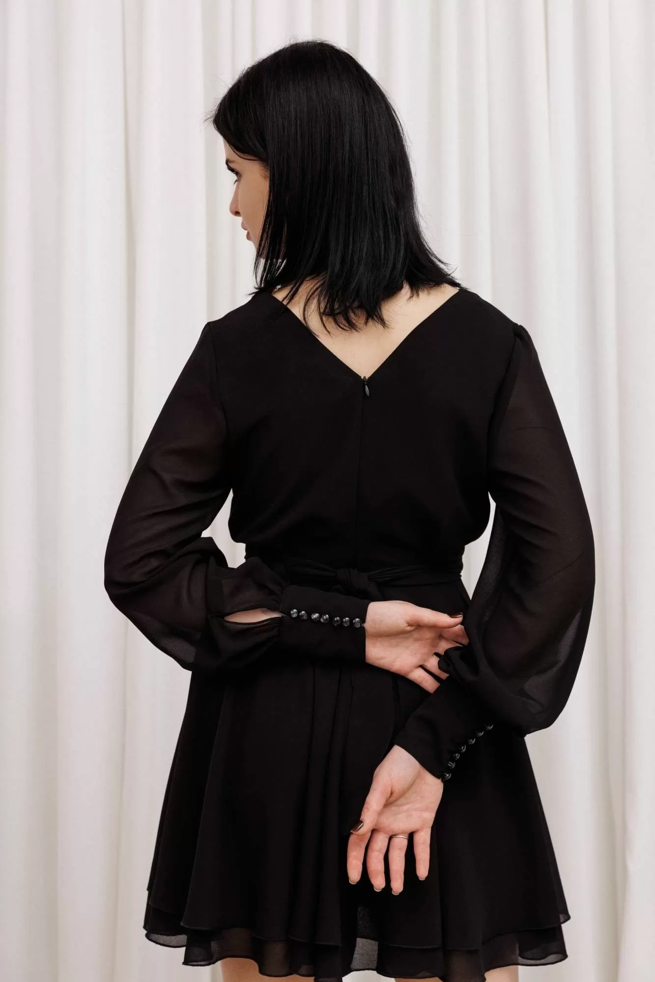 Легкое воздушное платье из креп-шифона с двумя юбками солнце разных длин. Лиф на запах с застроченными складками также двойной. Вырез по груди лежит комфортно и не распахивается. Длинный рукав украшают широкие манжеты с большим количеством навесных петель и аккуратных пуговичек. Длина нижней юбки 47 см