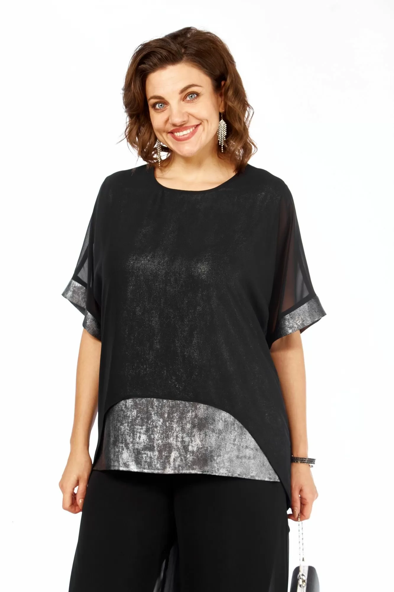 Нижняя часть блузы и манжеты верхней части выполнены из блузочной ткани цвета серебро с эффектом патины. Нижняя часть без рукавов. Проймы нижней части блузы обработаны косой бейкой.