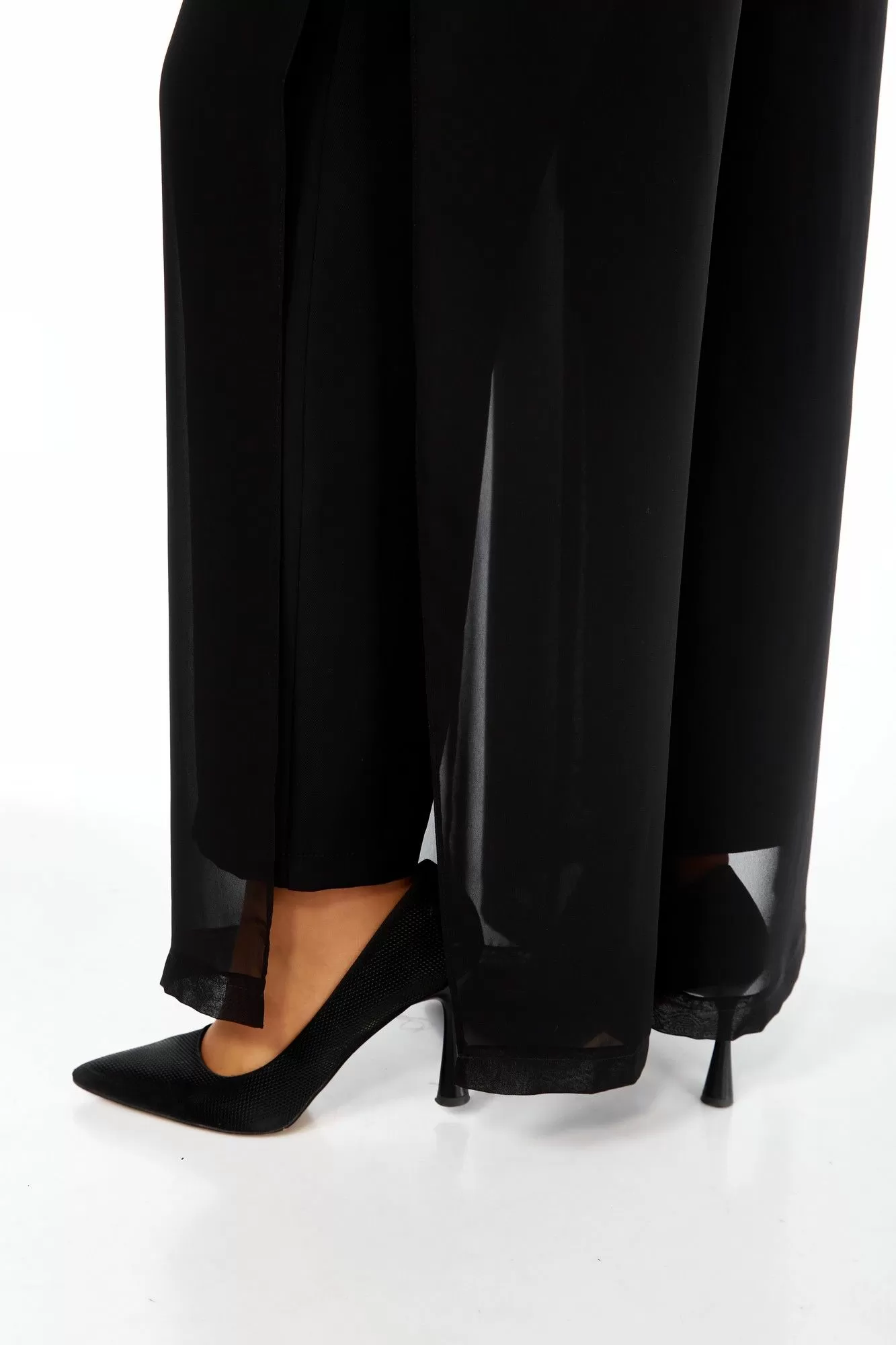 Брюки двойные широкие , соединены между собой притачным поясом с резинкой по кругу. Верхние брюки широкие длиннее нижних, выполнены из гладкого однотонного шифона, с высокими разрезами по бокам . Нижние брюки зауженные к низу , выполнены из гладкой струящейся плательно-костюмной ткани.
