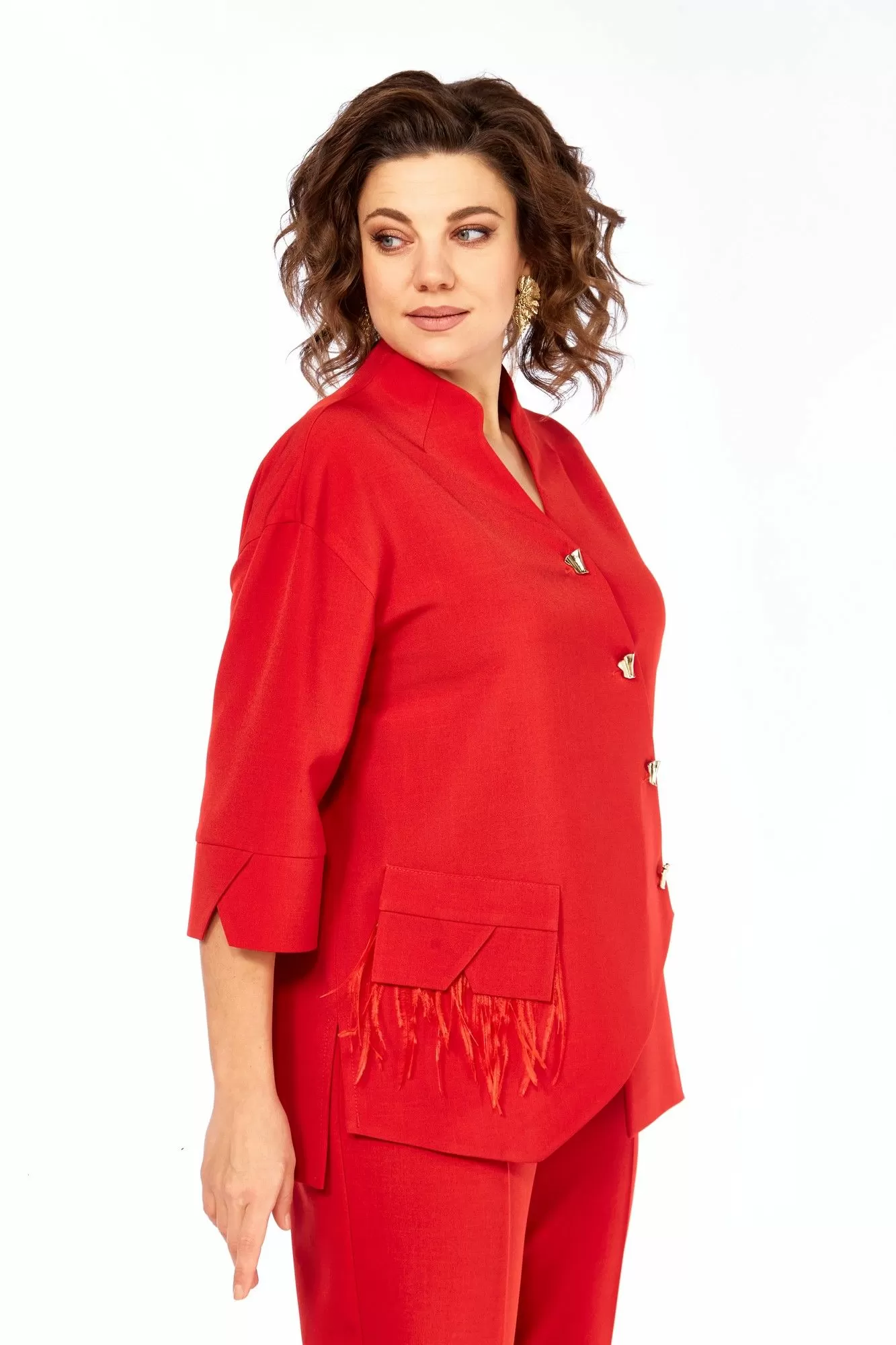 Жакет прямого силуэта с асимметричной застёжкой на 4 петли и пуговицы.Воротник-стойка цельнокроеный.Плечи спущены.Рукава длиной 3/4 одношовные,низ на притачных манжетах внахлёст. Спинка цельная.На переде клапан с декоративной тесьмой с перьями (для стирки рекомендуется снять).Низ переда фигурный.По бокам разрезы.Жакет без подкладки.