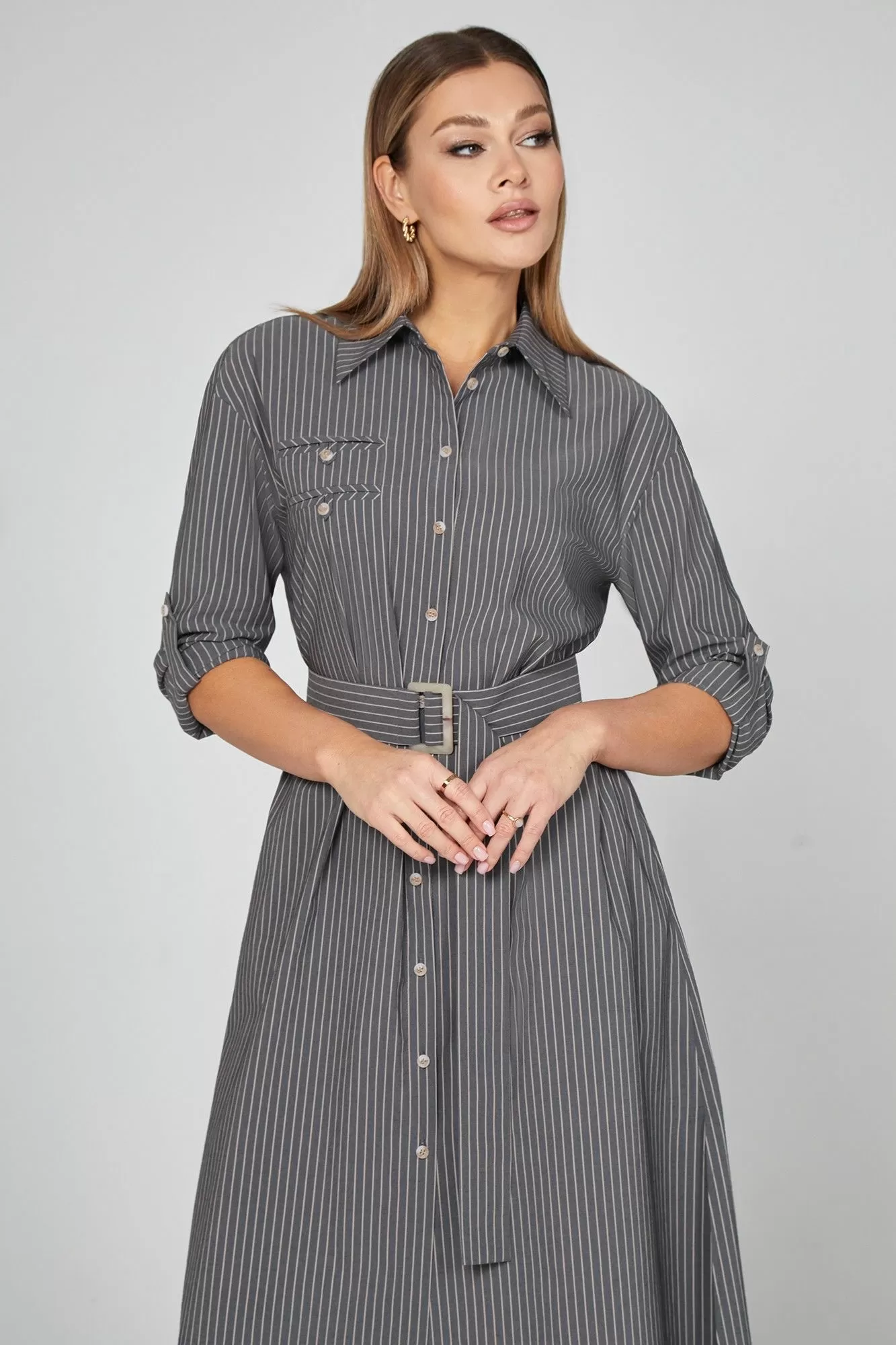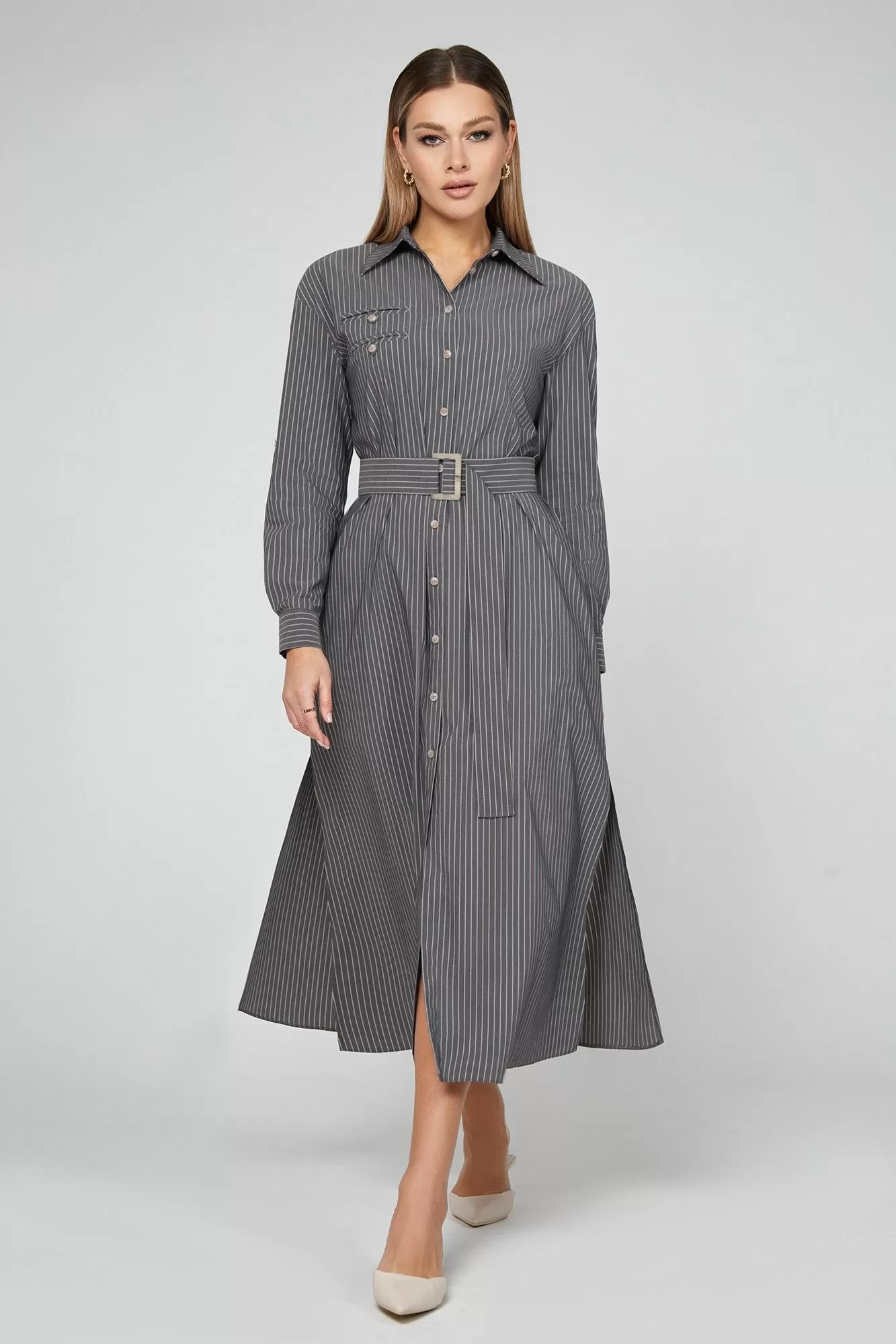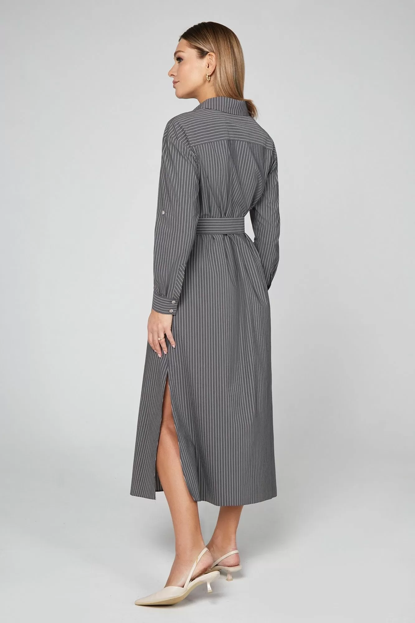 Это модное платье-рубашка с тонкими полосками,сочетает в себе шик и современность. Модная длина мидакси, разрезы в боковых швах и пояс,подчёркивающий талию- придают платью женственный характер. Рубашечный воротник добавляет образу грациозности, а застёжка на пуговицы по всей длине позволяет регулировать глубину выреза декольте. Нагрудные карманы-обманки и длинные рукава с манжетами, которое при желании можно подвернуть и зафиксировать при помощи пат и пуговиц - завершают дизайн. Для придания комфорта использована приятная хлопковая ткань производства Голландии. Лучше не бывает!