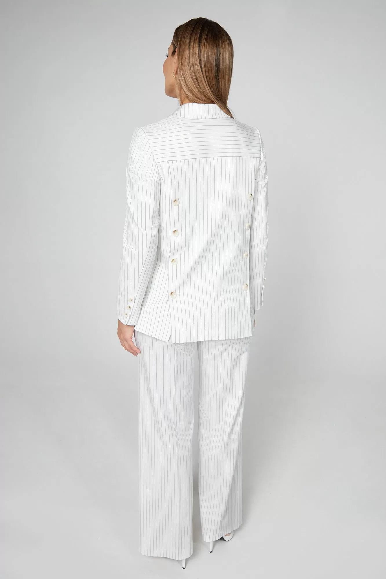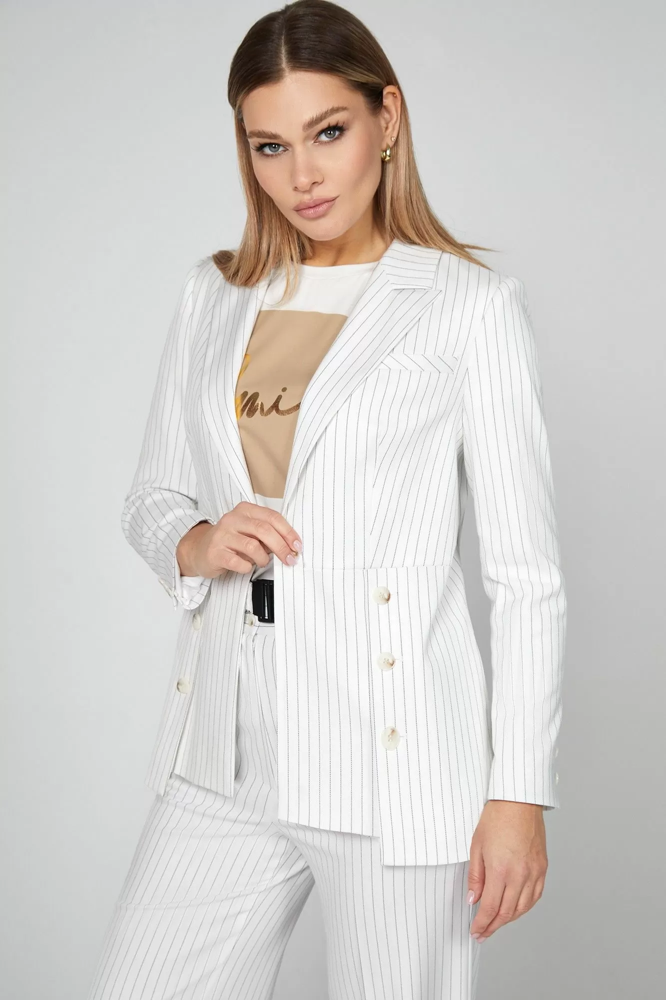 Легкий и повседневный вариант для весны! После долгих зимних месяцев с первыми теплыми днями хочется легких нарядов. Соответственно, этот светлый пиджак в тонкую полоску является обязательным элементом гардероба модницы, который образует шикарный ансамбль с соответствующими брюками широкого кроя. Эта модель из поливискозной испанской ткани спрямлённого силуэта впечатляет интересными элементами в виде отделочных шлиц с пуговицами по переду, спинке и рукавам , застежкой на одну пуговицу в шве по линии талии и необычной задумкой линии низа. А также дополнен классической формой лацканов с отложным воротником и функциональными карманами в боковых швах. На подкладке.