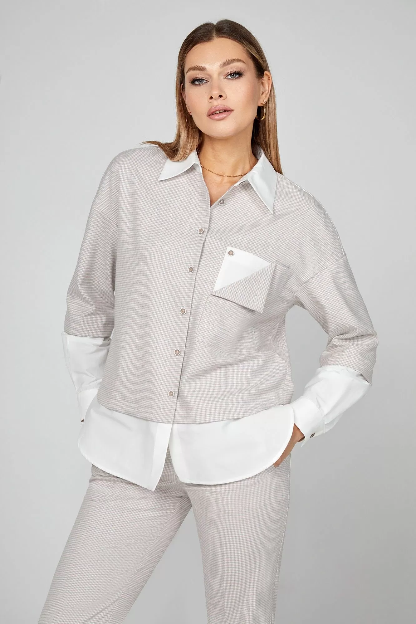 Эта стильная блузка свободного кроя, с оригинальной отделкой из однотонной хлопковой ткани гармонично дополняющей дизайн основной ткани с классическим узором «гусиная лапка»,позволит вам создать актуальный и комфортный образ. Модель с отложным воротником-стойкой, застёжкой на петли и пуговицы, со спущенной линией плеча с притачными рукавами с манжетами и фигурной линией низа разной длины переда и спинки, . Интересный карман по переду становится ключевой фишкой дизайна. В пару к блузке можно подобрать брюки из той же линейки.