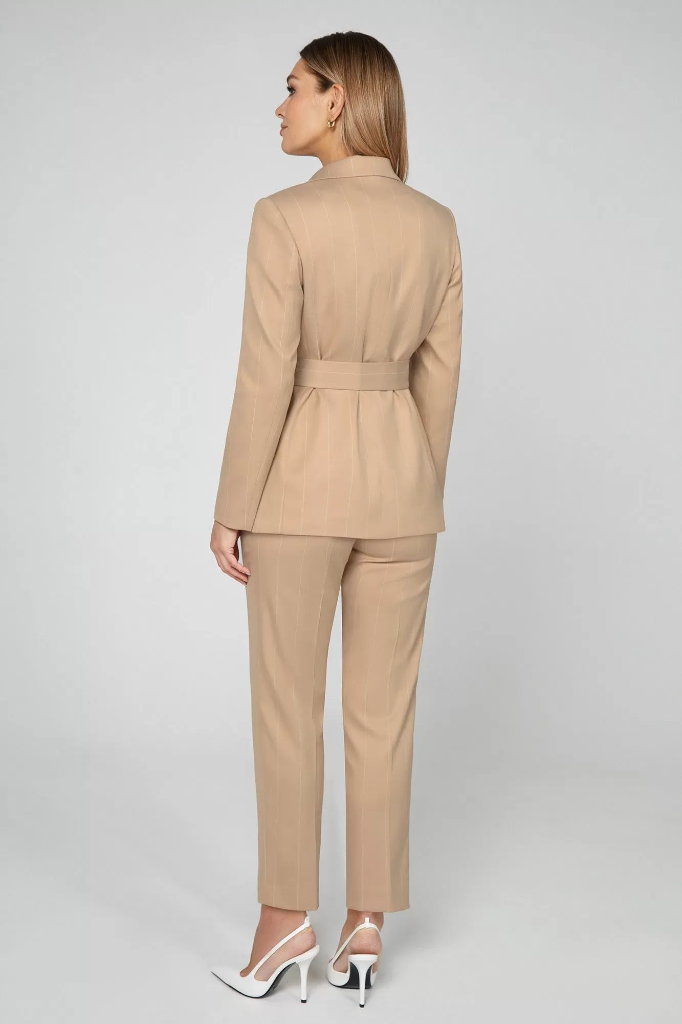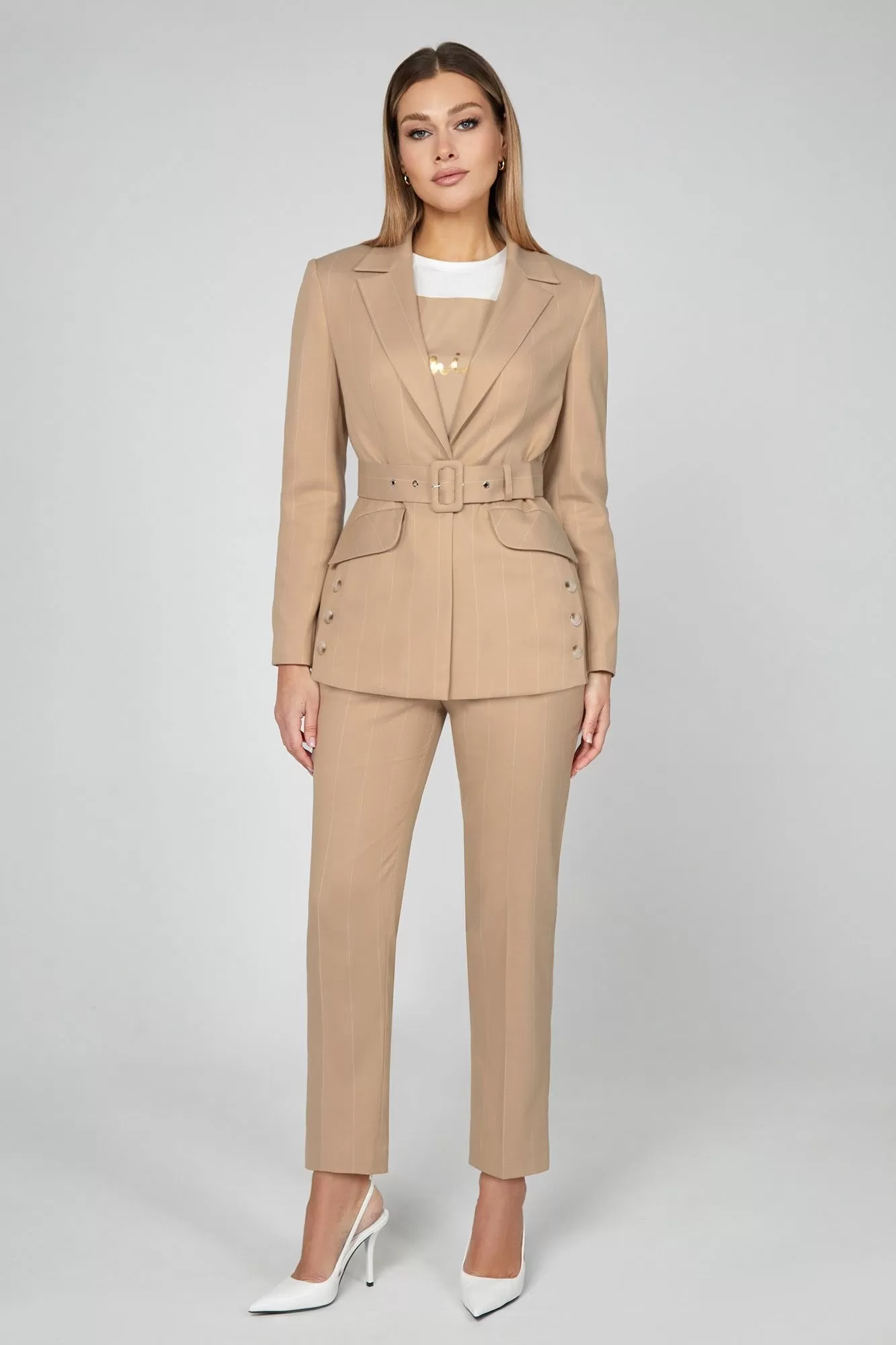 Жакет полуприлегающего силуэта с застёжкой на петлю-пуговицу станет отличным решением для офисного гардероба. Приятная ткань в полоску с добавлением вискозы прекрасно держит форму, геометричные лацканы добавляют образу элегантности и строгости, карманы с клапанами- функциональности, а отделочные шлицы с пуговицами добавляют модели индивидуальности. Рукава втачные двухшовные. Средняя длина дарит возможность создавать с этим жакетом многообразные комплекты. Широкий пояс в тон позволяет сделать акцент на линии талии, подчеркивая ваше изящество. На подкладке.