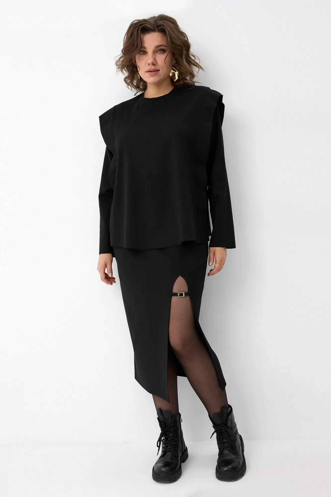Свитшот прямого кроя с цельной декоративной планкой по передней и задней части. Благодаря конструктивным особенностям модель делает акцент на линии плеча и создаёт дополнительную вертикаль, что невероятно стройнит и вытягивает силуэт! Горловина обработана обтачкой с открытым срезом. Также, низ рукава и низ изделия имеют открытые срезы. На плечах - металлические декоративные зажимы золотистого цвета.