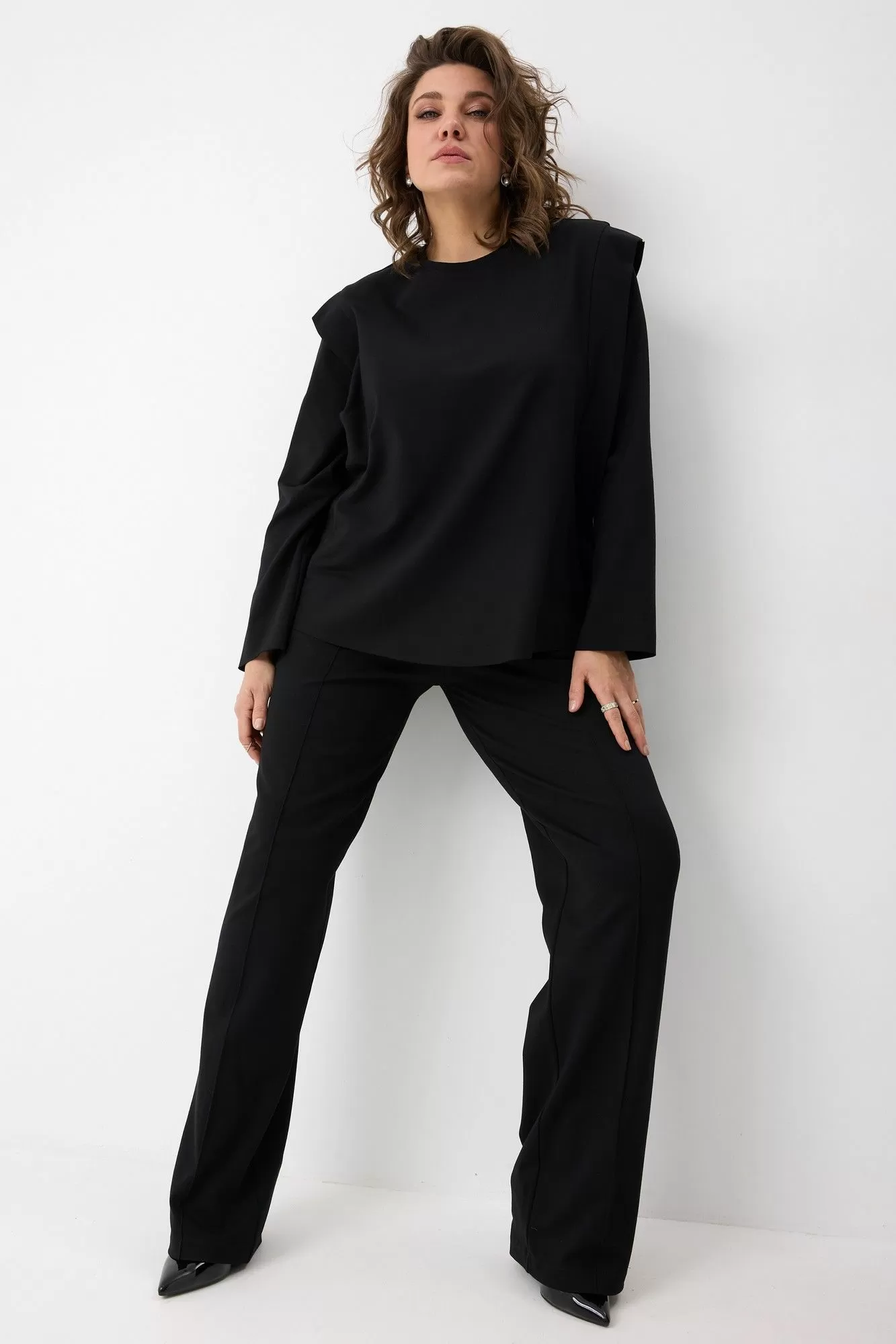 Лонгслив свободного кроя с цельной декоративной планкой по передней и задней части. Благодаря конструктивным особенностям модель делает акцент на линии плеча и создаёт дополнительную вертикаль, что невероятно стройнит и вытягивает силуэт! Горловина обработана обтачкой с открытым срезом. Низ рукава и низ изделия имеют открытые срезы. На плечах металлические декоративные зажимы золотистого цвета.
