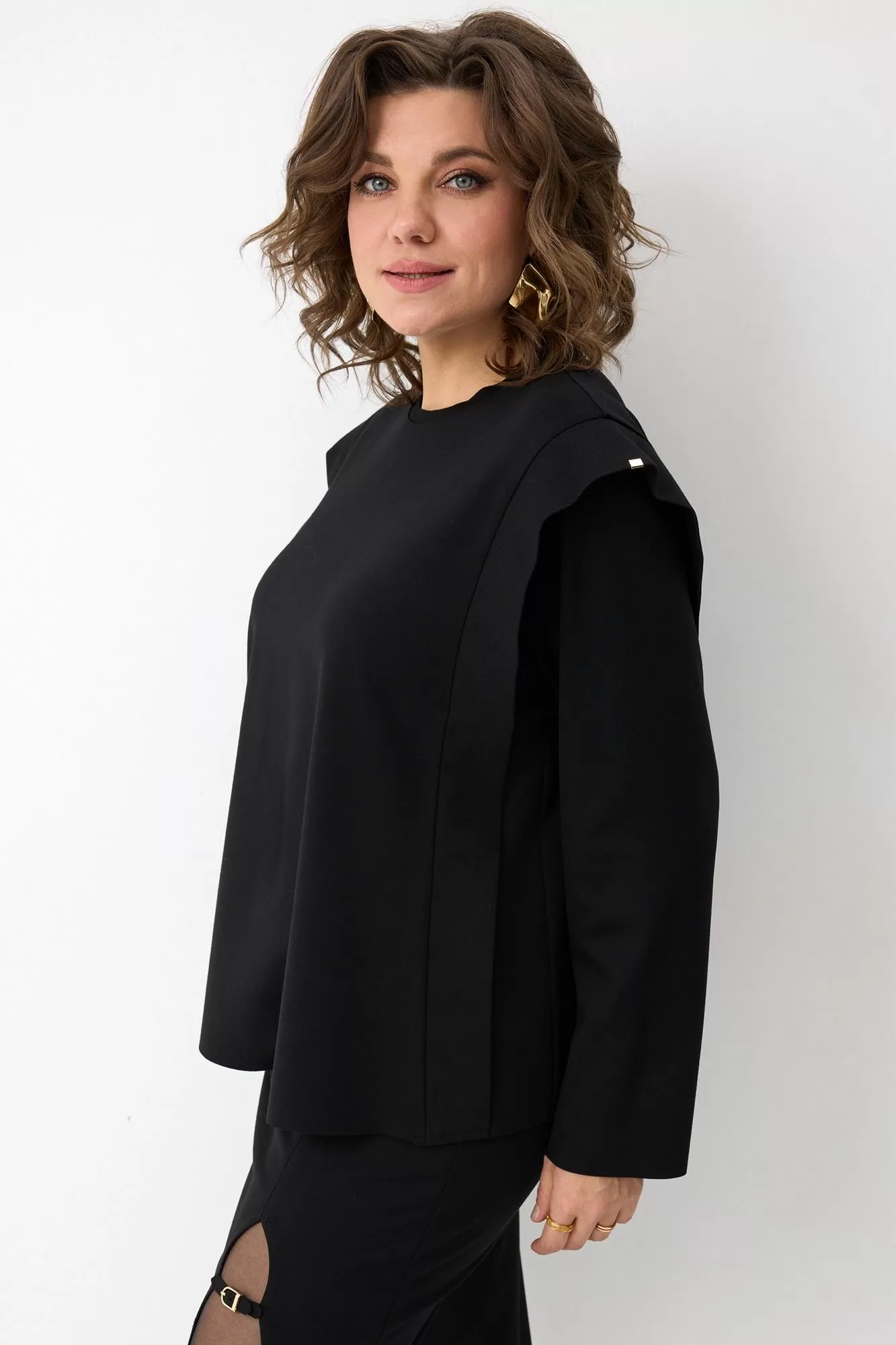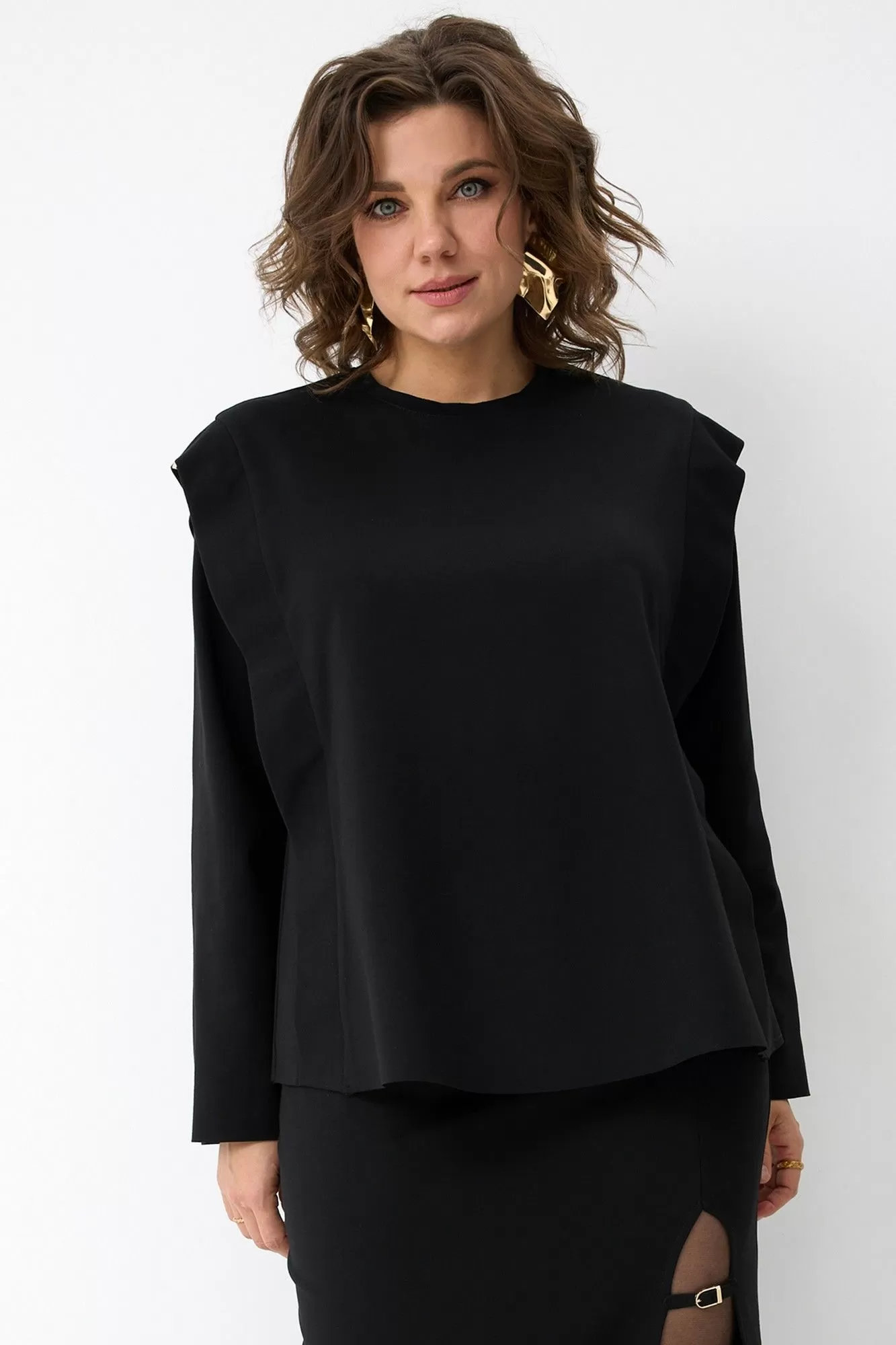 Лонгслив свободного кроя. Горловина обработана обтачкой с открытым срезом. Низ рукава и низ изделия имеют открытые срезы. На плечах металлические декоративные зажимы золотистого цвета.