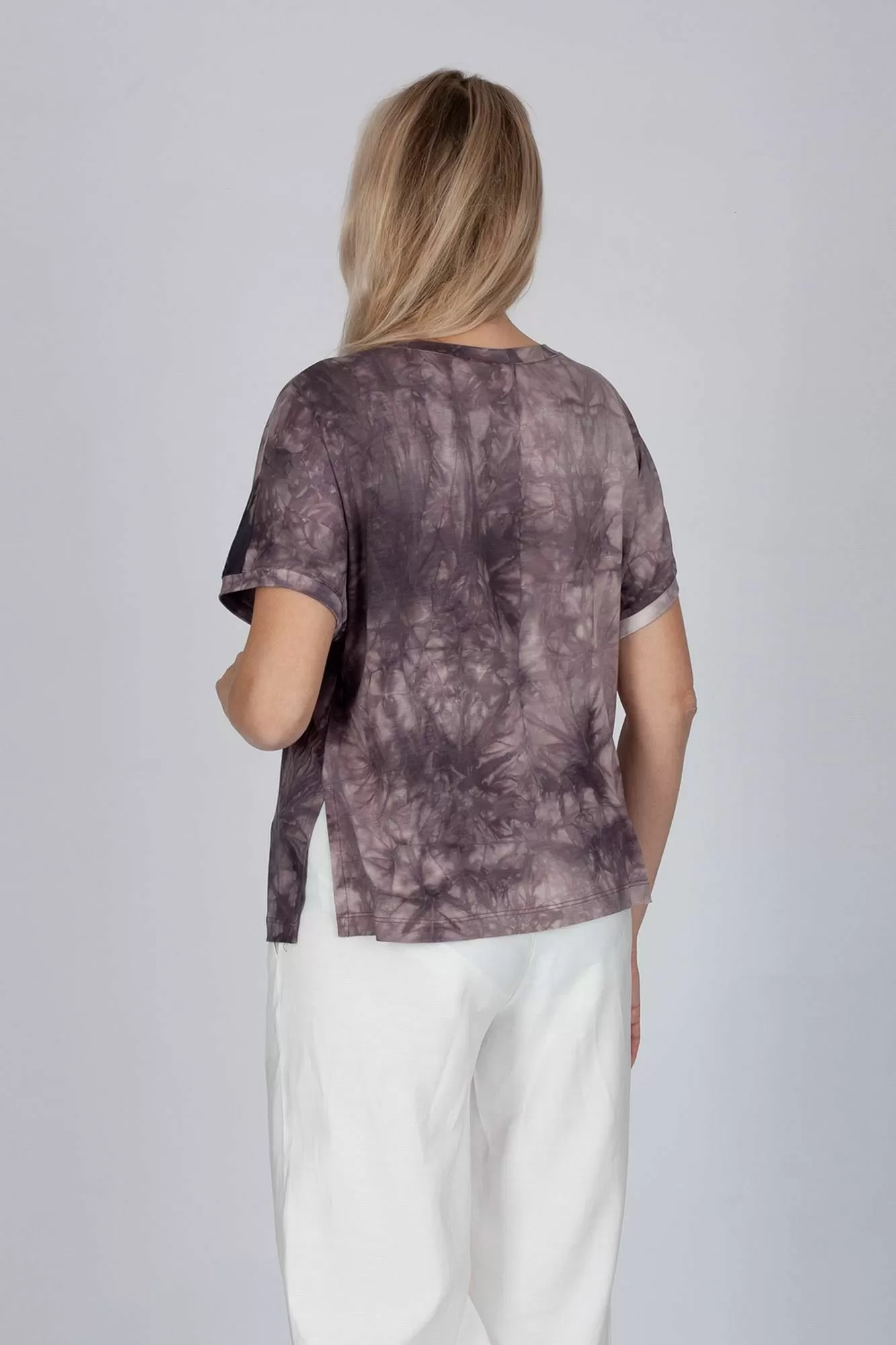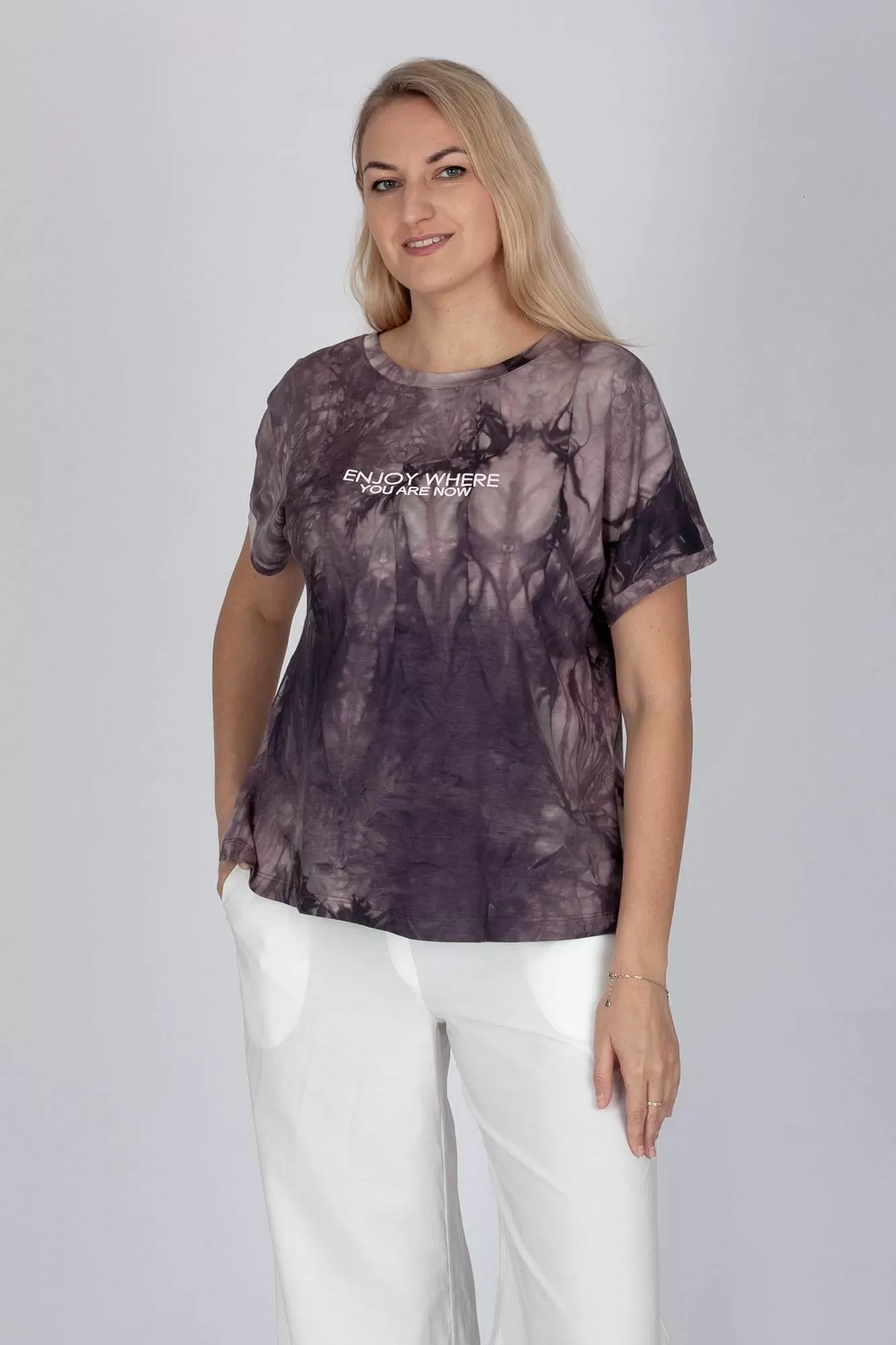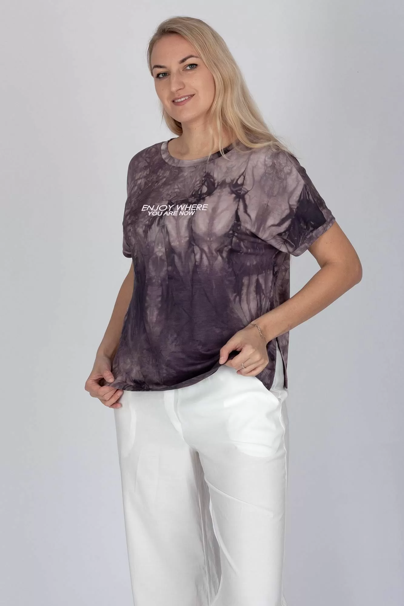 Трендовая фуфайка, короткий рукав-кимоно, изготовлена из трикотажного вискозного полотна в технике батик. На груди монохромная печать.