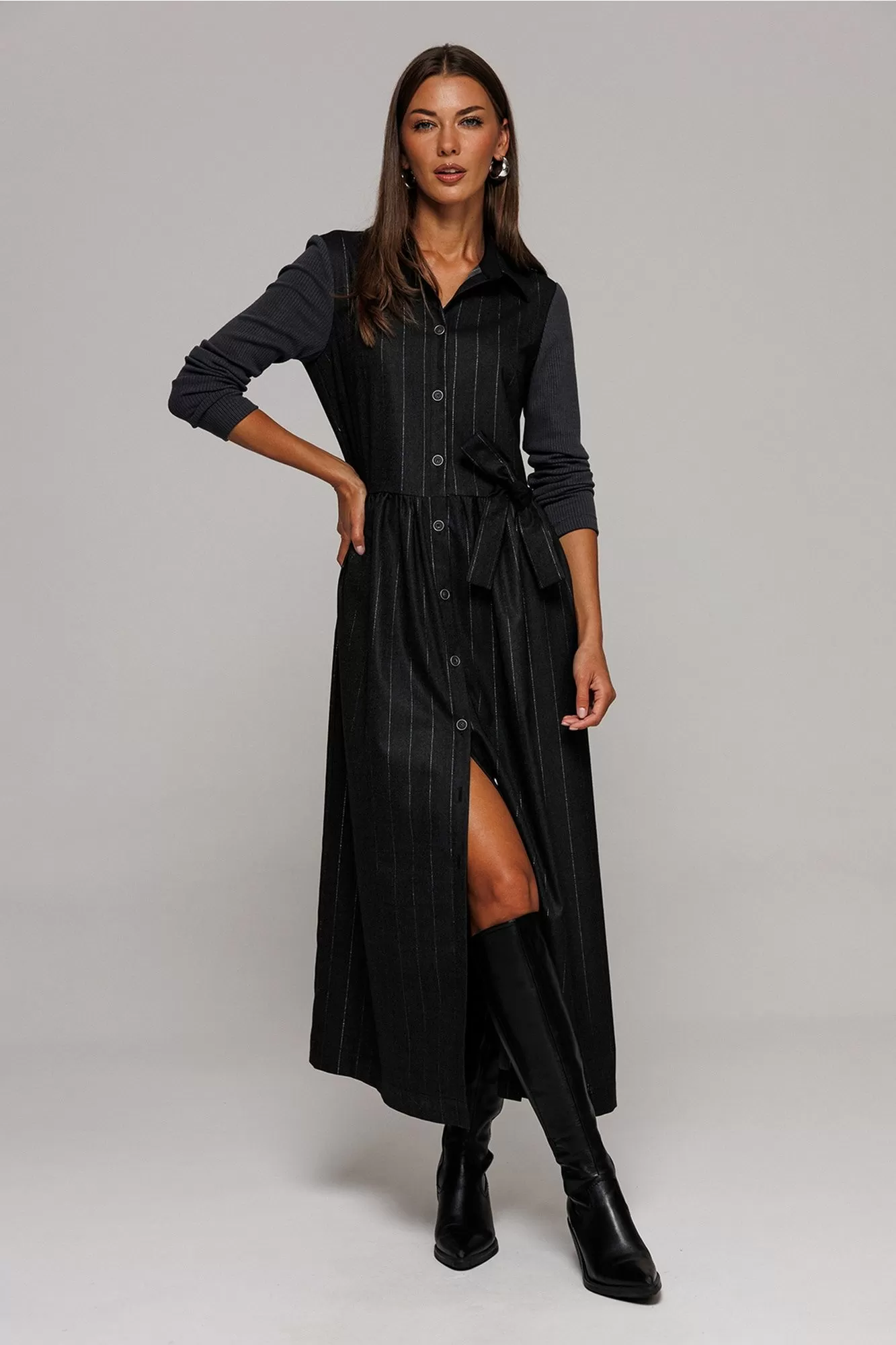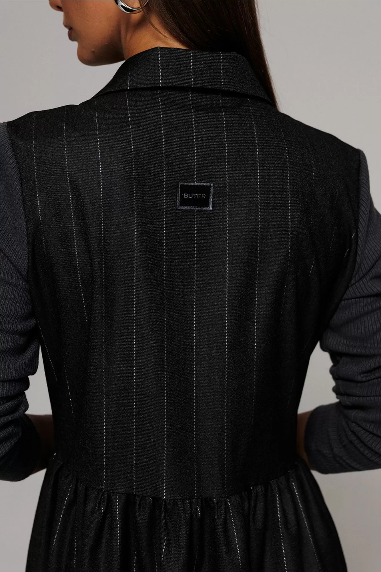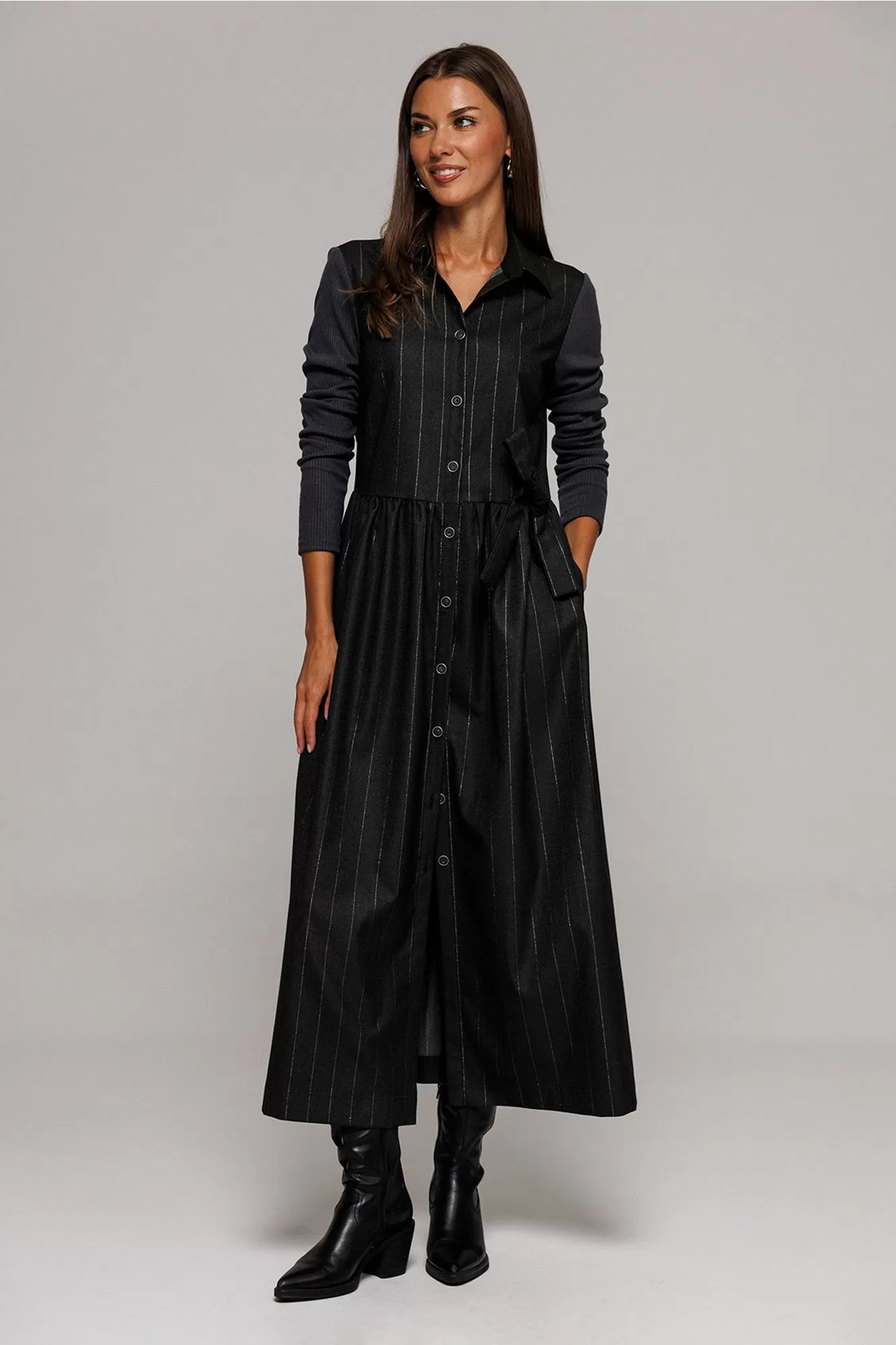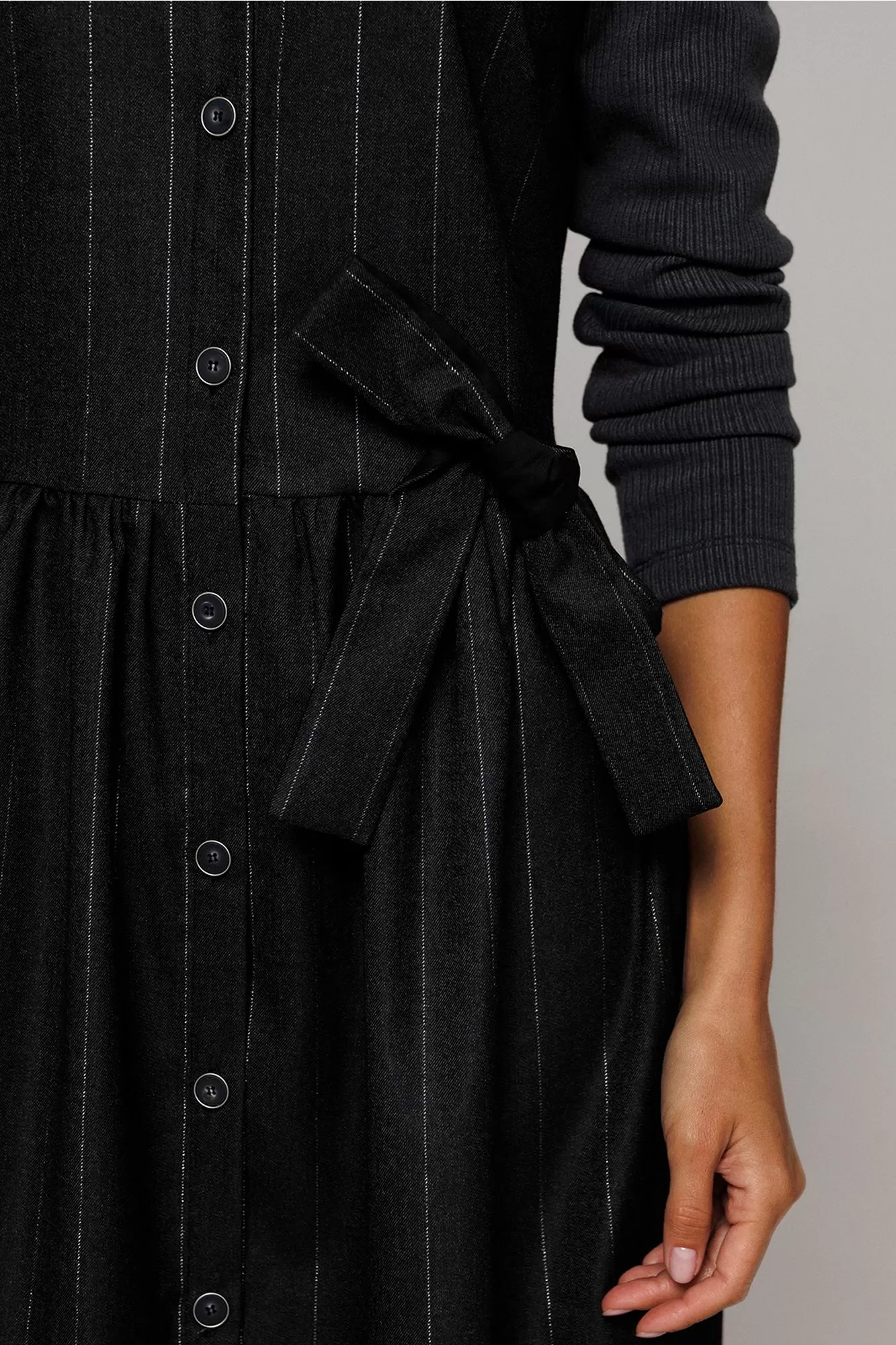 Платье длинное из костюмной ткани с втачным длинным одношовным трикотажным рукавом. Полочка с центральной застежкой на петли пуговицы и с нагрудными вытачками. По спинке нашивка "BUTER". Платье отрезное по линии талии и со сборкой по шву притачивания низа. Воротник рубашечный отложной на стойке. По линии талии бант из основной ткани. Платье без подкладки.