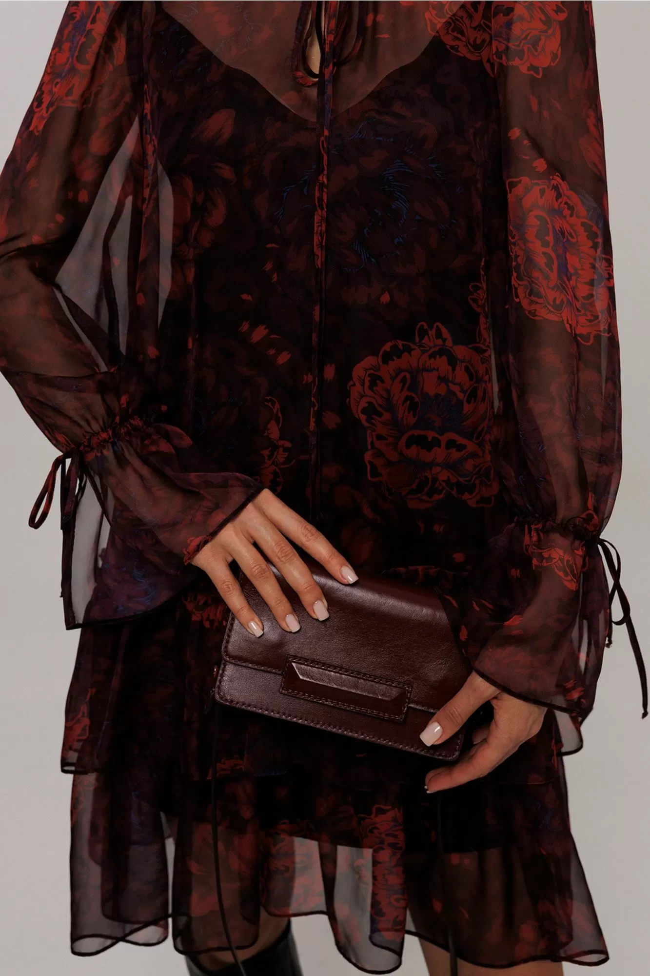 Платье шифоновое А-силуэта. Втачной длинный рукав со сборкой по окату и внизу на завязке. Полочка и спинка с притачными слегка присборенным воланом с рюшей. Воротник стойка-рюша и вырезом каплей по переду на завязке. Платье на подкладке.