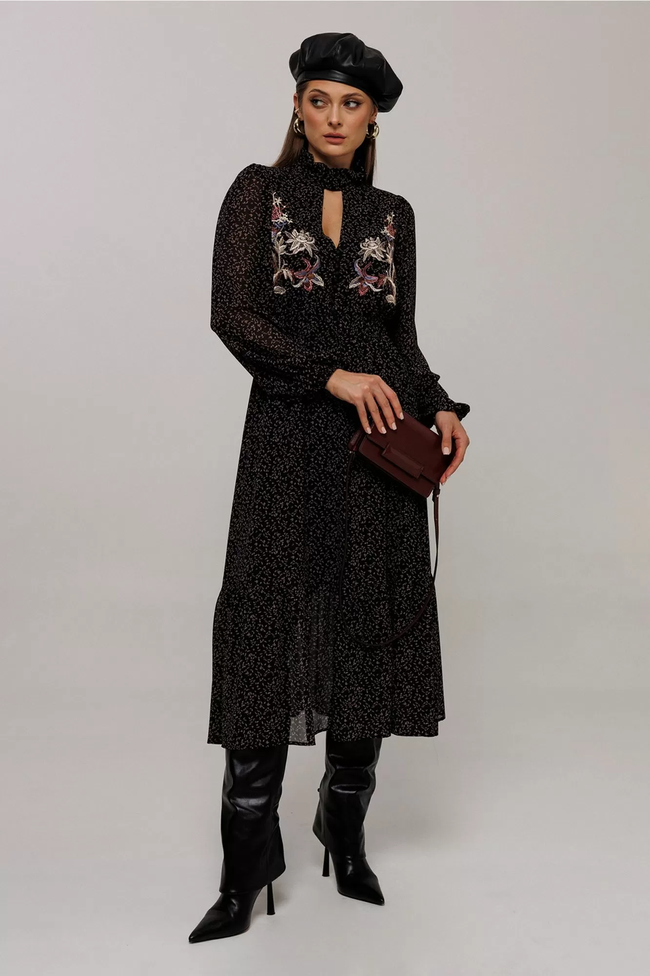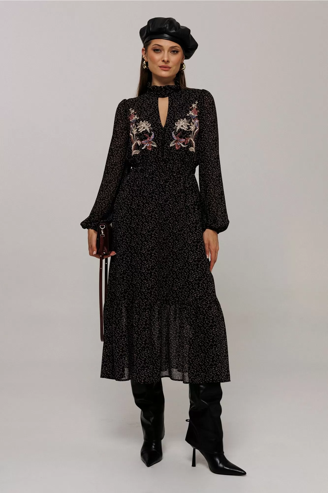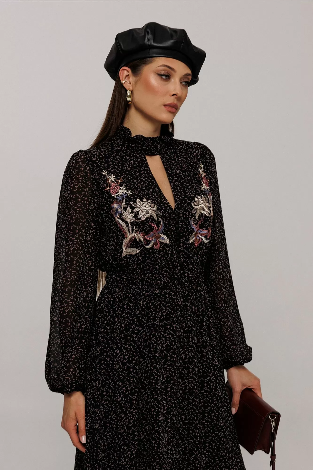 Платье полуприлегающего силуэта отрезное по линии талии, нижняя часть расширена к низу. Платье с втачным рукавом со сборкой по окату и внизу на резинке. Лиф с V-образным вырезом и имитацией центральной застежкой на пуговицы. По спинке и переду выставка на талии с резинками и по низу платья волан. По горловине стойка с рюшей и застежкой на навесную петлю пуговицу на спинке. Платье на подкладке.