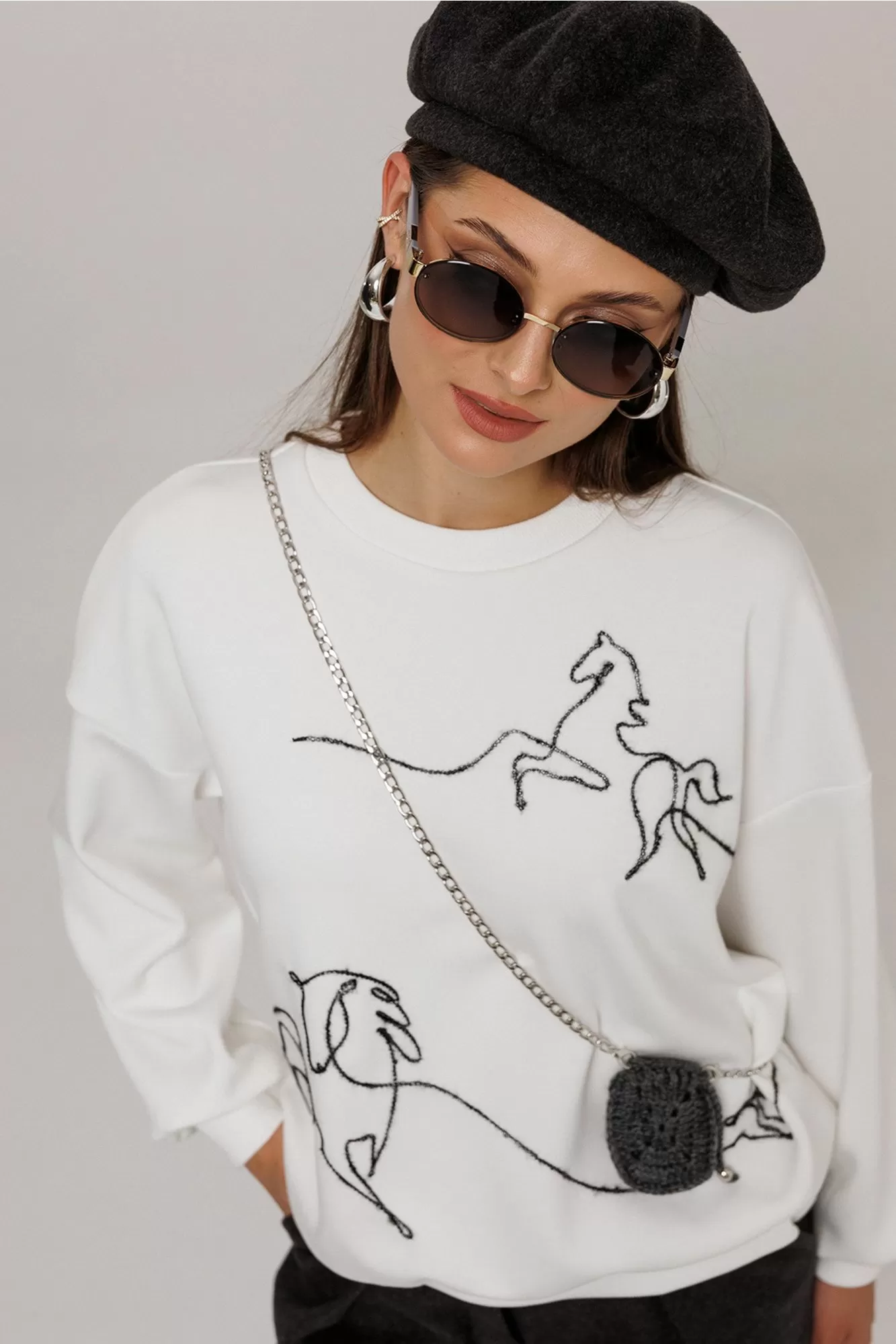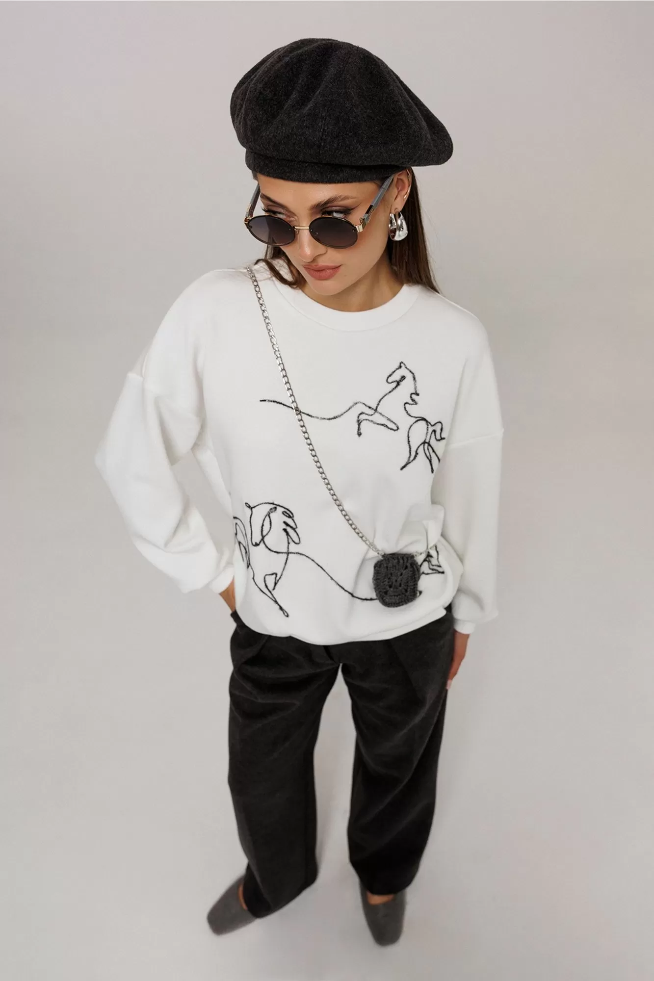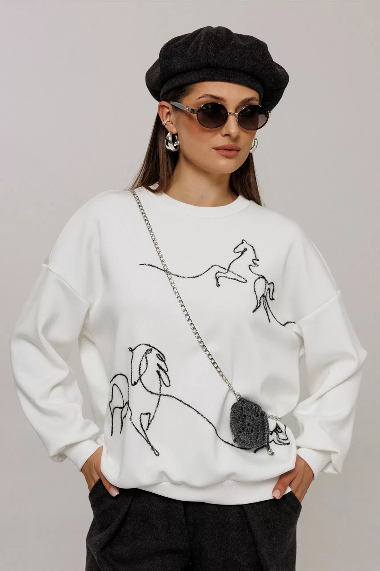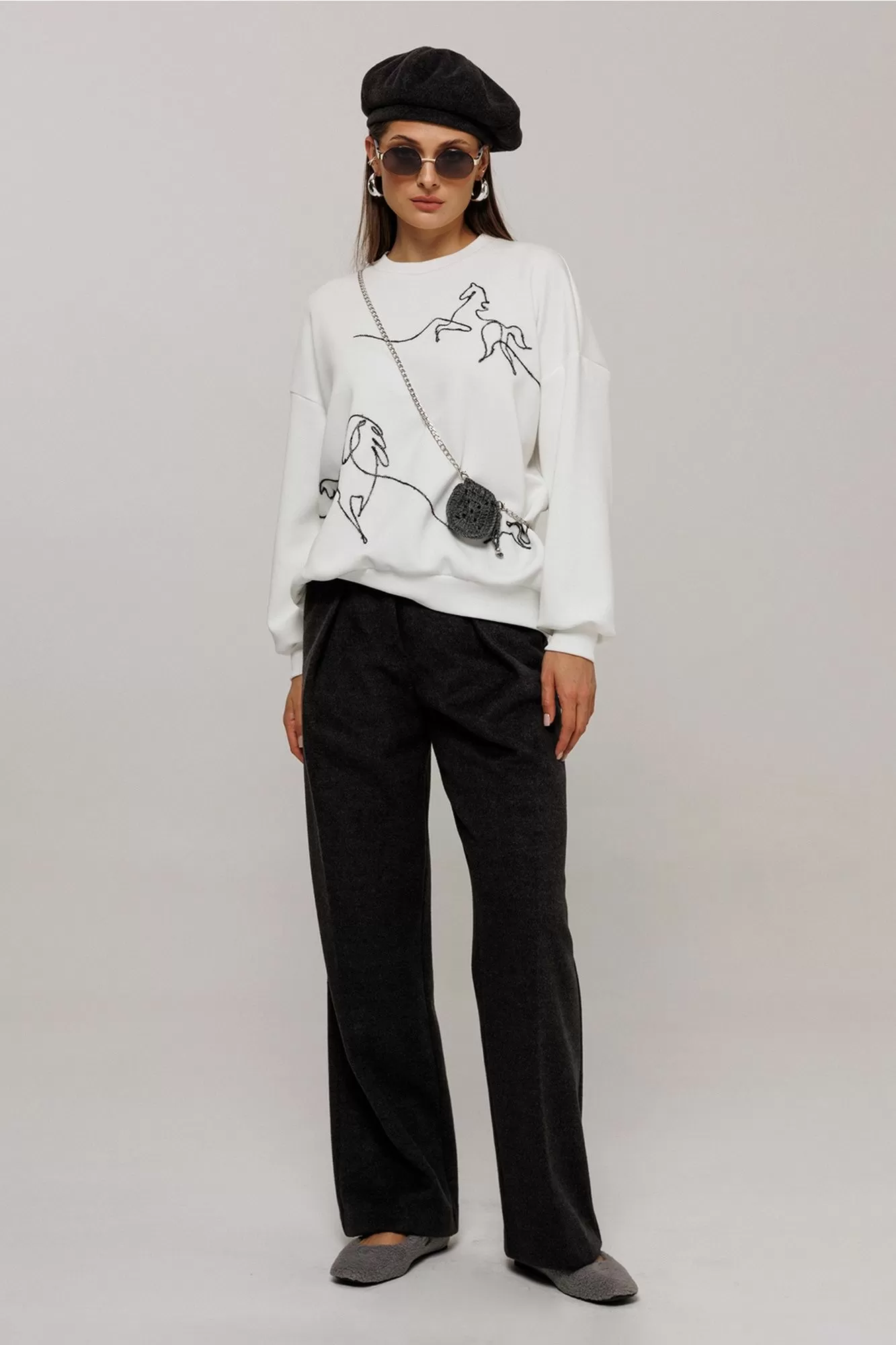 Джемпер из технологичного трикотажного полотна с эффектом peach. Прямого силуэта с втачным рукавом и спущенной линией плеча, с манжетой из отделочной ткани по низу рукава. По переду вышивка декоративным шнуром "Кони". По горловине и низу изделия притачная планка из отделочной ткани.