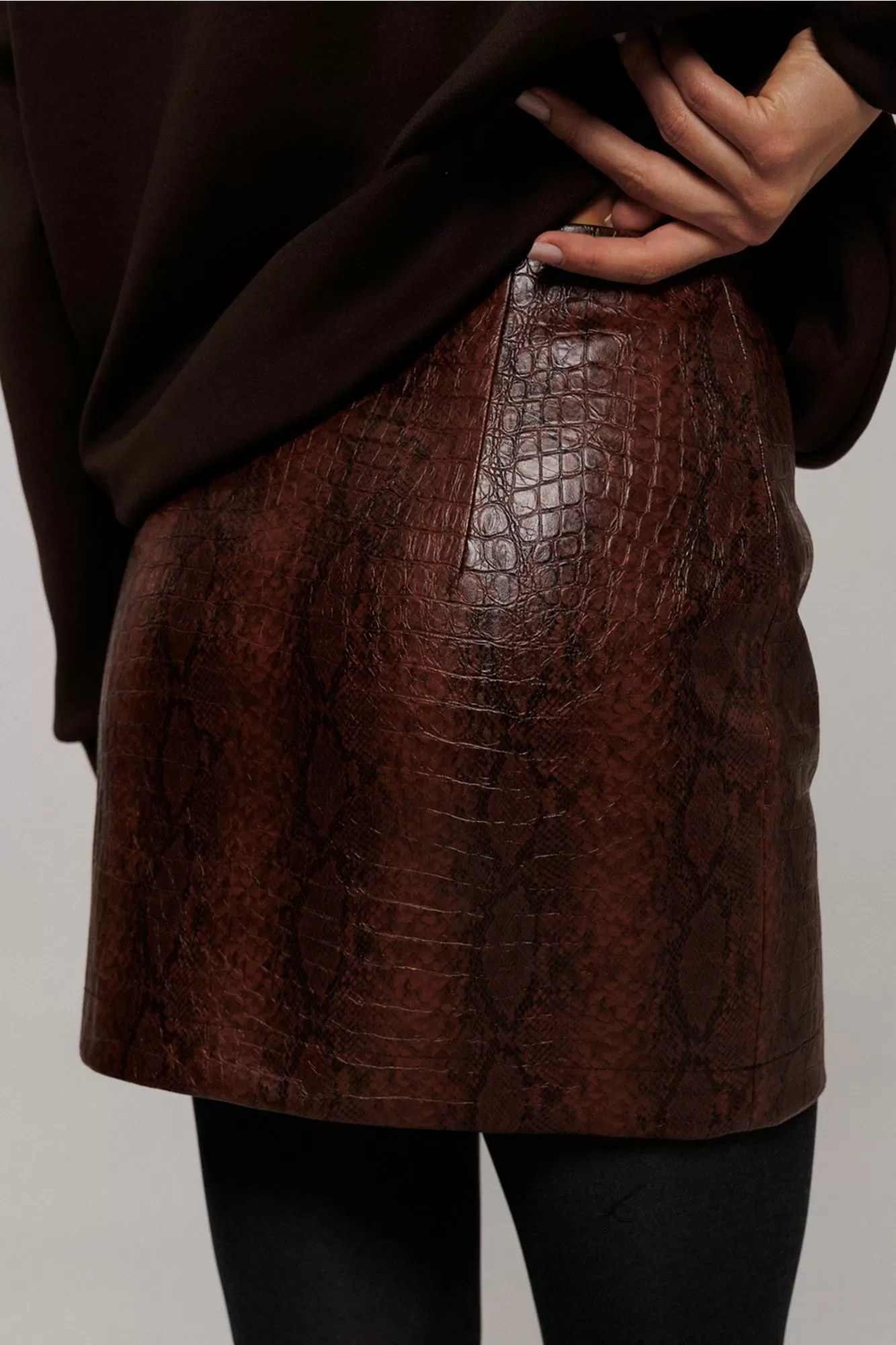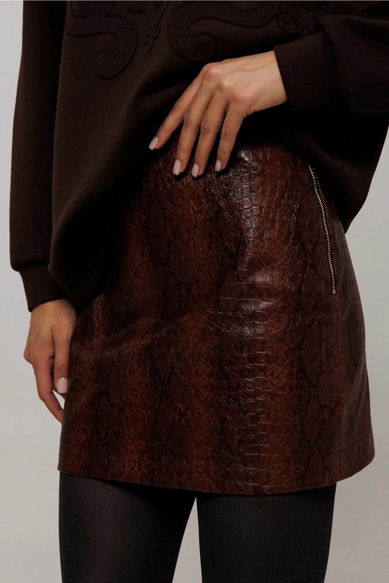 Юбка А-образного силуэта из эко-кожи, вверху на обтачке. С застежкой в боковом шве на металлическую тесьму-молнию. По задней половинке юбки вытачка. Юбка без подкладки.