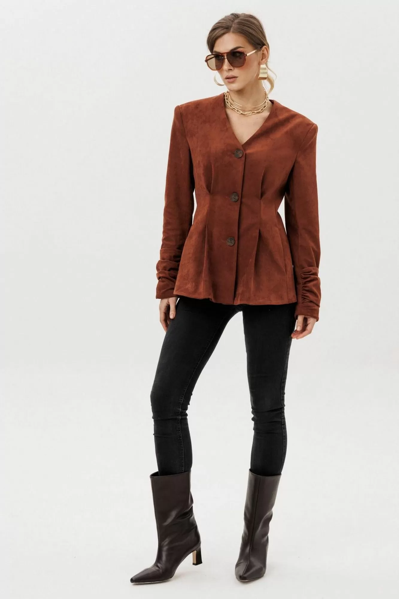 Жакет прилегающего силуэта с центральной бортовой застежкой на 3 прорезных петли и пуговицы. Жакет выполнен из искусственной замши. Перед со складкой застроченной на уровне талии, с бочком. В шве притачивания бочка обработан карман “ в швах”. Спинка со складками ,застроченными на уровне линии талии. Рукава втачные двухшовные длинные с накладной деталью со сборкой внизу верхней части рукава. Вырез горловины V-образный. Жакет на подкладке и с плечевыми накладками.