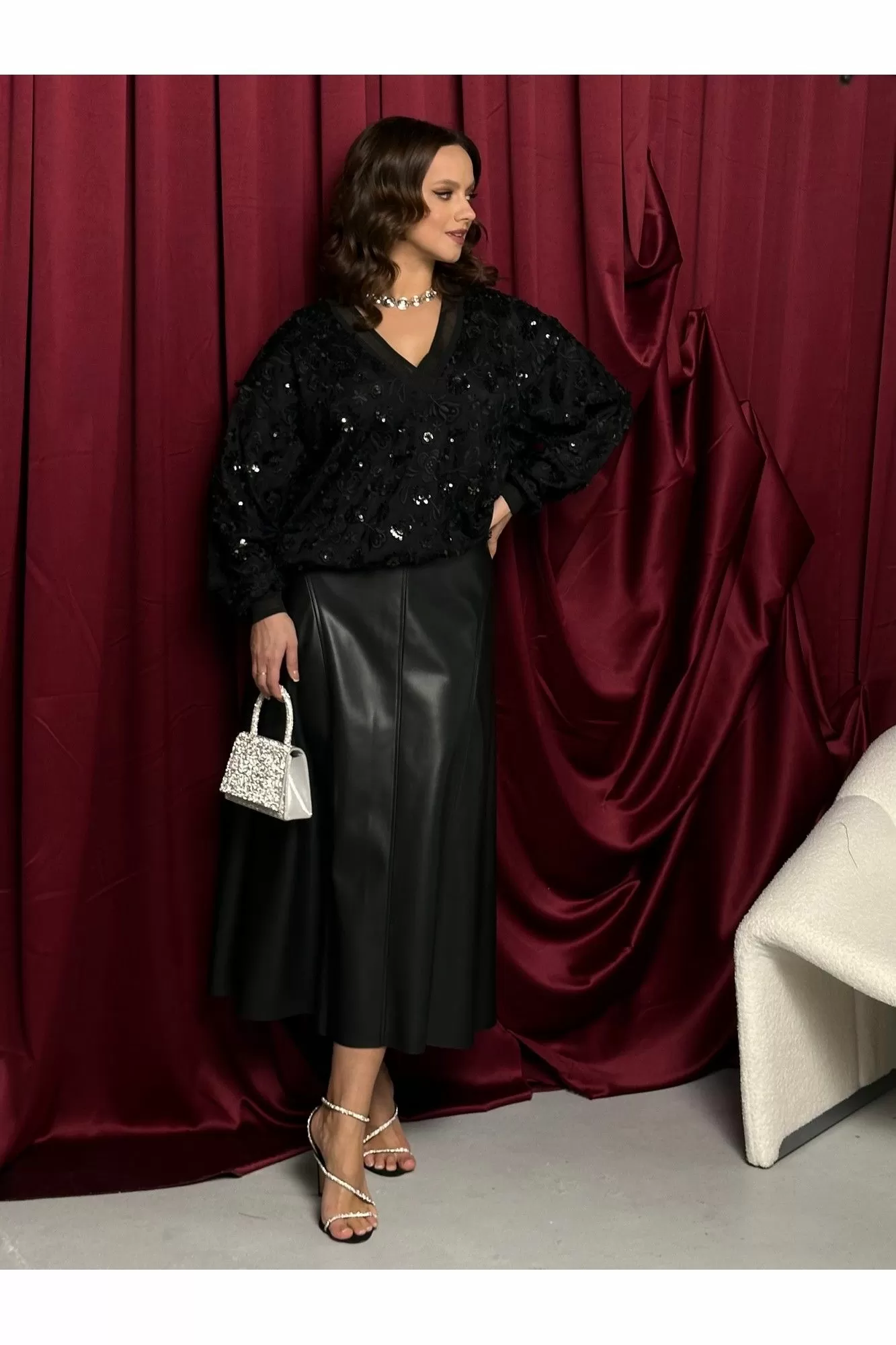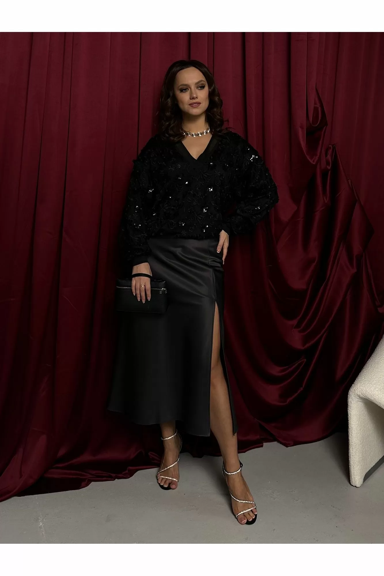 Низ изделия, рукава и горловина обработаны трикотажным довязом, что подчеркивает качество и внимание к деталям. Особенность этого джемпера — двойной слой: верхний из сетки с мерцающими пайетками, придающей образу праздничное настроение, и нижний — из роскошного сатина Армани, создающего эффект богатства и изысканности.
