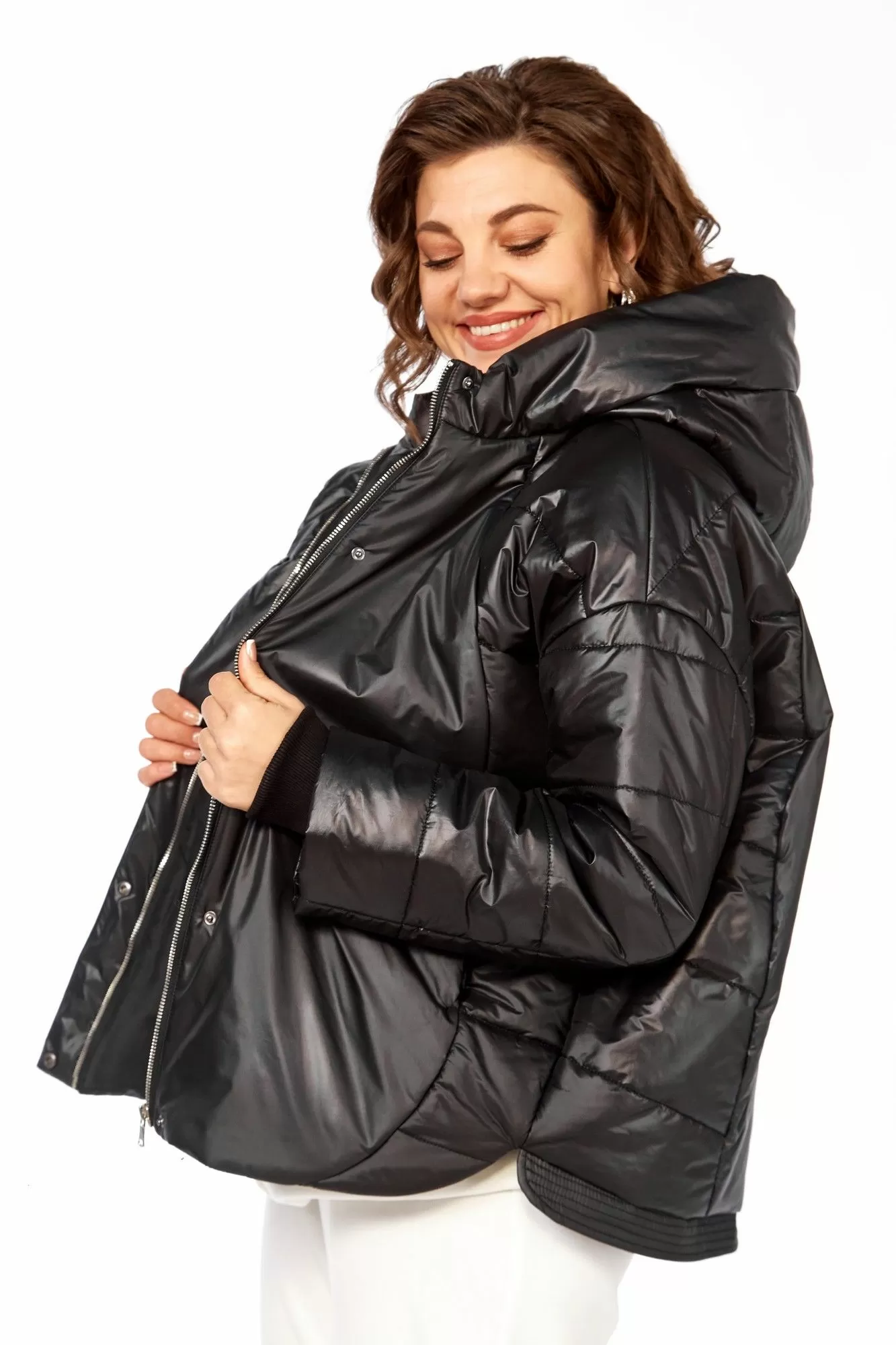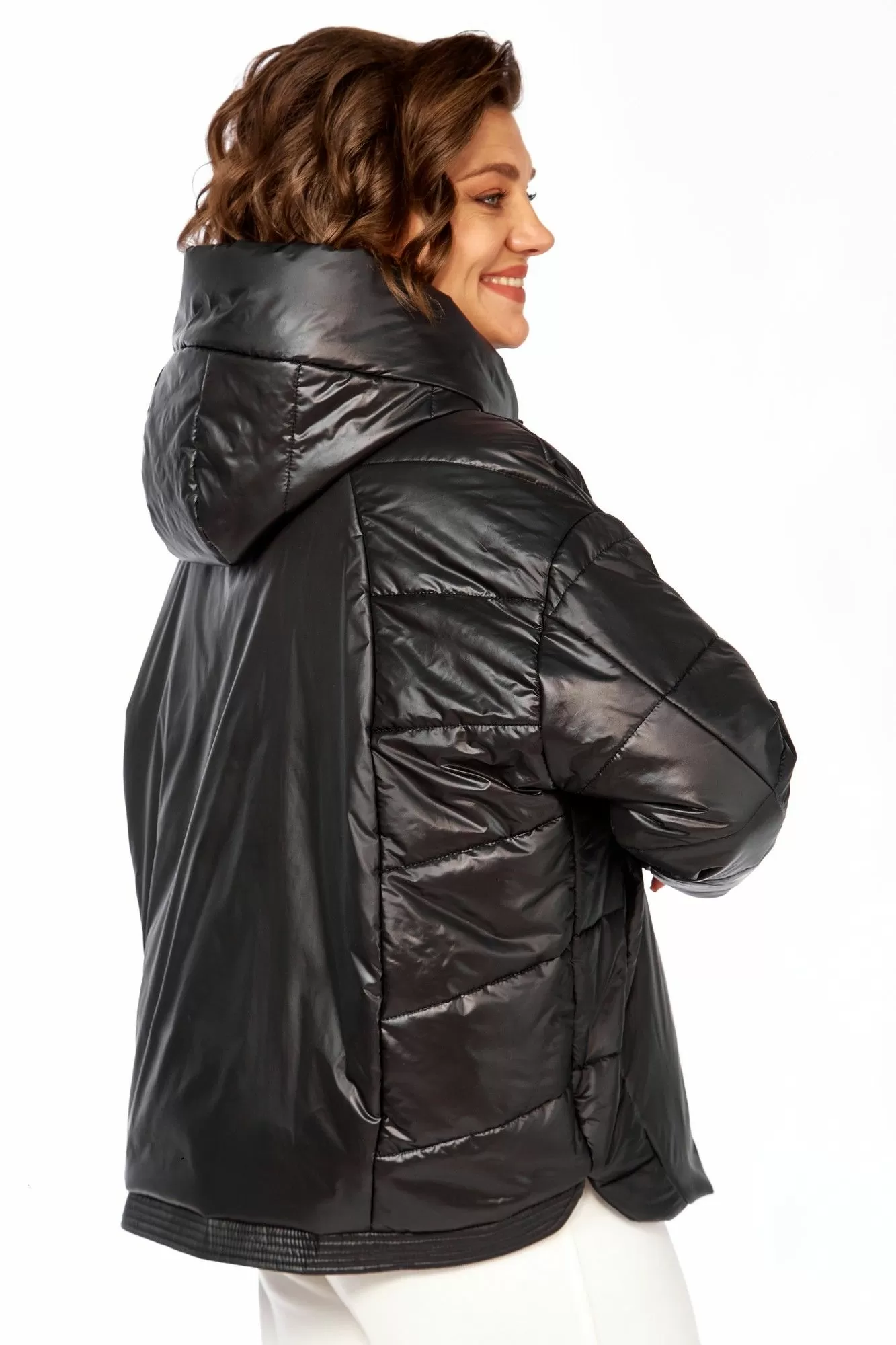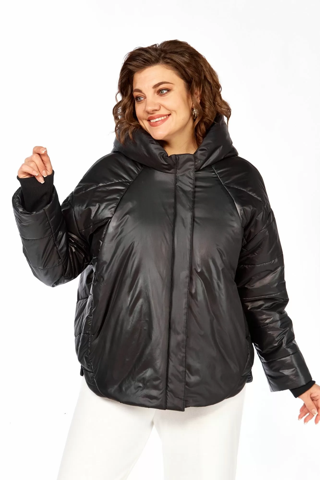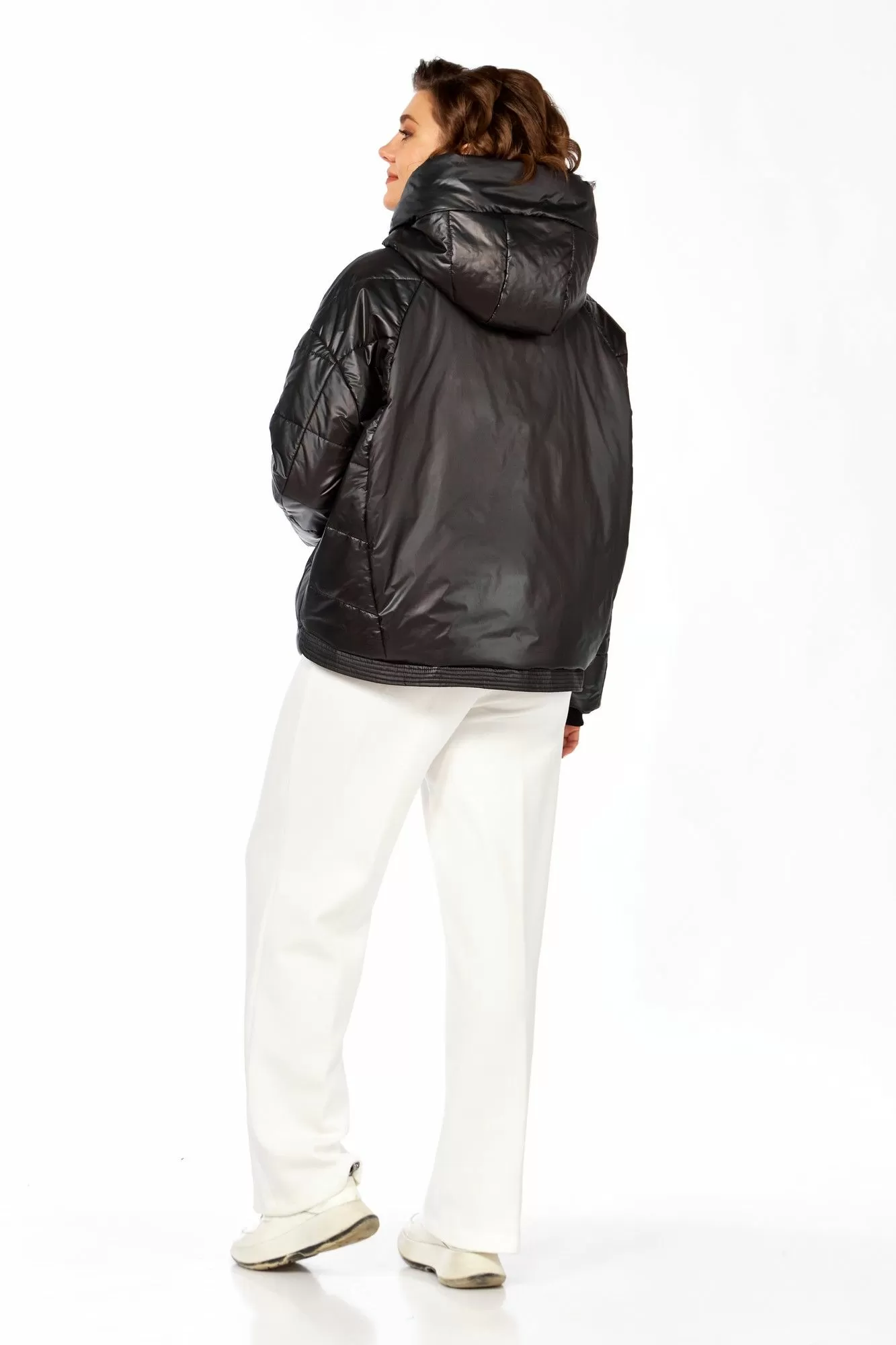 Куртка женская с центральной застежкой на тесьму-молнию и кнопки, спущенная линия плеча. По спинке рельефные швы от горловины до низа, по низу притачная отделочная планка. По переду рельефные швы от горловины до низа, в рельефных швах обработаны карманы. рукав втачной одношовный с манжетом по низу. Капюшон с центральной частью и отделочной деталью по отлету. Утеплитель синтепон 150 гр.