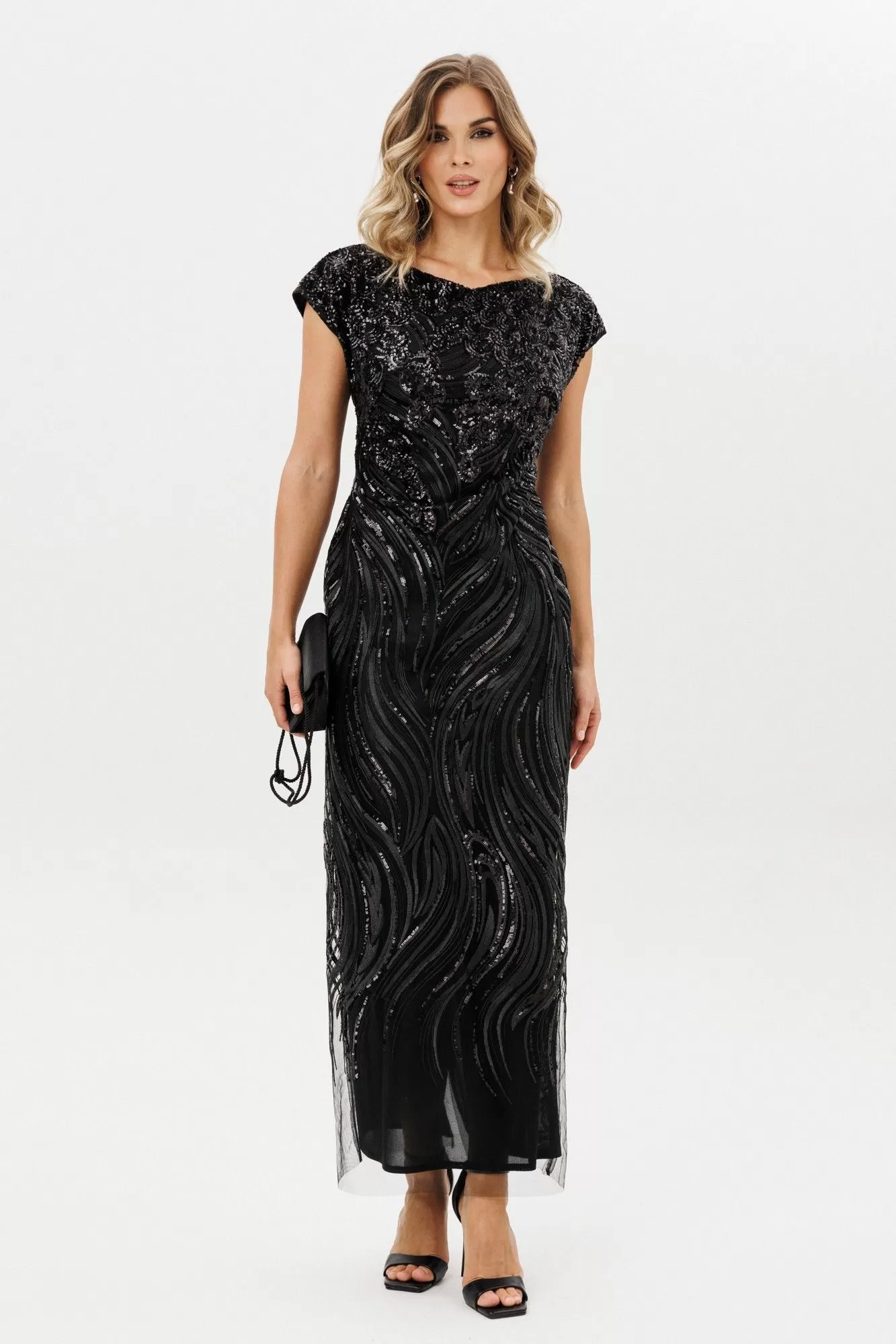 Платье выполнено из сетки с вышивкой с пайетками. В среднем шве спинки разрез и застежка на молнию с металлическими звеньями. Горловина и спинка выполнены в виде V-образной лодочки. Плечевой шов удлинен, образуя рукав цельнокроенного покроя. Платье на отлетной по низу подкладке.