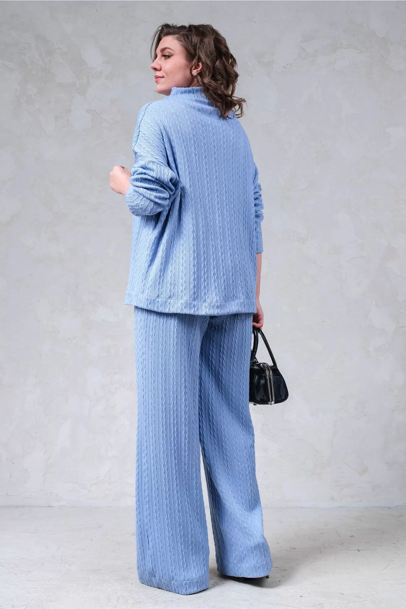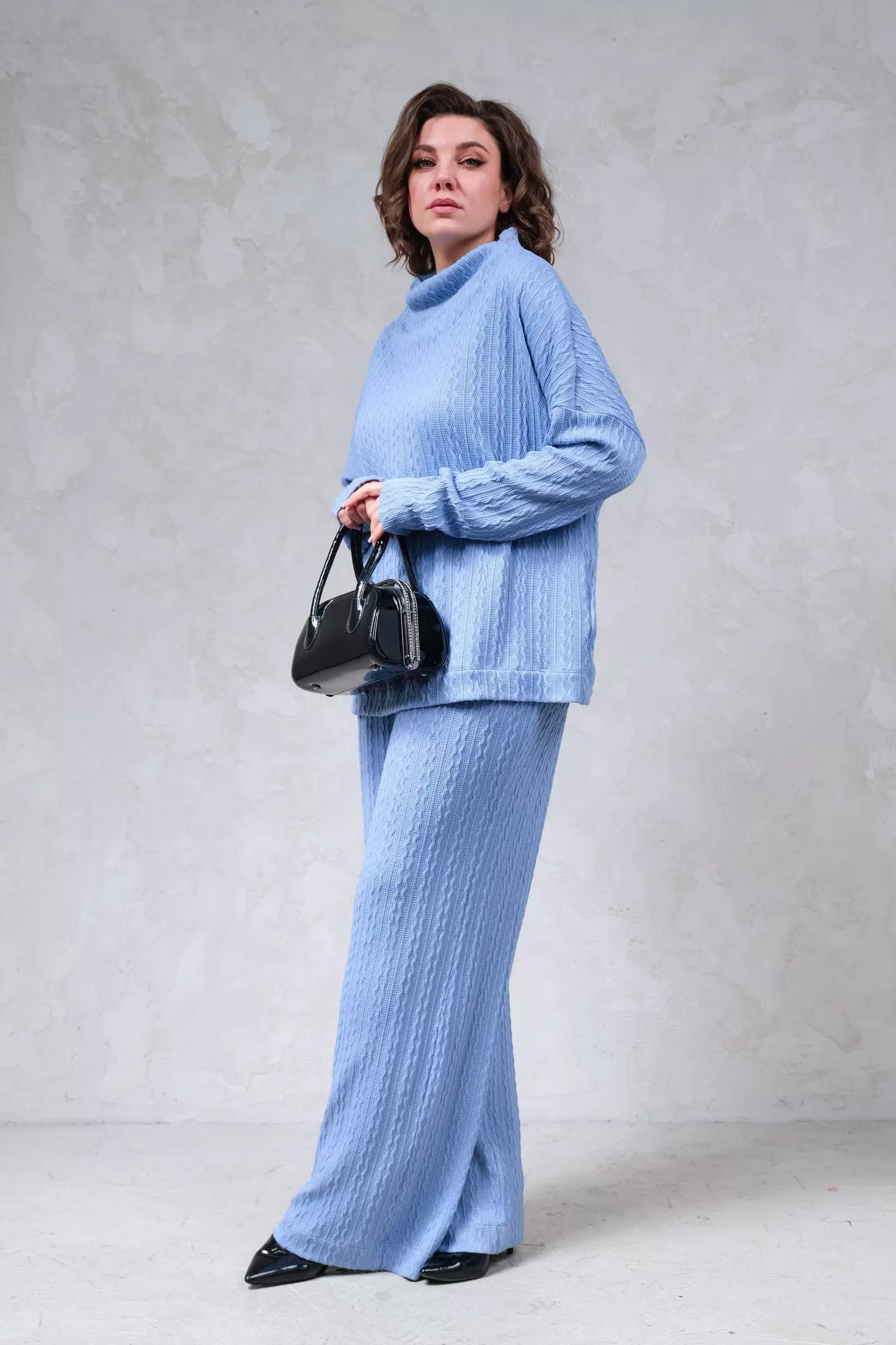 Компллект женский, состоящий из джемпера прямого силуэта. Воротник "хамутик" .Рубашечный рукав, зауженный к низу. Брюки на резинке, немного расклешенные к низу.