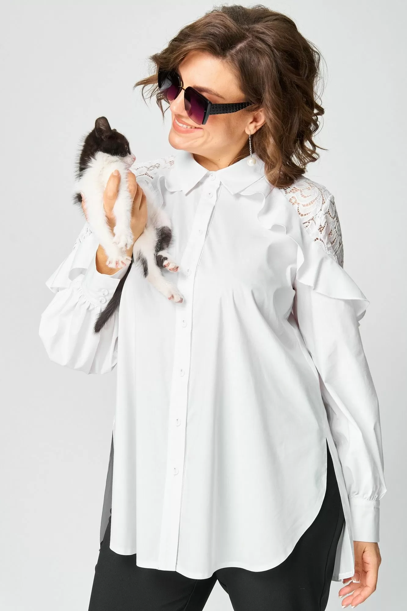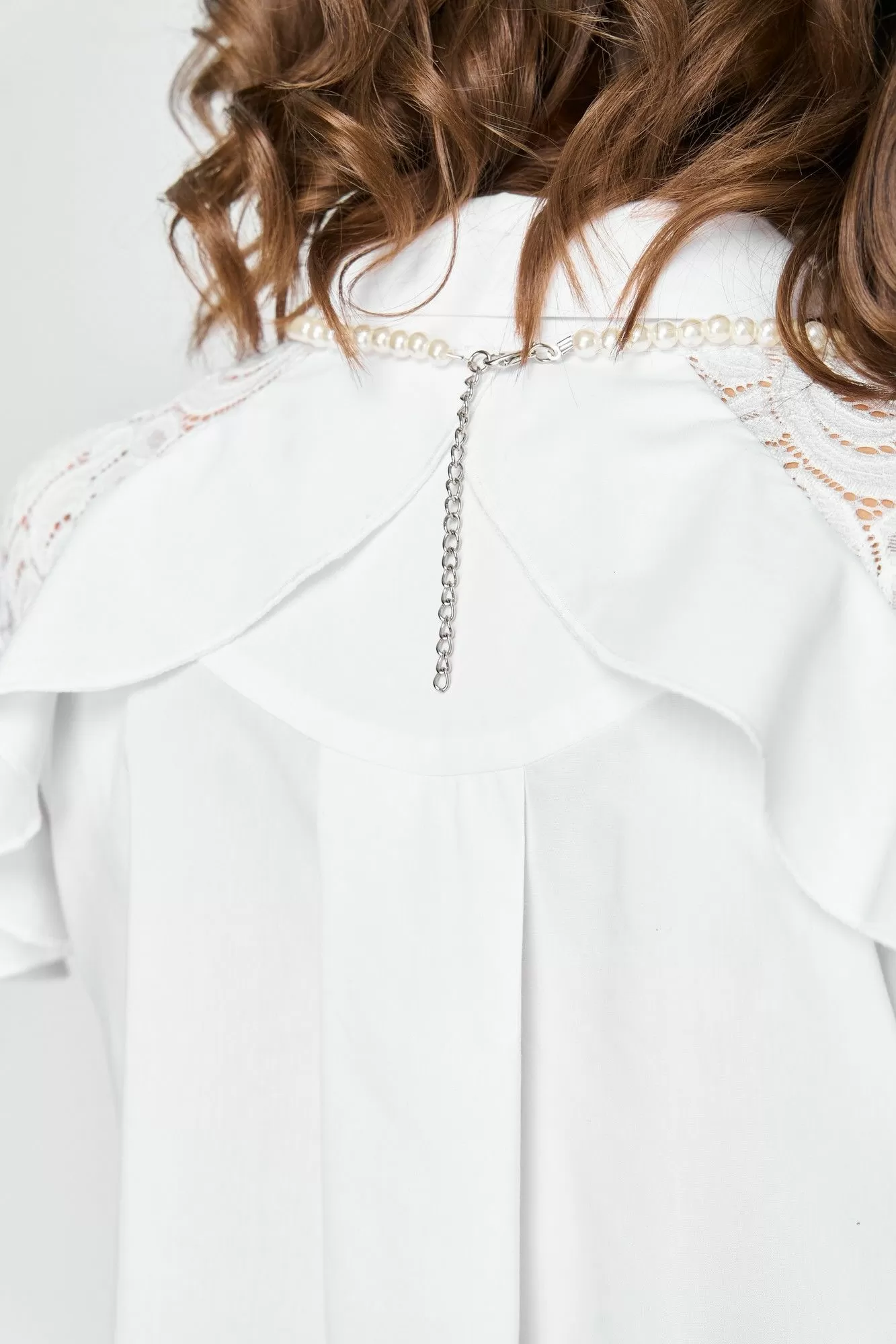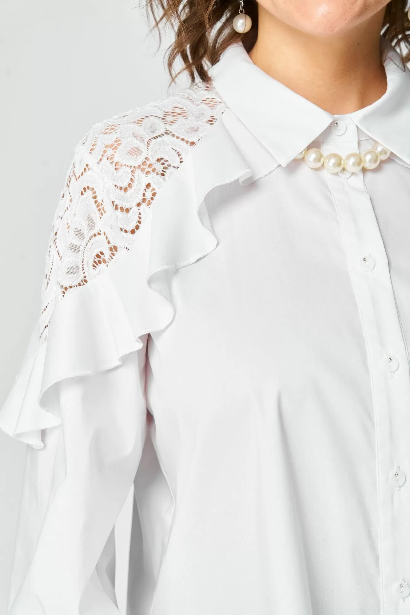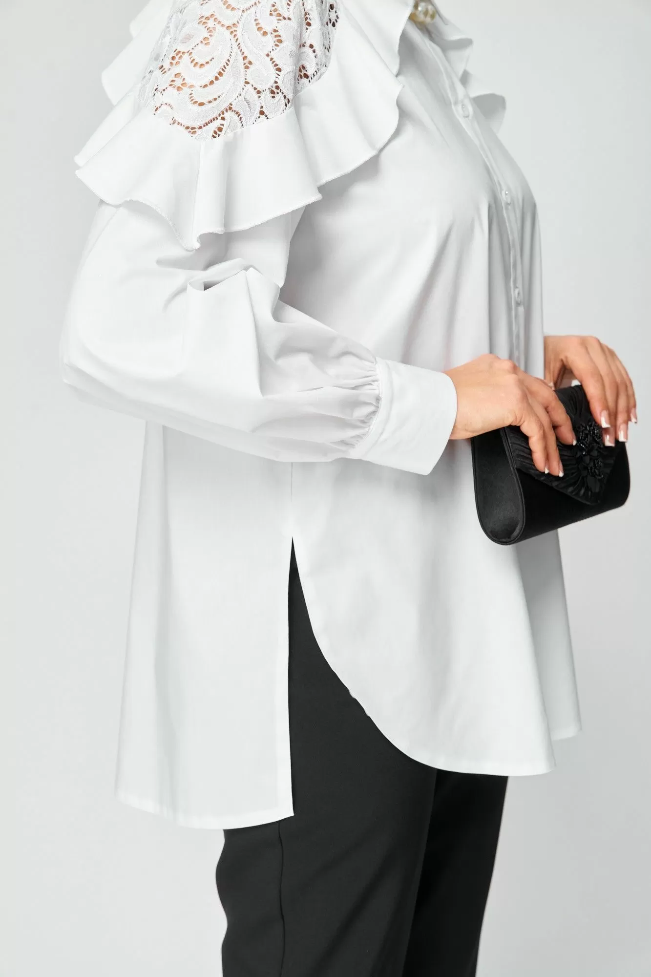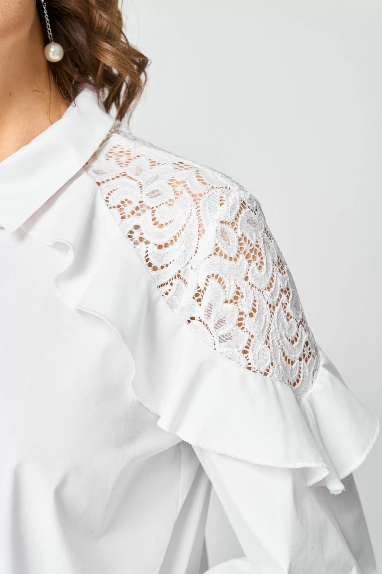 Блузка женская шикарная красивая нарядно-повседневная свободного силута выполнена их хлопка в сочетании с элегантным кружевом. Вырез горловины воротник на стойке рубашечного типа, рукав втачной с декоративным подрезом из кружева по низу на притачной манжете. Застежка до верху на обметанные петли и пуговицы. Низ блузы фигурный, в боковых швах обработан разрезы.