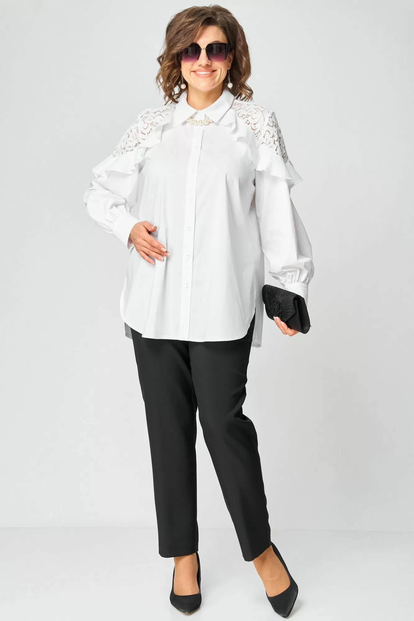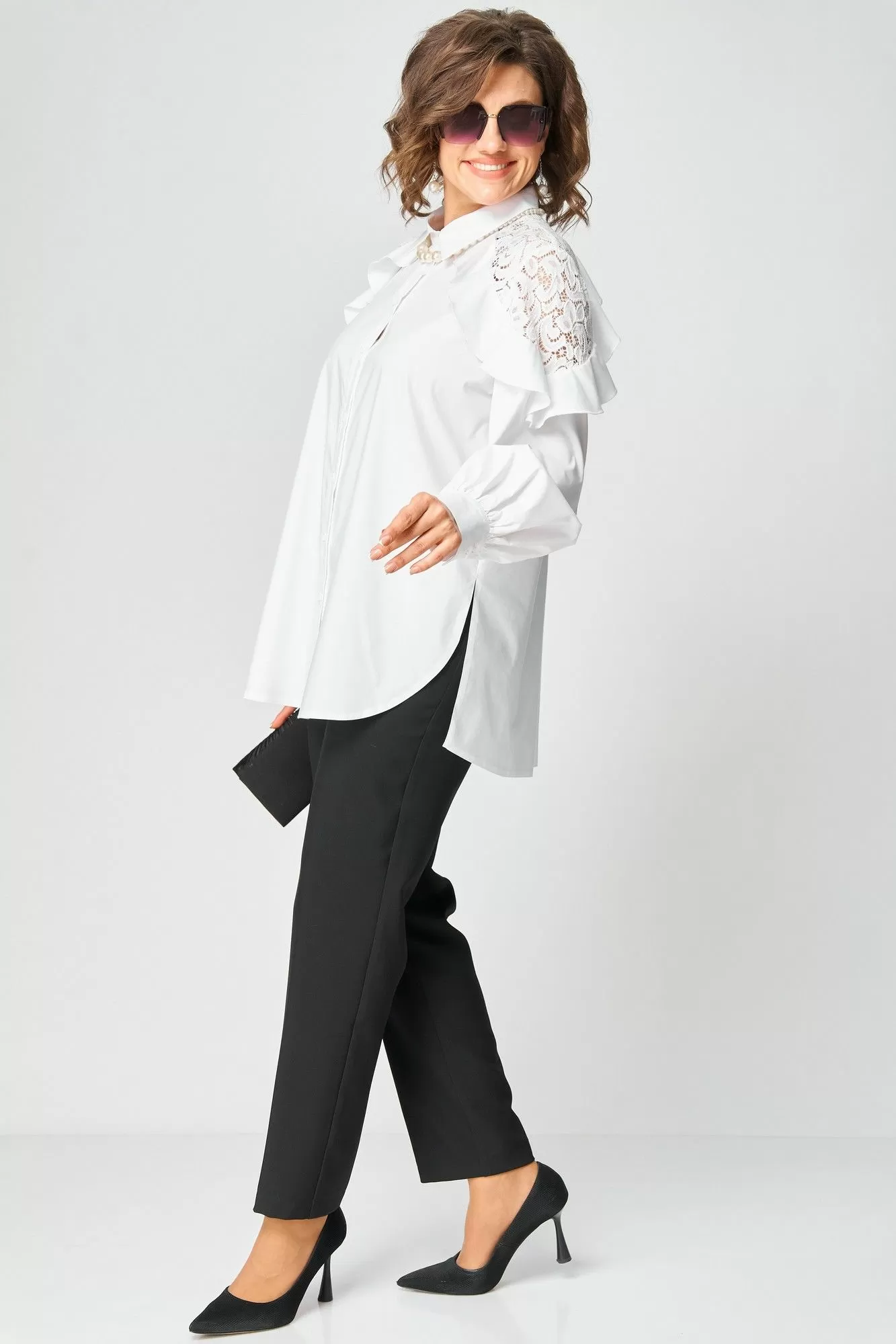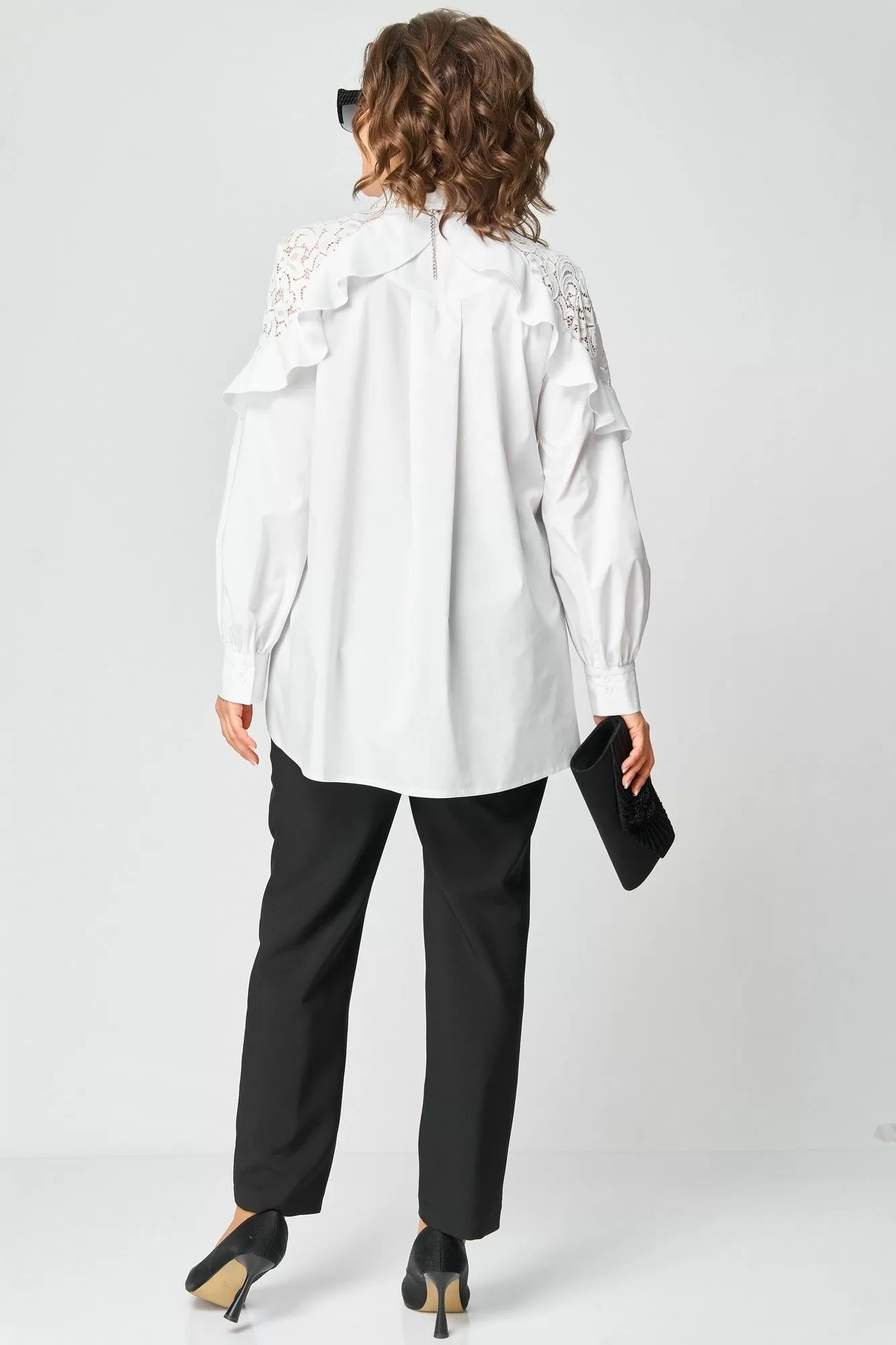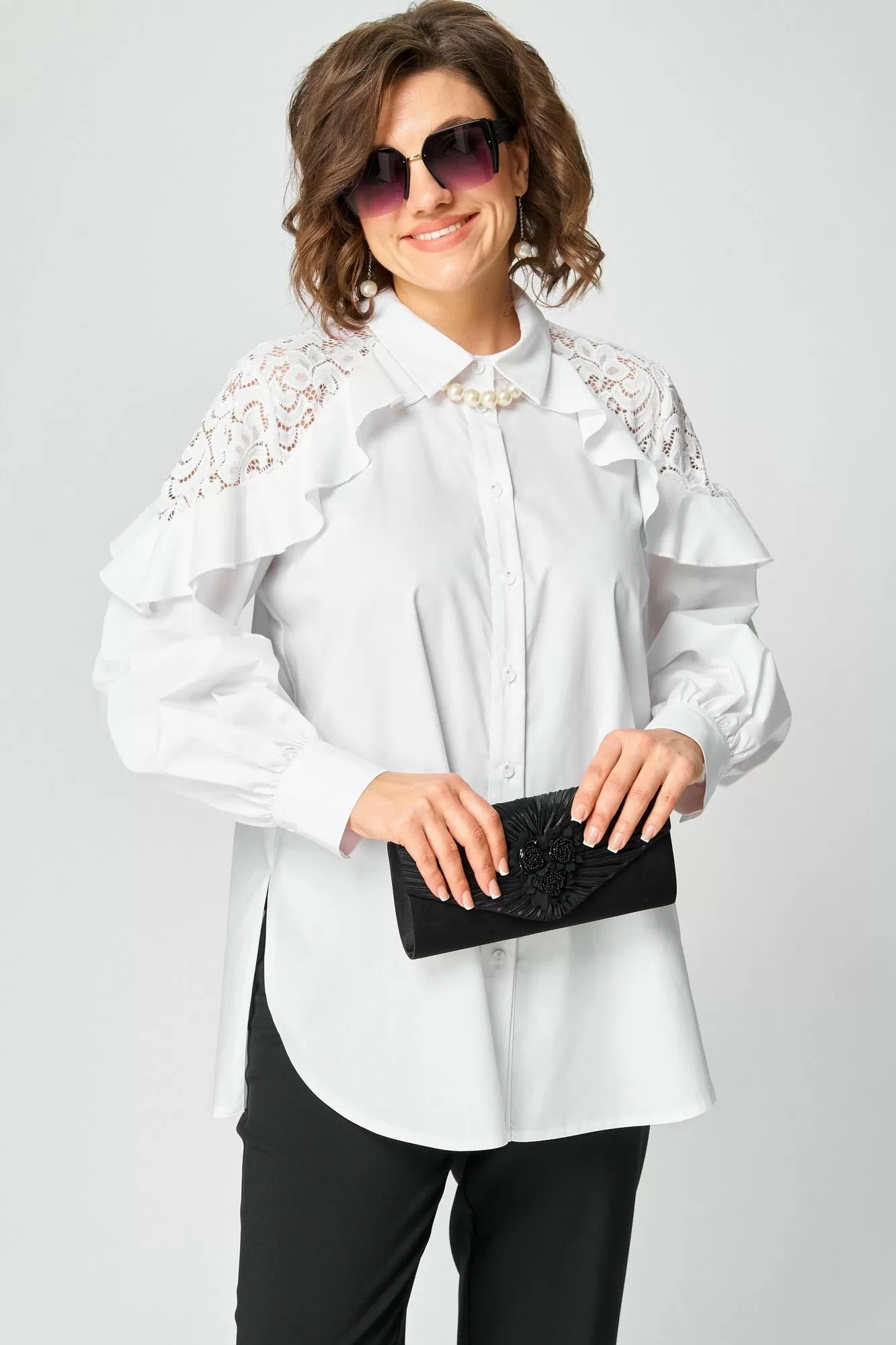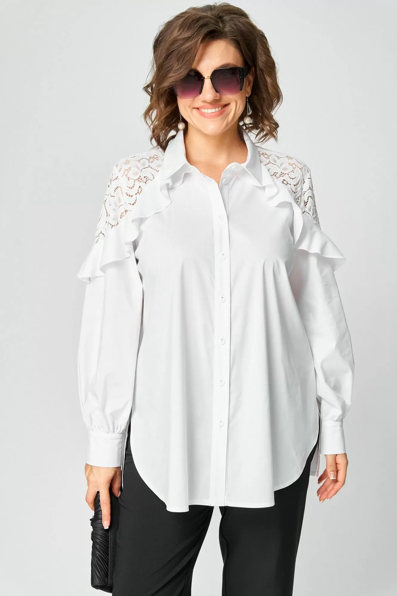 Блузка женская шикарная красивая нарядно-повседневная свободного силута выполнена их хлопка в сочетании с элегантным кружевом. Вырез горловины воротник на стойке рубашечного типа, рукав втачной с декоративным подрезом из кружева по низу на притачной манжете. Застежка до верху на обметанные петли и пуговицы. Низ блузы фигурный, в боковых швах обработан разрезы.
