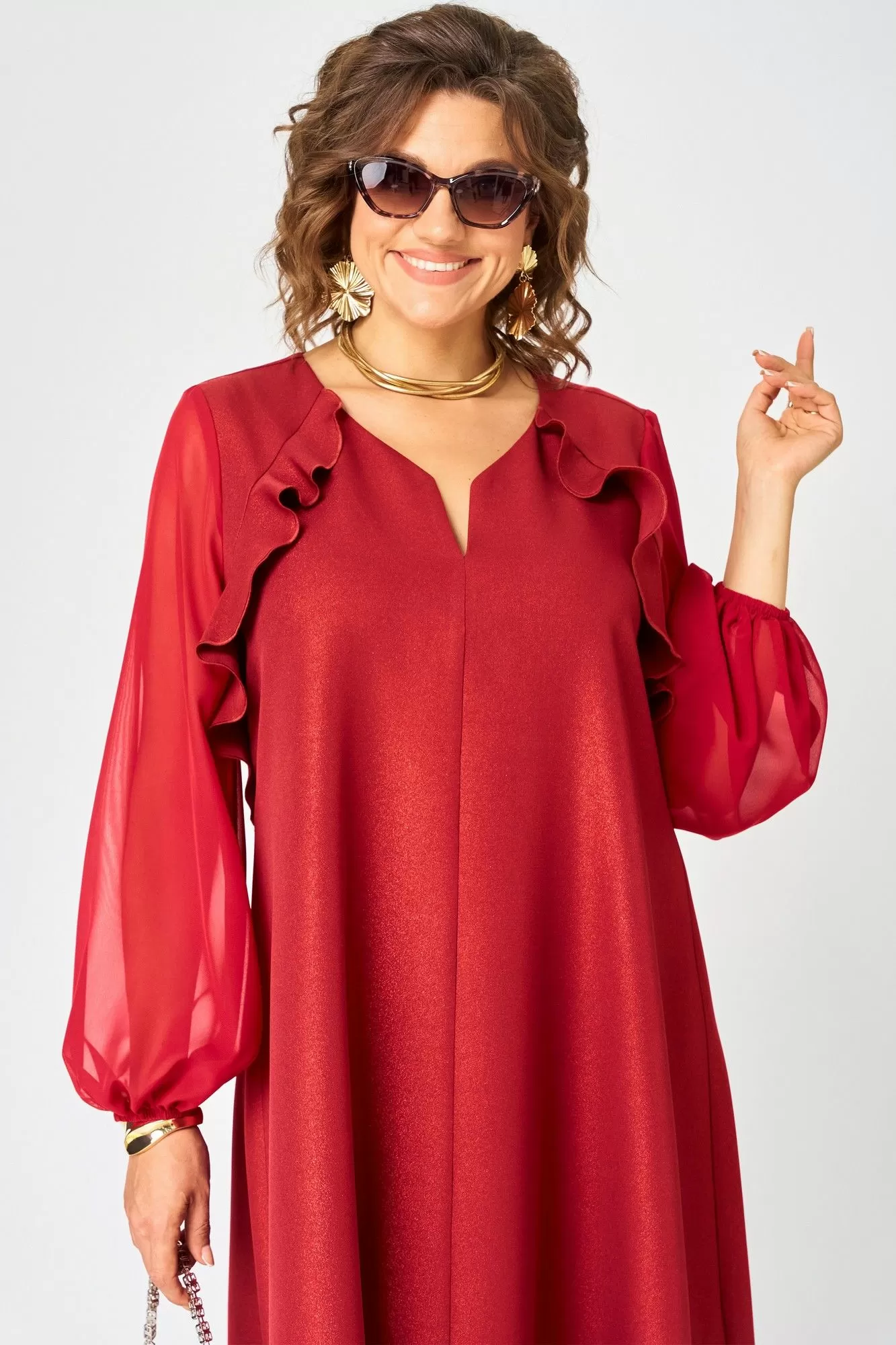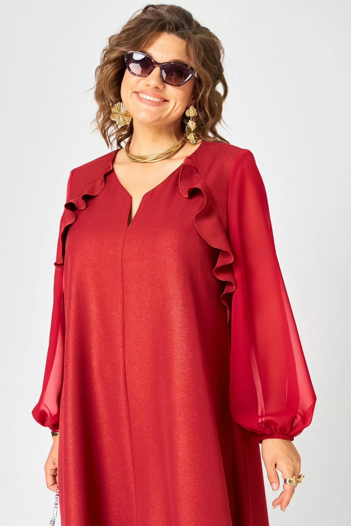 Платье красивое нарядное женское шикарное А-образного силуэта расширенное к низу выполнено из плательной ткани пропитанной блестками (не осыпаются) в сочетании с шифоном. Вырез горловины фигурный на обтачке, рукав втачной из шифона по низу на резинке. По полочке кокетки с притачным воланом входящим в боковой шов. В боковых швах обработаны небольшие разрезы.