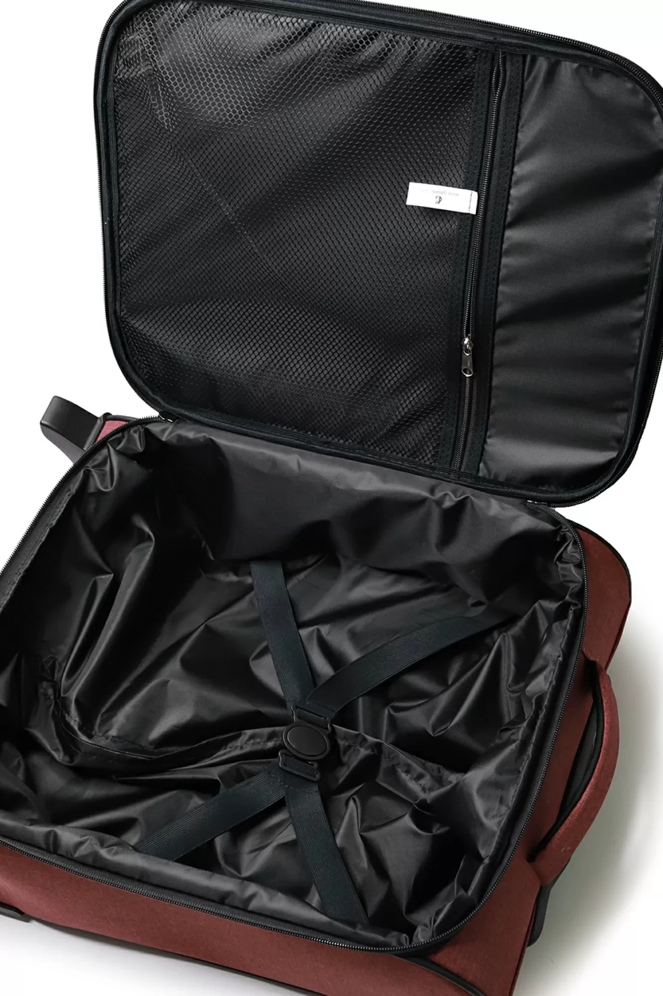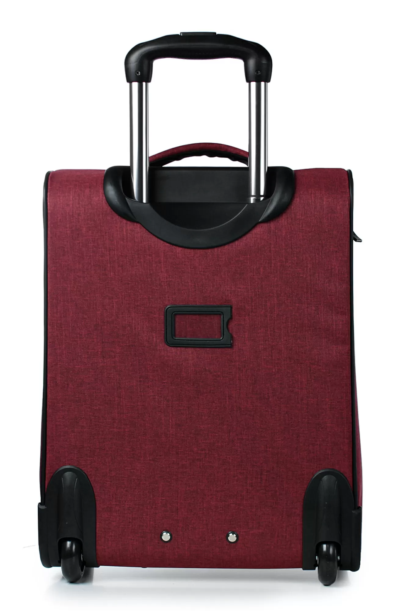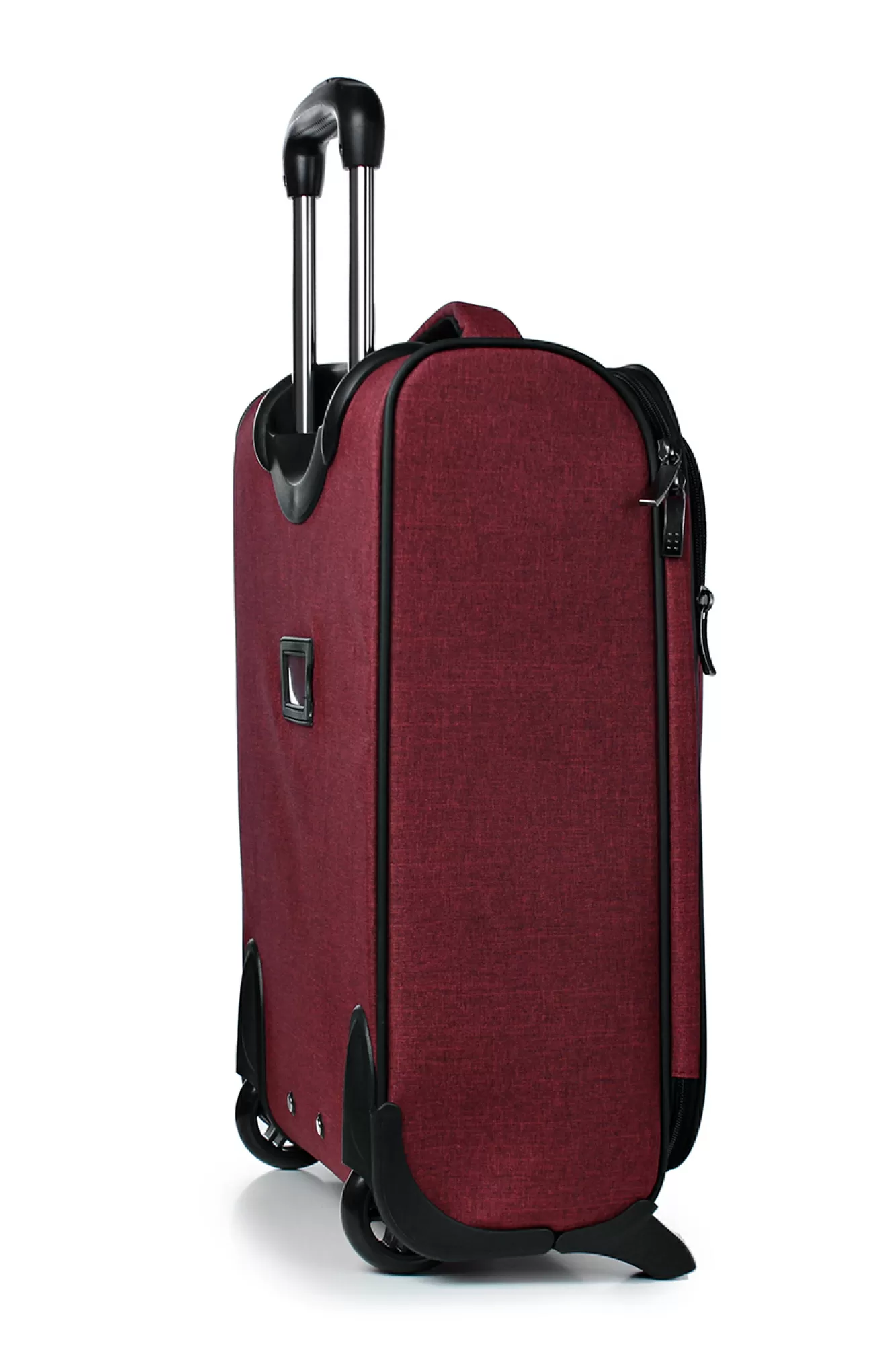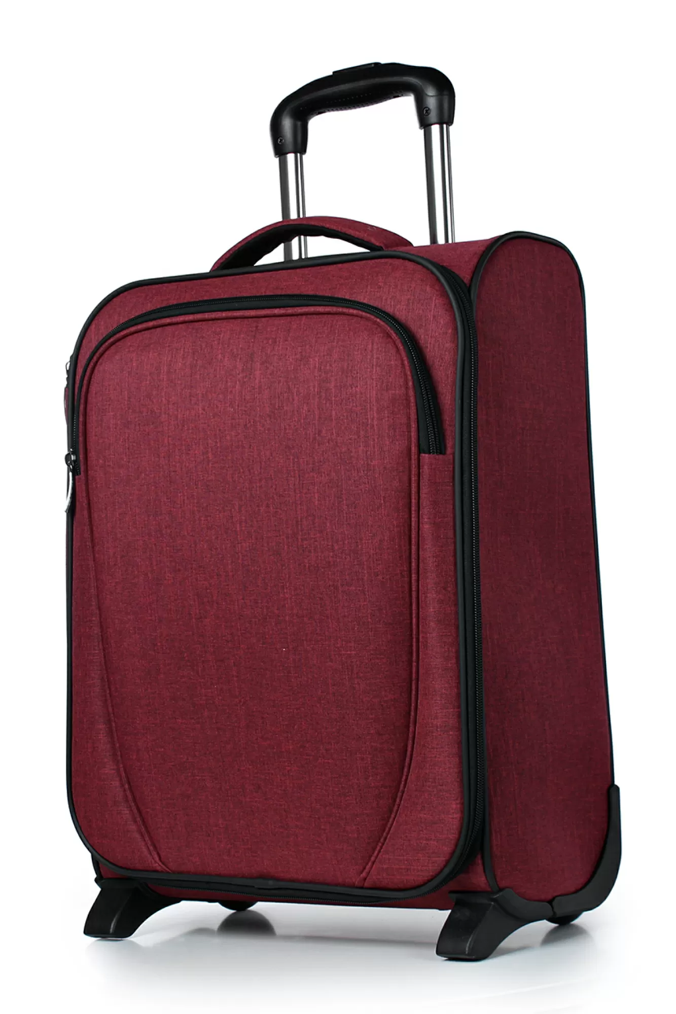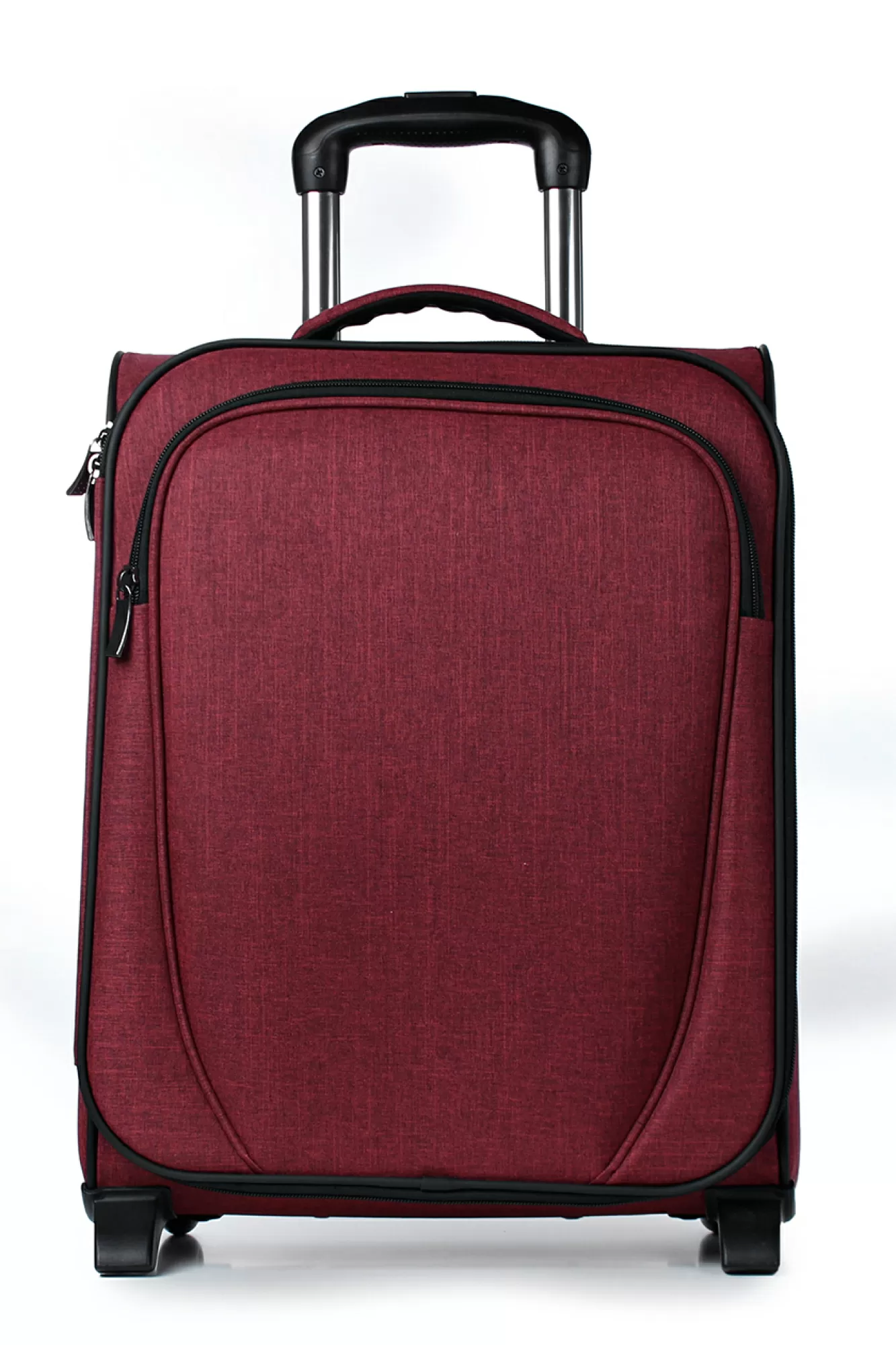 Чемодан закрывается на застежку-молнию, с одной короткой ручкой, на передней стенке объемный карман, закрывающийся на застежку-молнию, с биркой на задней стенке,с пуклями на дне, на колесах и на тележке, с прокладкой кедера. Размеры: 355x485x195