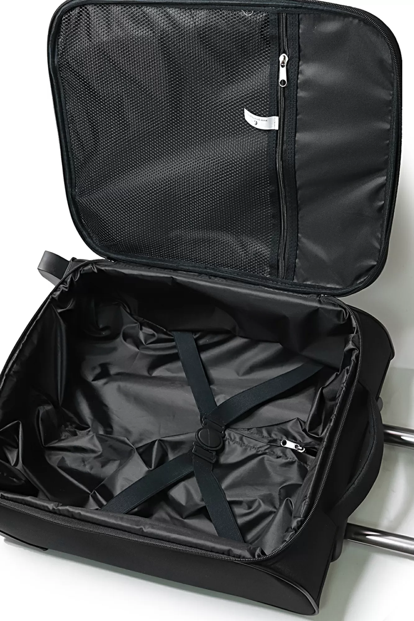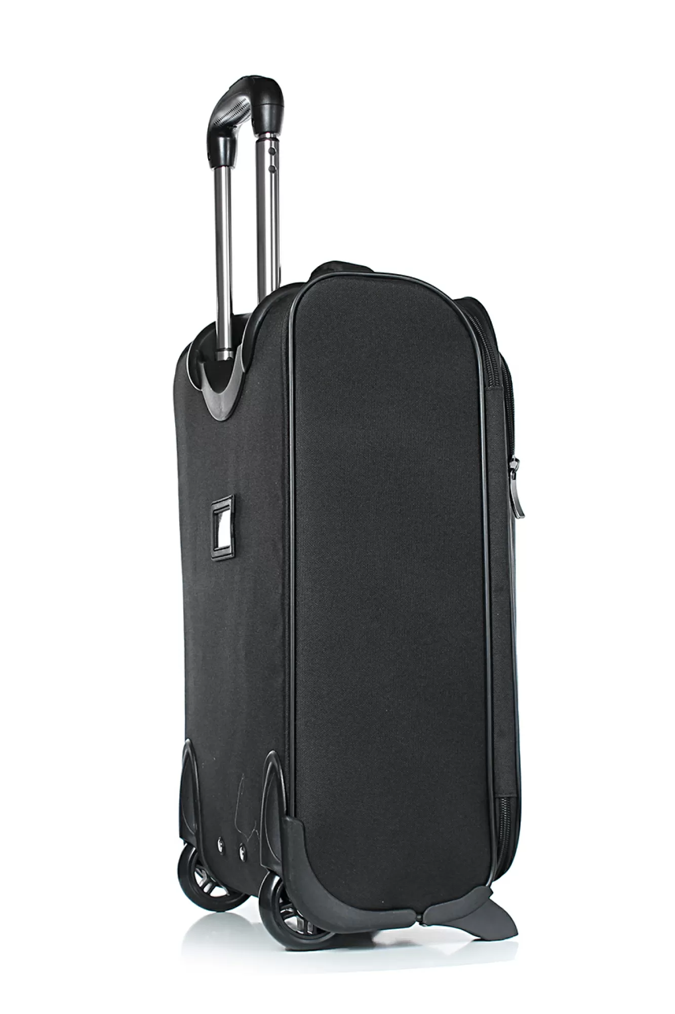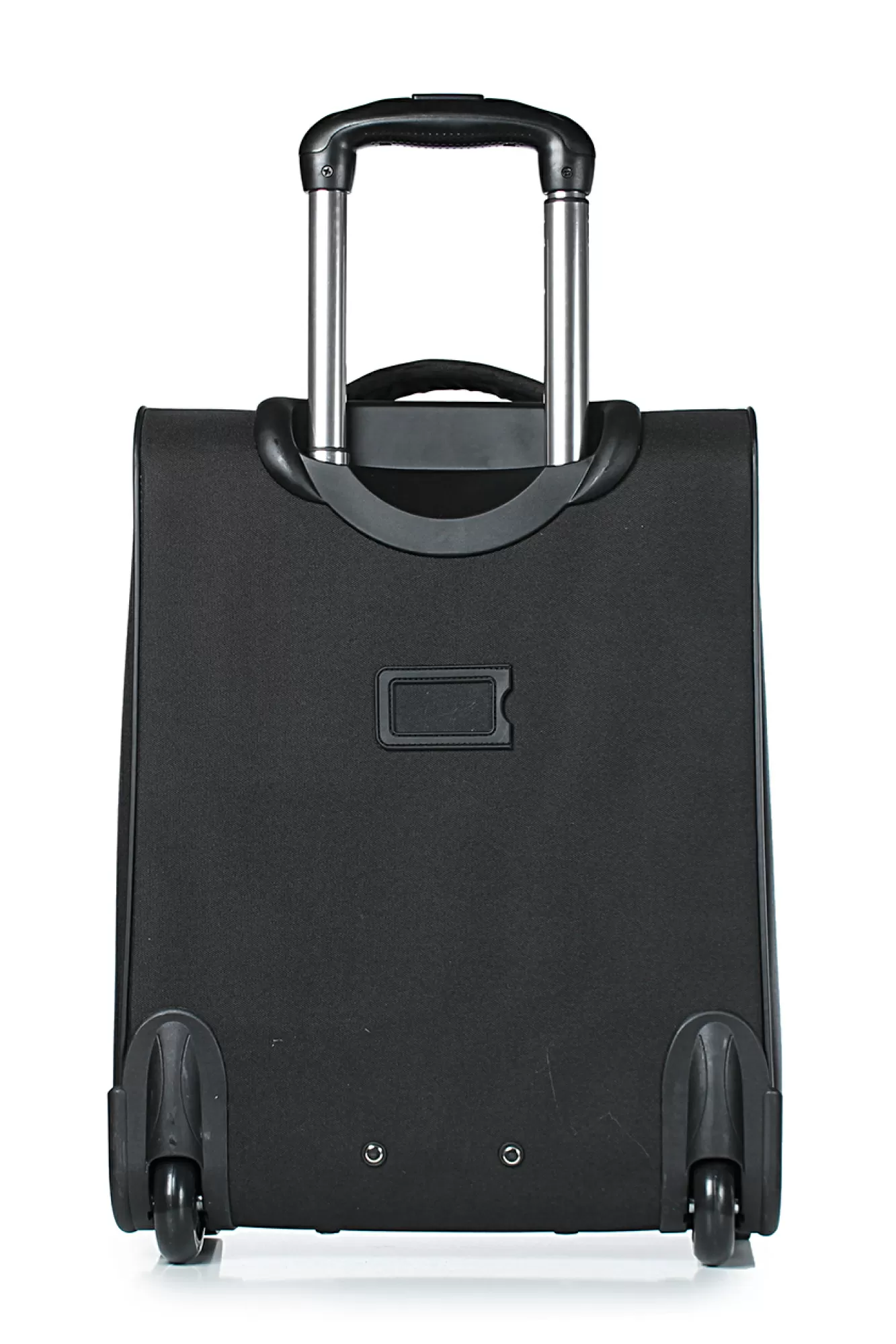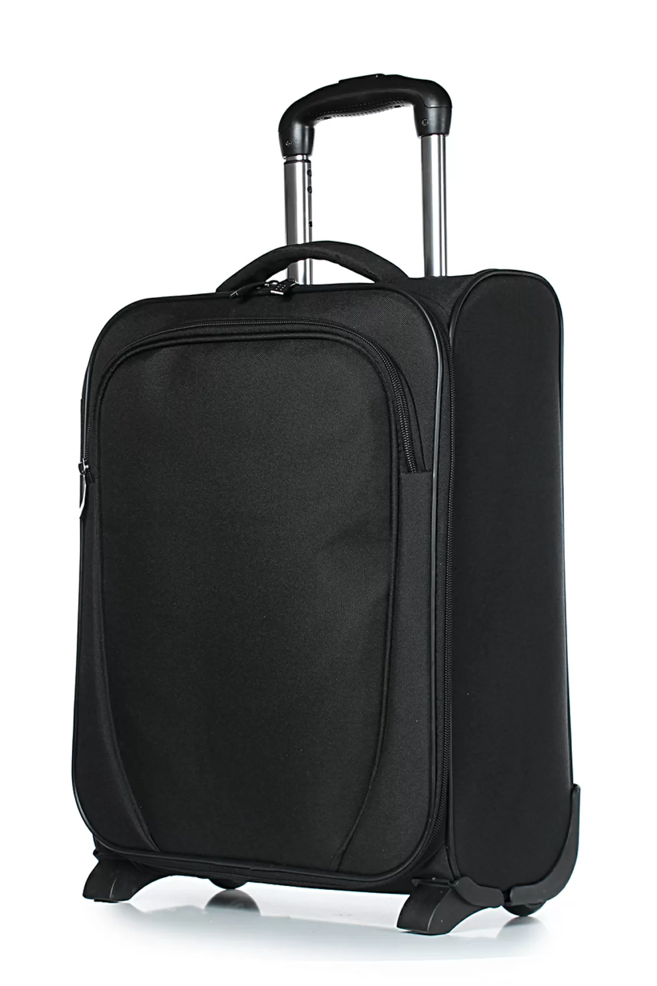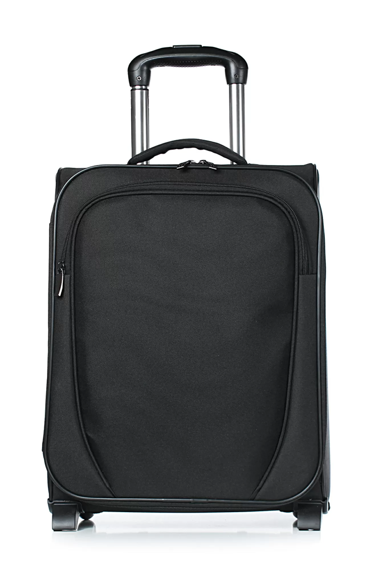 Чемодан закрывается на застежку-молнию, с одной короткой ручкой, на передней стенке объемный карман, закрывающийся на застежку-молнию, с биркой на задней стенке,с пуклями на дне, на колесах и на тележке, с прокладкой кедера. Размеры: 355x485x195